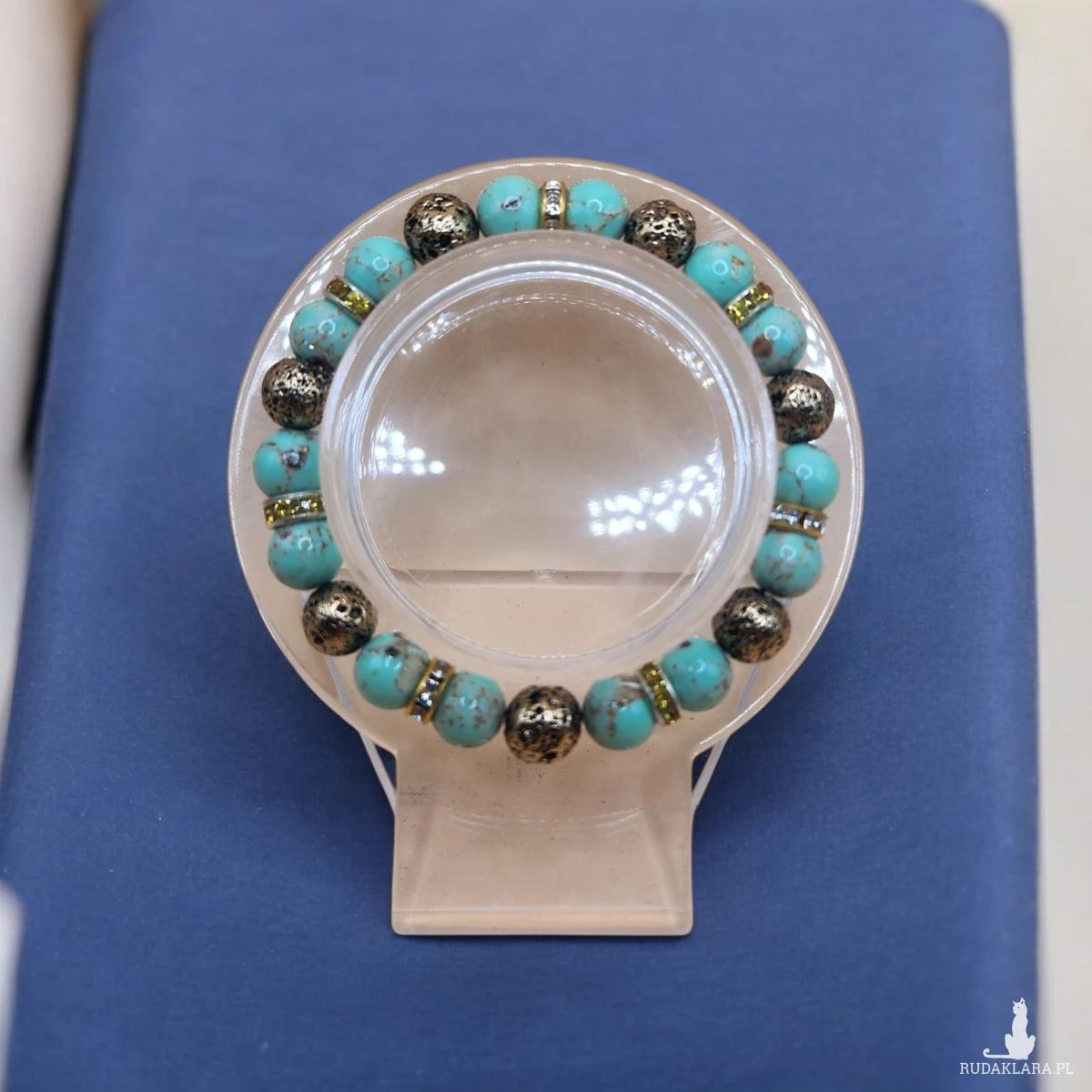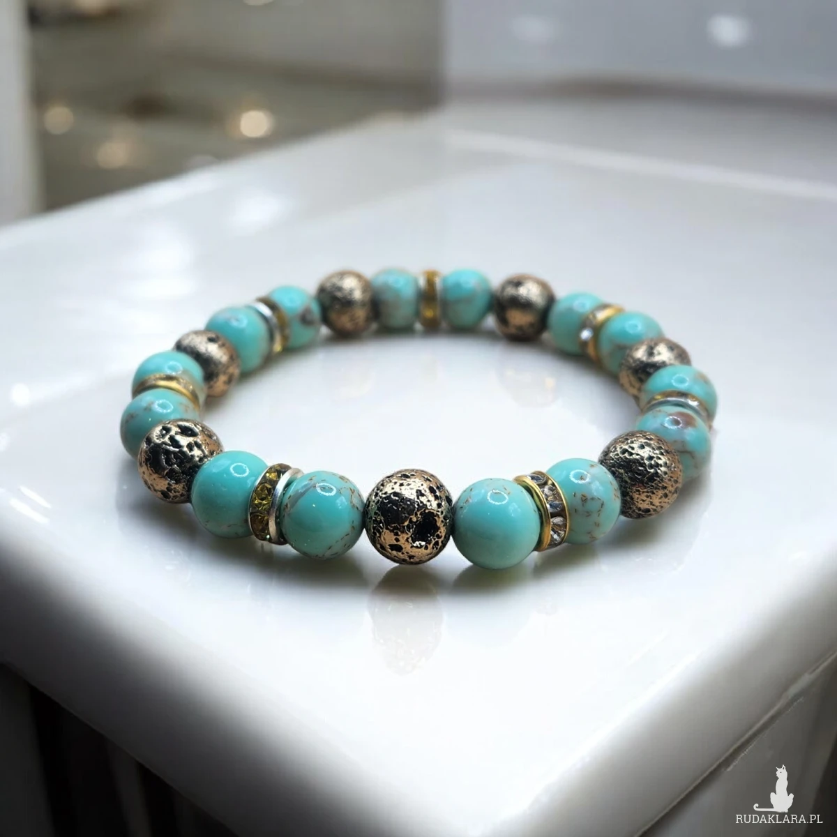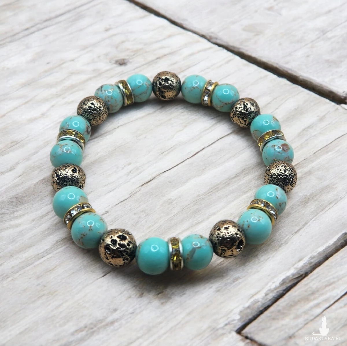 Stylowa, ręcznie wykonana bransoletka z koralików w pięknym turkusowym kolorze, przełamana ozdobnymi kulkami o fakturze postarzanego złota oraz eleganckimi przekładkami z połyskującymi kryształkami. Idealne połączenie boho i elegancji ✨