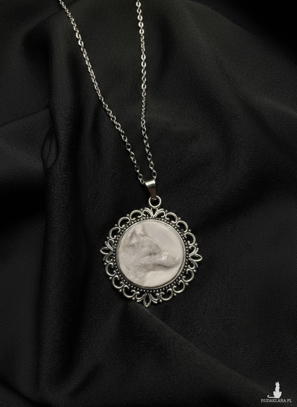 Wyjątkowy naszyjnik z okrągłym medalionem z rzeźbionym srebrnym lisem wykonanym z masy polimerowej , zabezpieczonym warstwą żywicy epoksydowej, która nadaje mu trwałość i subtelny połysk. Delikatny, marmurkowy wzór sprawia, że każdy egzemplarz jest niepowtarzalny.