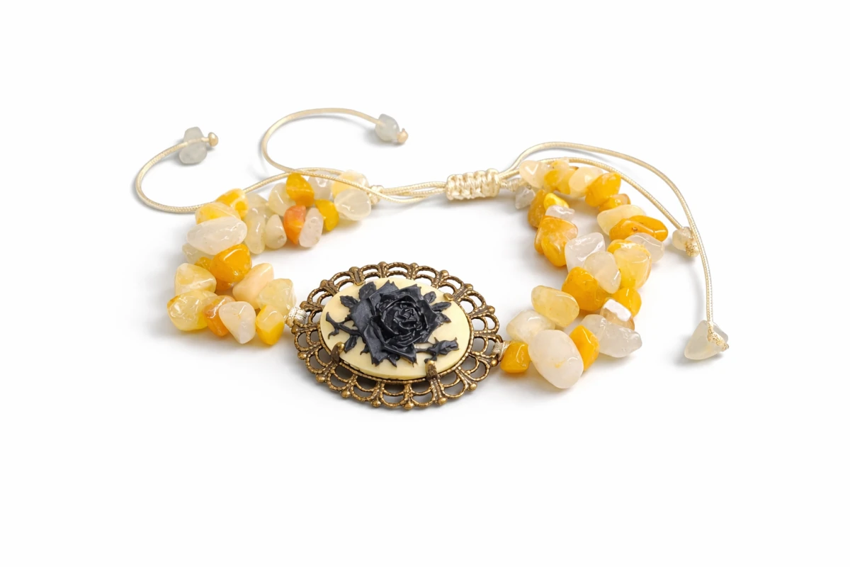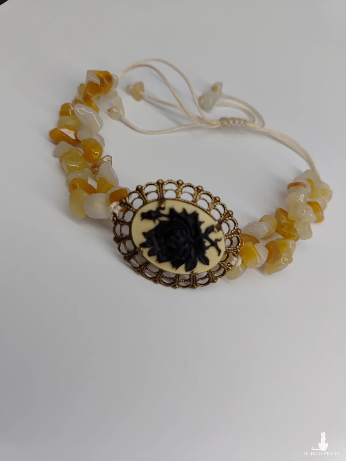Klasyczna camea w połaczeniu ze sznurkiem. Czarna róża na kremowym tle w