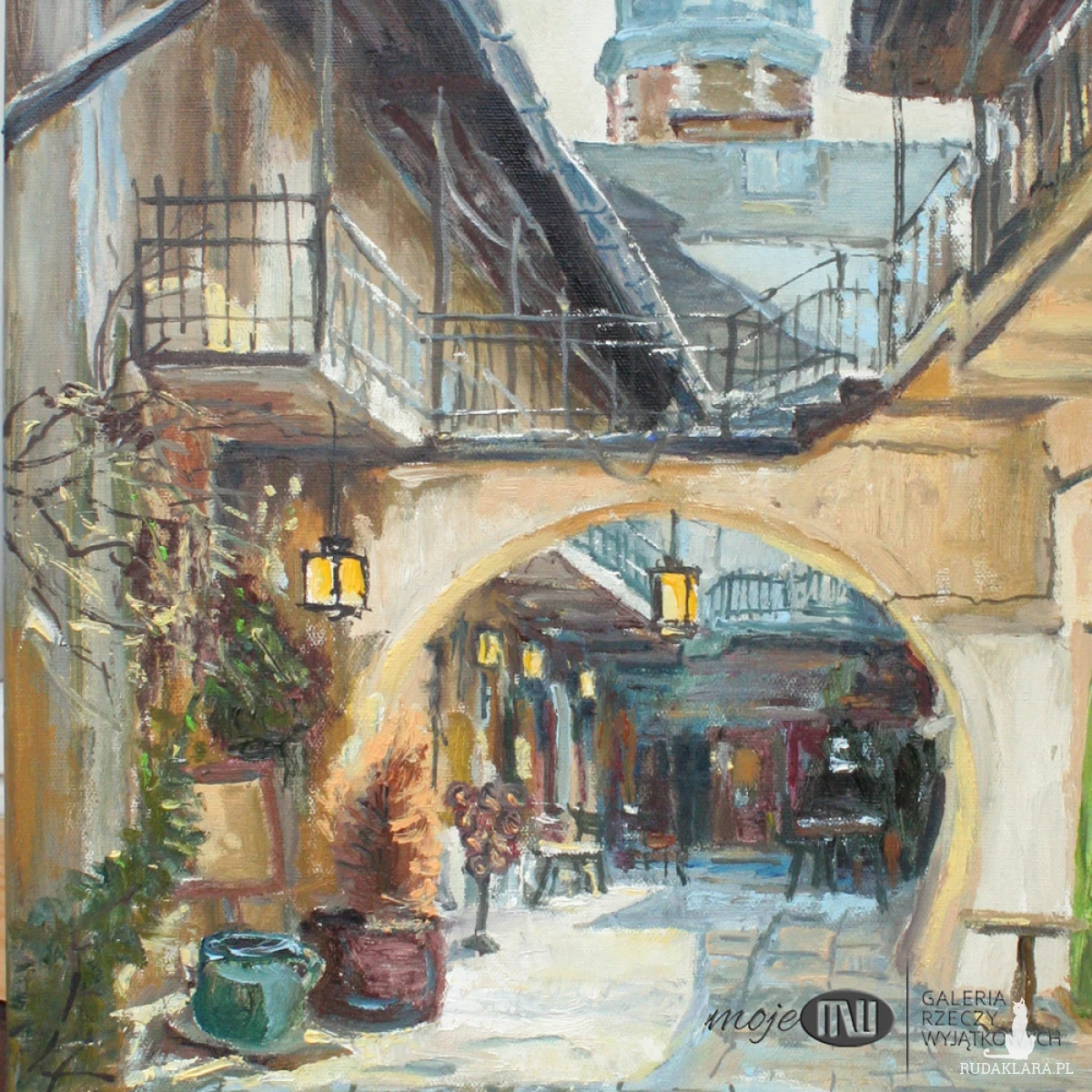 Obraz olejny malowany na płótnie, utrzymany w zawężonej palecie barw, z wyraźną dominantą ciepłych odcieni beżu i ciemnego brązu oraz dopełnieniem bieli i szarych błękitów.