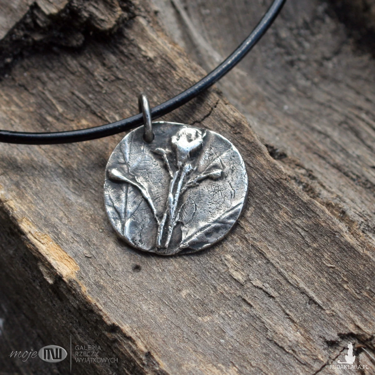 Niewielki wisiorek z ręcznie formowanego srebra z realistycznym wizerunkiem polnej roślinki. Zawieszony jest na czarnym skórzanym rzemyku o gr. 2 mm. Zakończenia rzemienia i zapięcie są ze stali chirurgicznej.