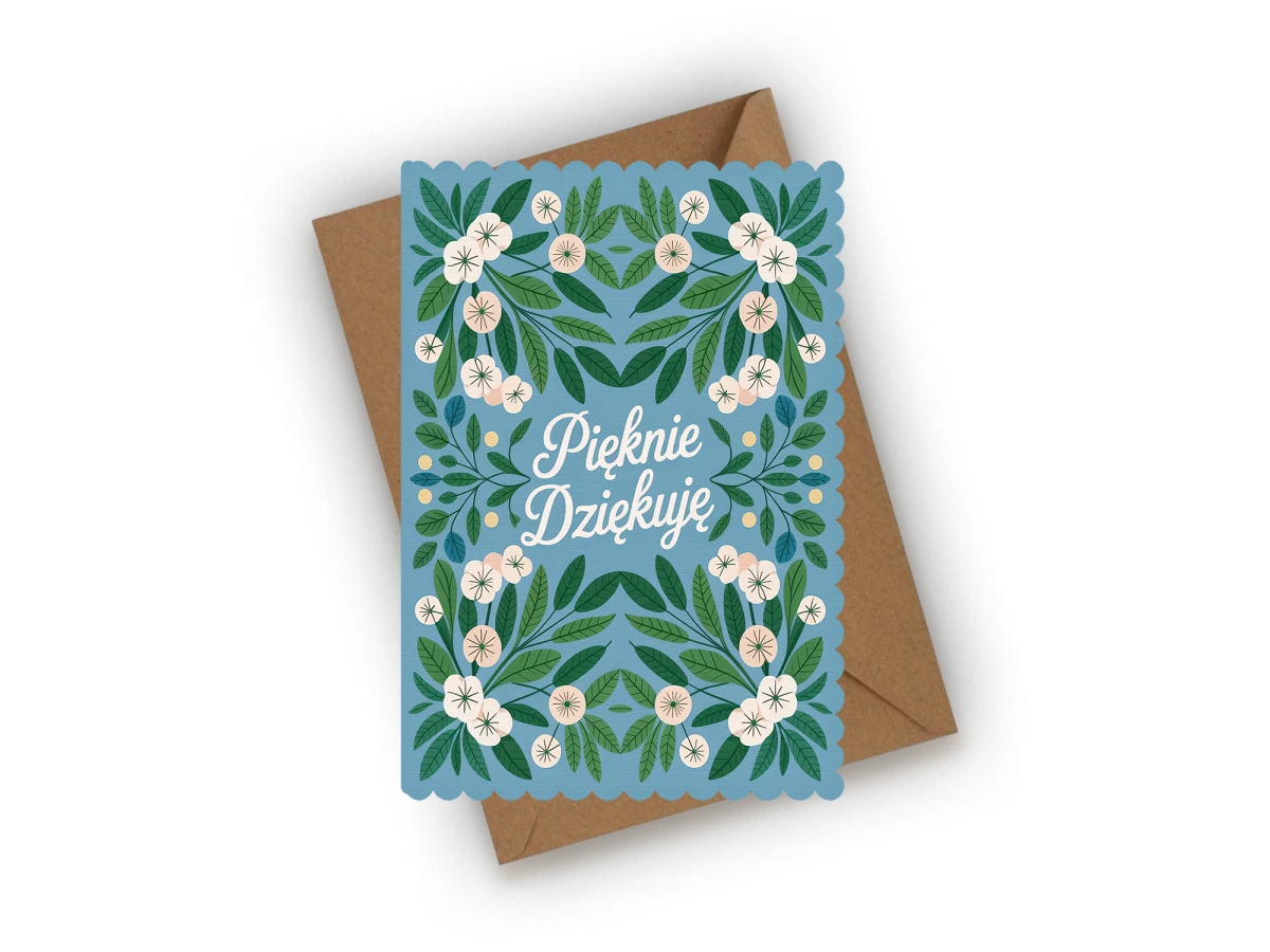 Kartka wydrukowana i wycięta w Polsce na starannie wybranym ekologicznym papierze o delikatnej fakturze (gramatura 300), kartka ma rozmiar ok. 12x17 cm (po złożeniu) i towarzyszy jej ekologiczna koperta w rozmiarze B6.