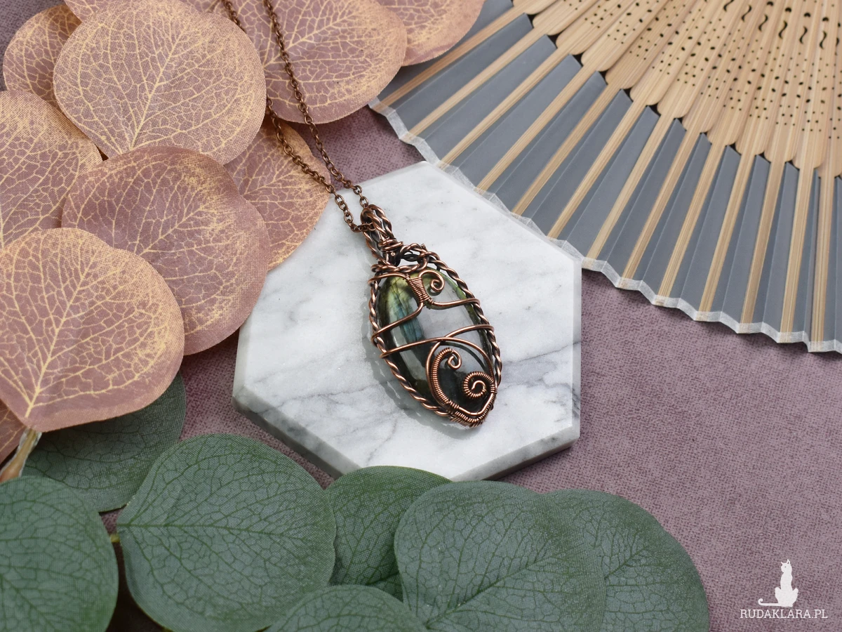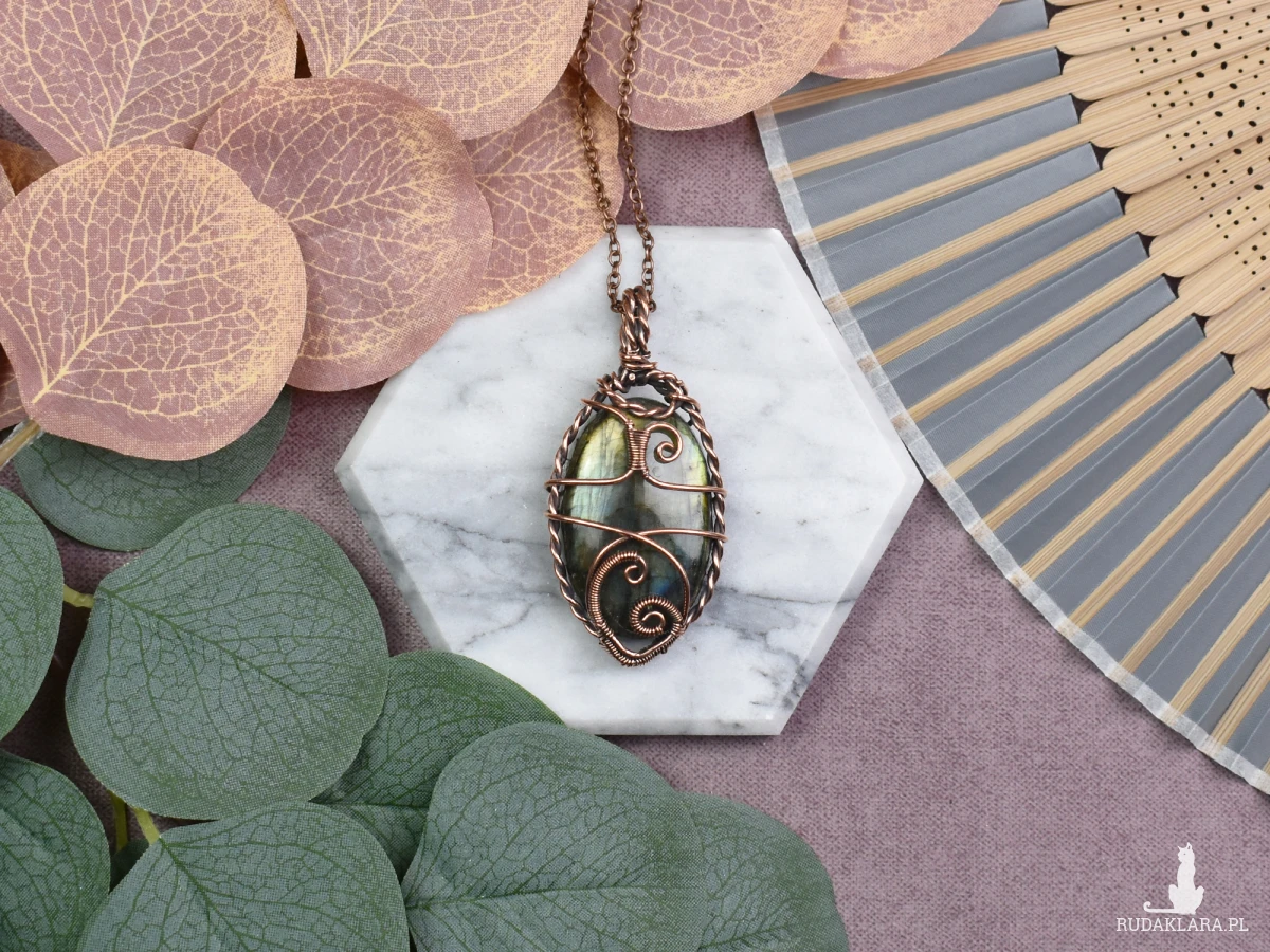 Piękny wisiorek wykonany metodą wire wrapping z miedzią, ozdobiony mistycznym labradorytem. Kamień ten, znany również jako labradoryt, emanuje subtelnością odcieni niebieskiego i złota, nadając wisiorkowi wyjątkowy urok. Jego właściwości obejmują wzmacnianie intuicji, rozwijanie kreatywności oraz przynoszenie spokoju emocjonalnego. Noszenie tego wisiorka może być nie tylko modowym akcentem, ale także sposobem na zharmonizowanie energii i odczuwanie równowagi. To niezwykłe połączenie miedzi i labradorytu tworzy niepowtarzalny amulet, który przyciąga pozytywne wibracje i podkreśla unikalność noszącego.