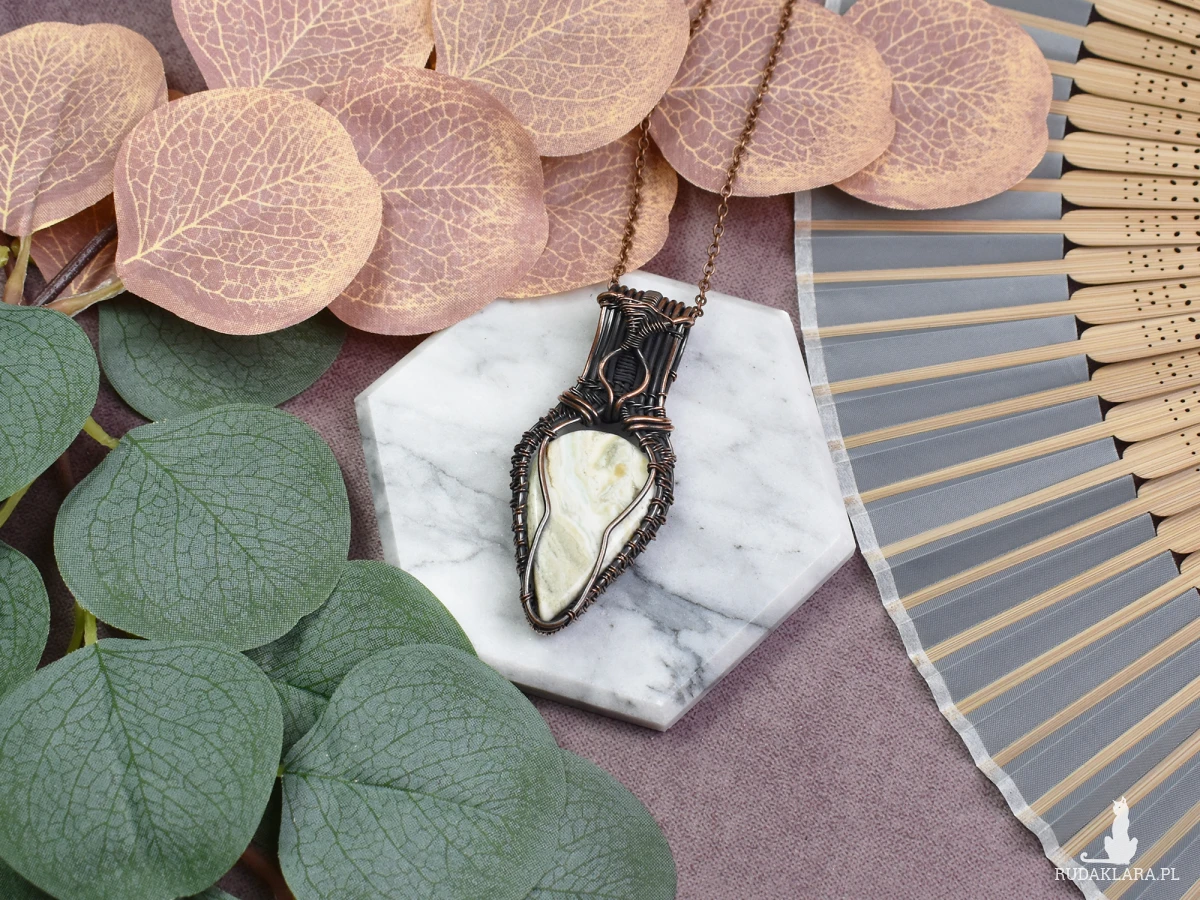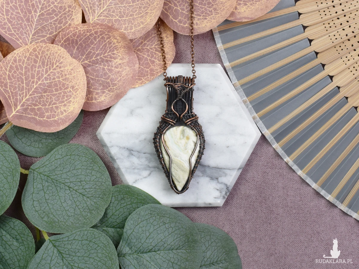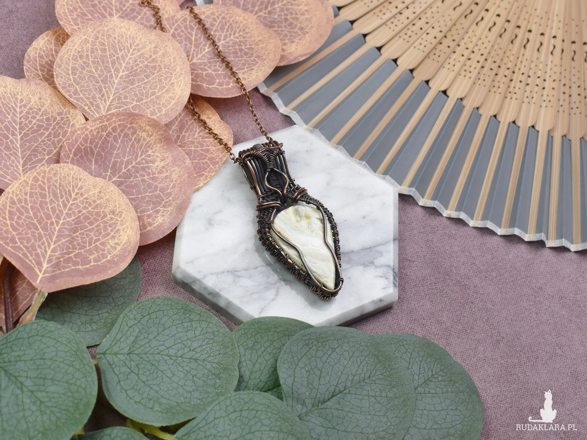 Miedziany wisiorek wykonany techniką wire wrapping z kamieniem larsonitem to niezwykłe połączenie naturalnej elegancji i ręcznej precyzji. Larsonit, znany również jako "kamień deszczu", zachwyca swoim unikalnym wzorem, który przypomina delikatne chmury na tle nieba. Ten kamień symbolizuje spokój, ochronę i równowagę, pomagając noszącemu w osiągnięciu wewnętrznego spokoju i klarowności myśli. Dodając temu wisiorkowi, wykonanemu z dbałością o szczegóły, osobisty akcent, możesz cieszyć się nie tylko jego estetyką, ale także pozytywnym wpływem larsonitu na Twoje życie.