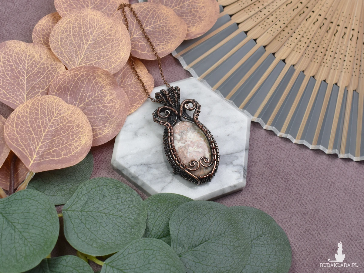 Miedziany wisiorek wykonany metodą wire wrapping z agatem to niezwykły dodatek do Twojej biżuterii. Agat, znany również jako kamień żywotności, przynosi harmonię i równowagę. Jego właściwości oczyszczające pomagają w radzeniu sobie z negatywnymi emocjami i wzmacniają wewnętrzną siłę. Ten unikatowy wisiorek nie tylko dodaje uroku Twojemu wyglądowi, ale także niesie ze sobą energetyczną moc natury, która wprowadza spokój i stabilność do Twojego życia. Idealny sposób na połączenie piękna biżuterii z korzyściami dla ciała i umysłu.