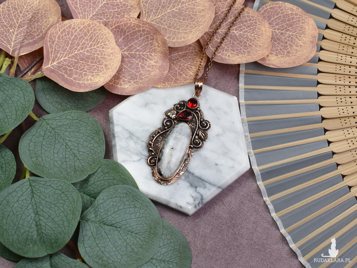 Piękny wisiorek z miedzi z kamieniem księżycowym i granatem to wyjątkowy dodatek do każdej stylizacji. Kamień księżycowy dodaje mu delikatności, emanując subtelnym blaskiem, podczas gdy granat dodaje głębi koloru i elegancji. Dodatkowo, kamień księżycowy jest uznawany za symbol intuicji i ochrony, przynosząc równowagę emocjonalną, podczas gdy granat jest kojarzony z energią, pasją i determinacją. To nie tylko ozdoba, lecz także talizman łączący estetykę z głębszym znaczeniem.