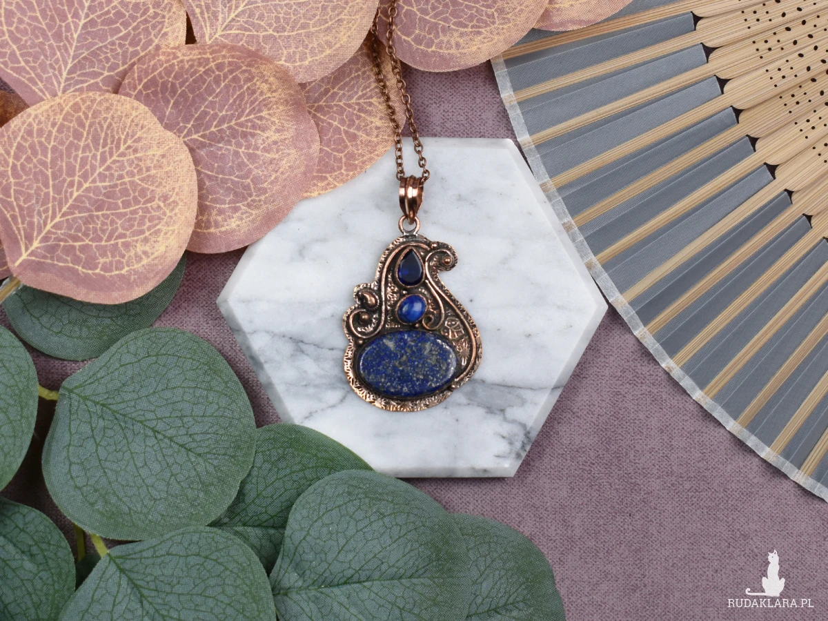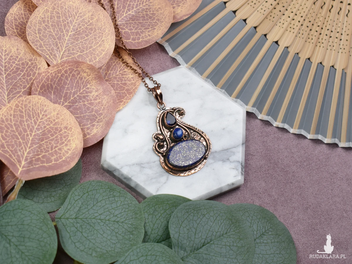 Piękny wisiorek z miedzi ozdobiony lapis lazuli i sztucznym tanzanitem, stworzonym w laboratorium, to elegancki dodatek do każdej stylizacji. Lapis lazuli to kamień mądrości i wewnętrznego spokoju, który pobudza intuicję i wspiera komunikację. Sztuczny tanzanit dodaje mu subtelnego blasku, symbolizując duchową odnowę i klarowność myśli. Idealny wybór dla tych, którzy cenią nie tylko piękno, ale także znaczenie i energię kamieni naturalnych.