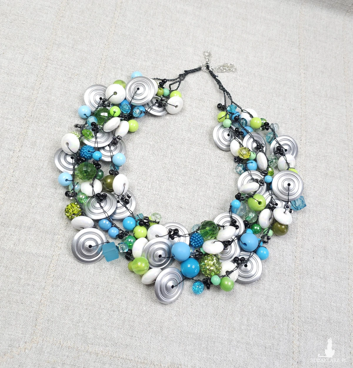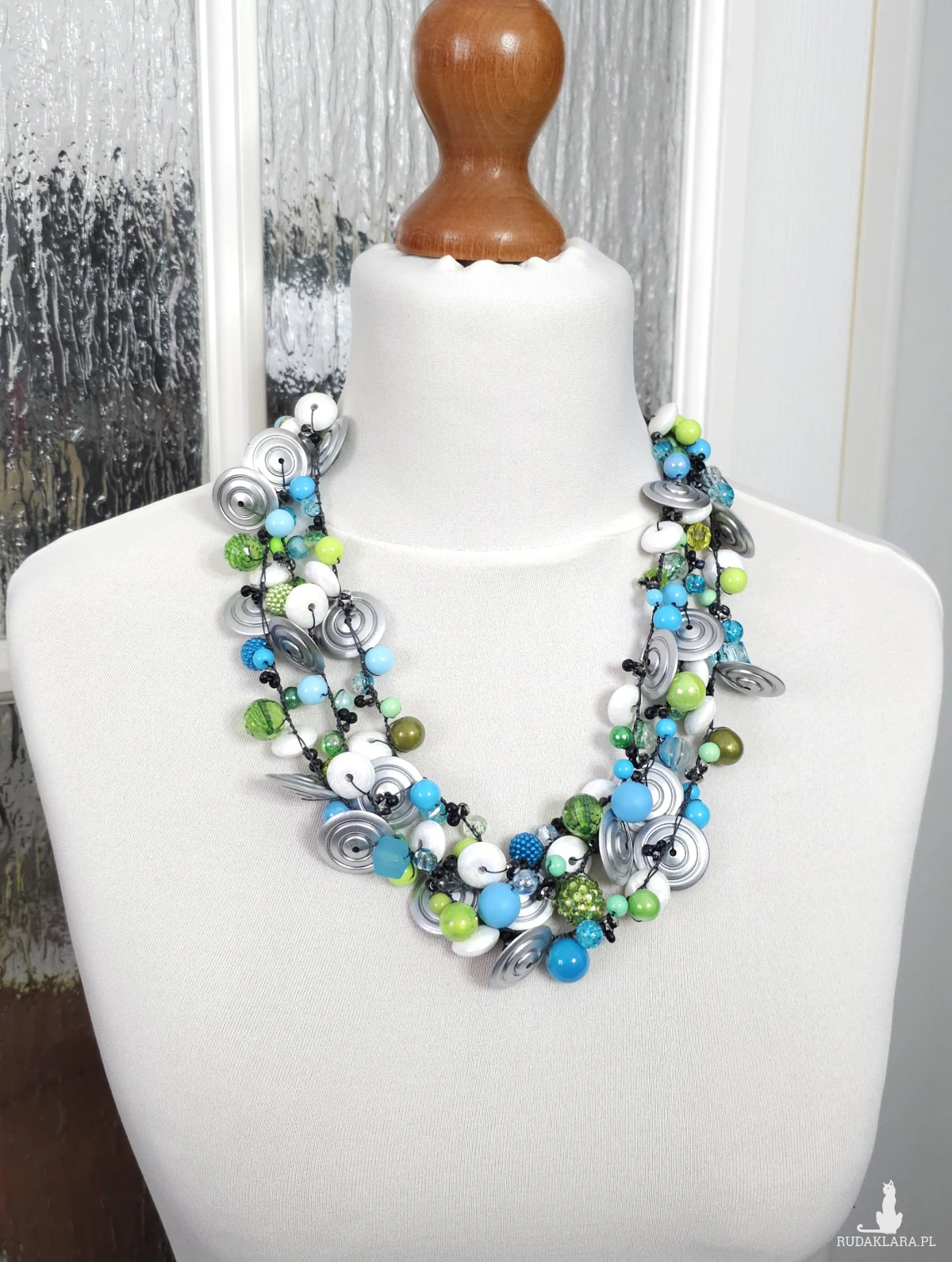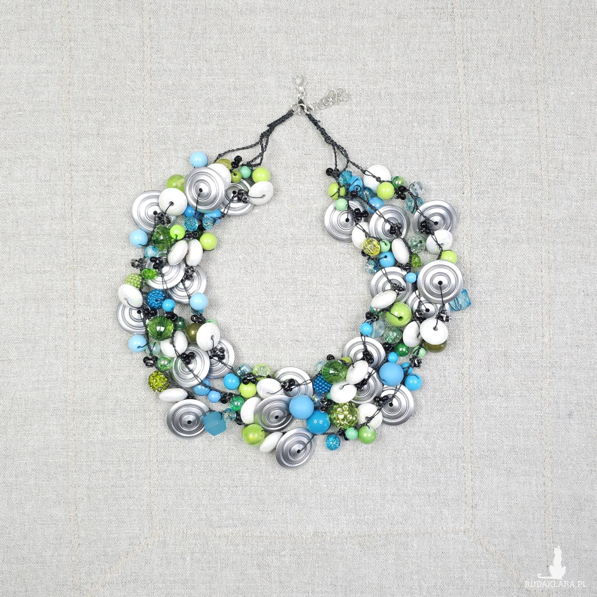Ręcznie wykonany, kaskadowy naszyjnik łączący energetyczną limonkę z głębokim turkusem i nowoczesnymi srebrnymi detalami. Bogata kompozycja koralików i dysków została spleciona
