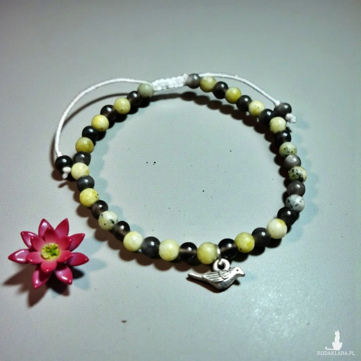 Bransoletka z naturalnych kamieni obsydianu i żółtego jaspisu to elegancka i wyjątkowa biżuteria. Ciekawe kolory kamieni oraz zawieszka z ptakiem dodają jej uroku i tworzą z niej ciekawą i oryginalną ozdobę.