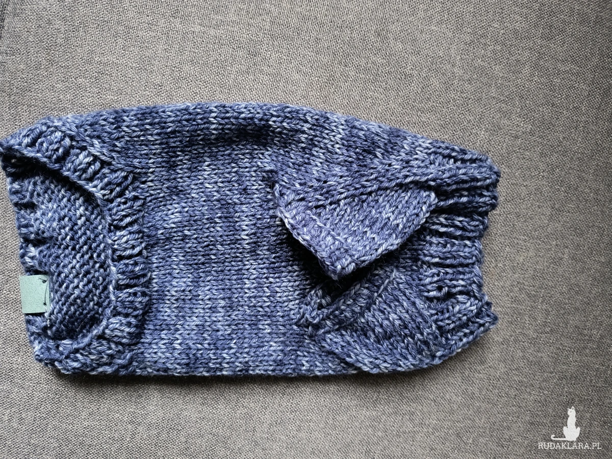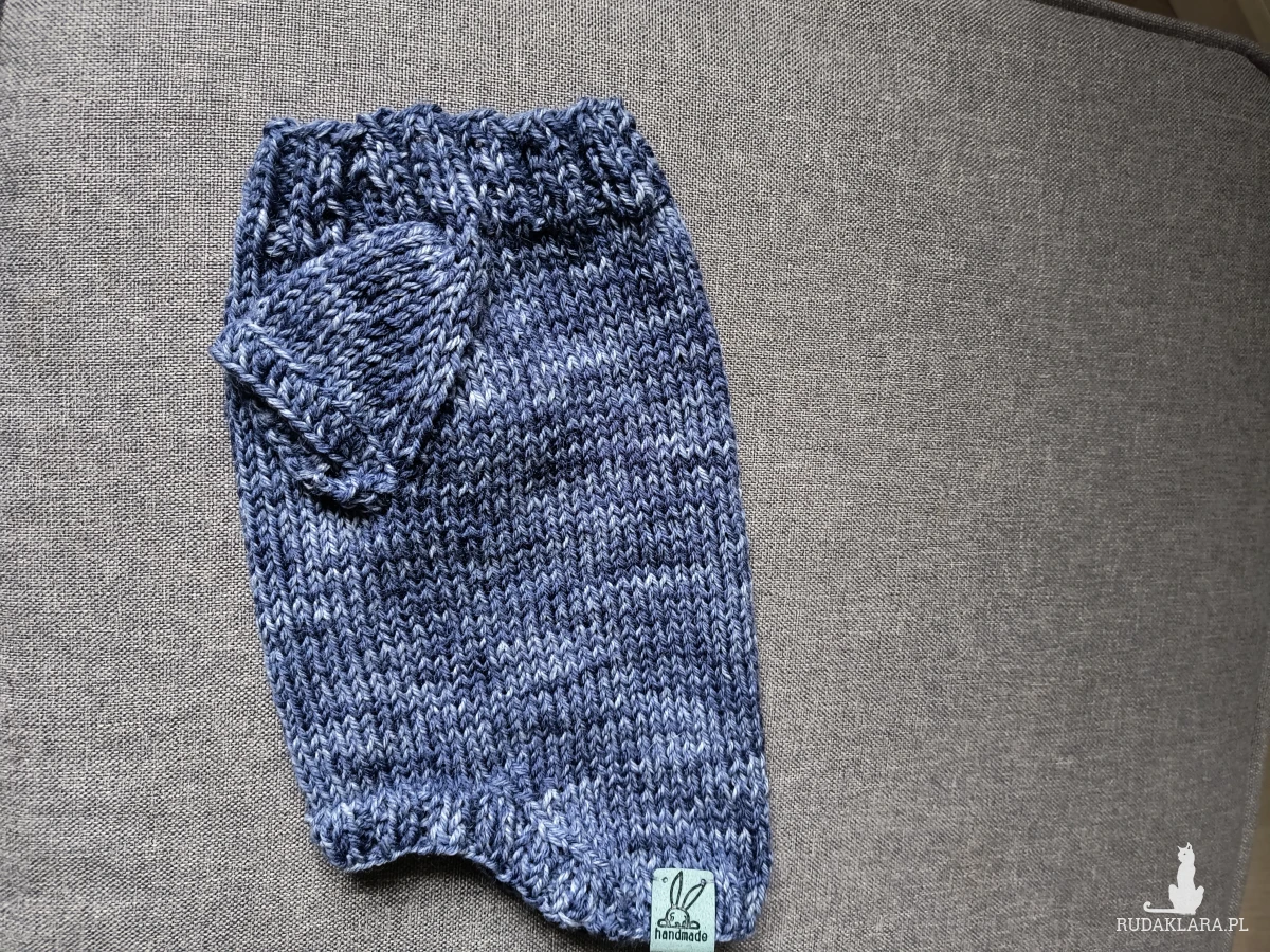 Sweterek dla psa, kota wełna 75% i akryl 25%. Bardzo ciepły włóczka skarpetkowa. Długość całkowita 27 cm, długość pod brzuchem 21 cm, obwód 30 cm. Mierzony na płasko bez rozciągania.