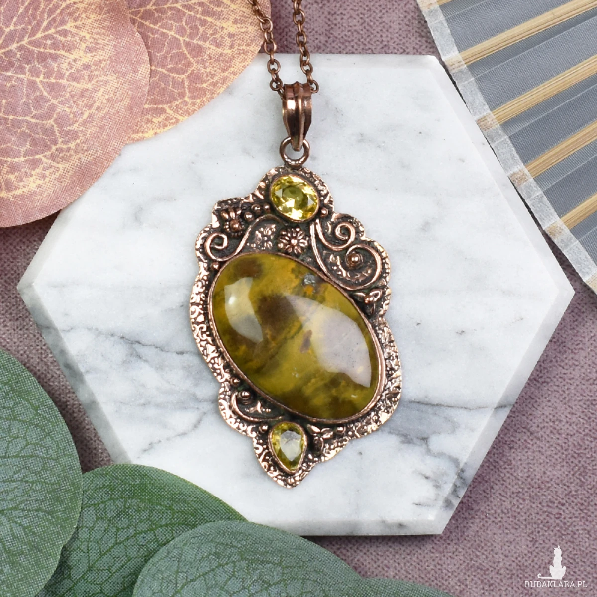 Elegancki wisiorek z miedzi ozdobiony jaspisem i cytrynem to unikalna biżuteria, która przyciąga uwagę swoim urokiem. Kamień jaspis dodaje wisiorkowi ziemiennego piękna i podkreśla stabilność, natomiast cytryn wzbogaca go o energię, optymizm i pozytywne wibracje. Ta wyjątkowa kombinacja nie tylko ozdabia, ale także niesie ze sobą pozytywne właściwości, czyniąc ten wisiorek nie tylko stylowym dodatkiem, ale również kamieniem talizmanicznym na co dzień.