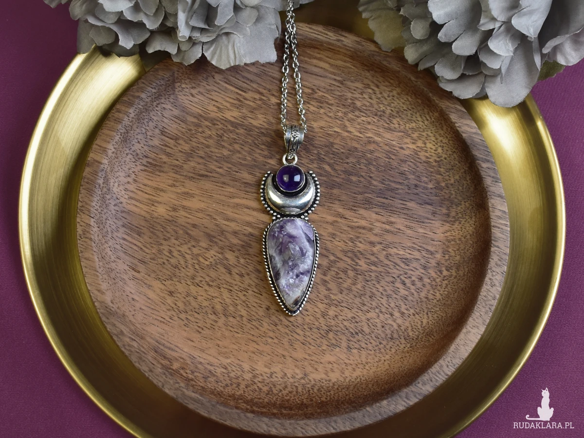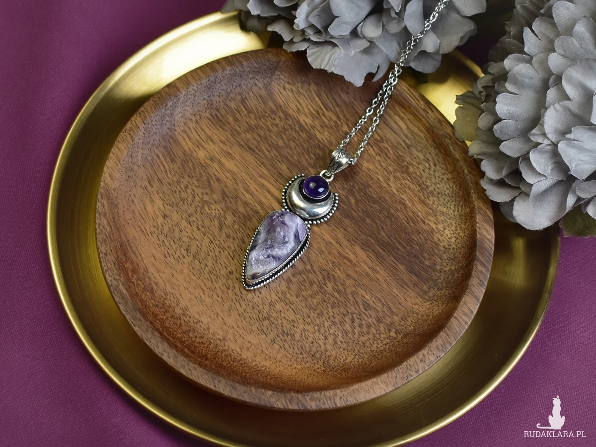Ręcznie wykonany wisiorek z miedzi, pokryty srebrem. Głównym elementem jest surowy ametyst, uzupełniony mniejszym ametystem. Ametyst to kamień ceniony za swoje właściwości ochronne i wspomagające koncentrację. Wisiorek łączy naturalne piękno kamieni z solidnym wykonaniem. Idealny dodatek do każdej stylizacji.