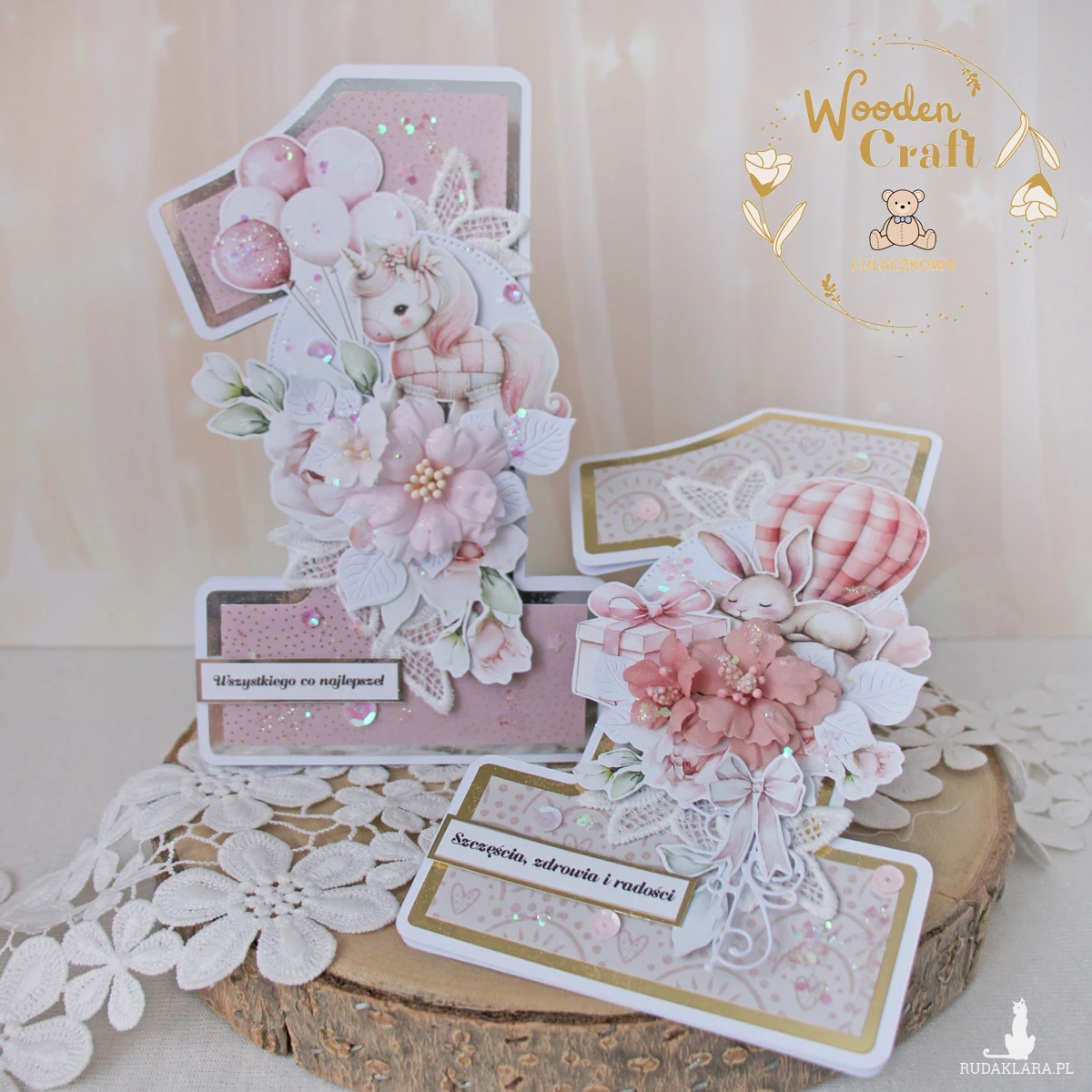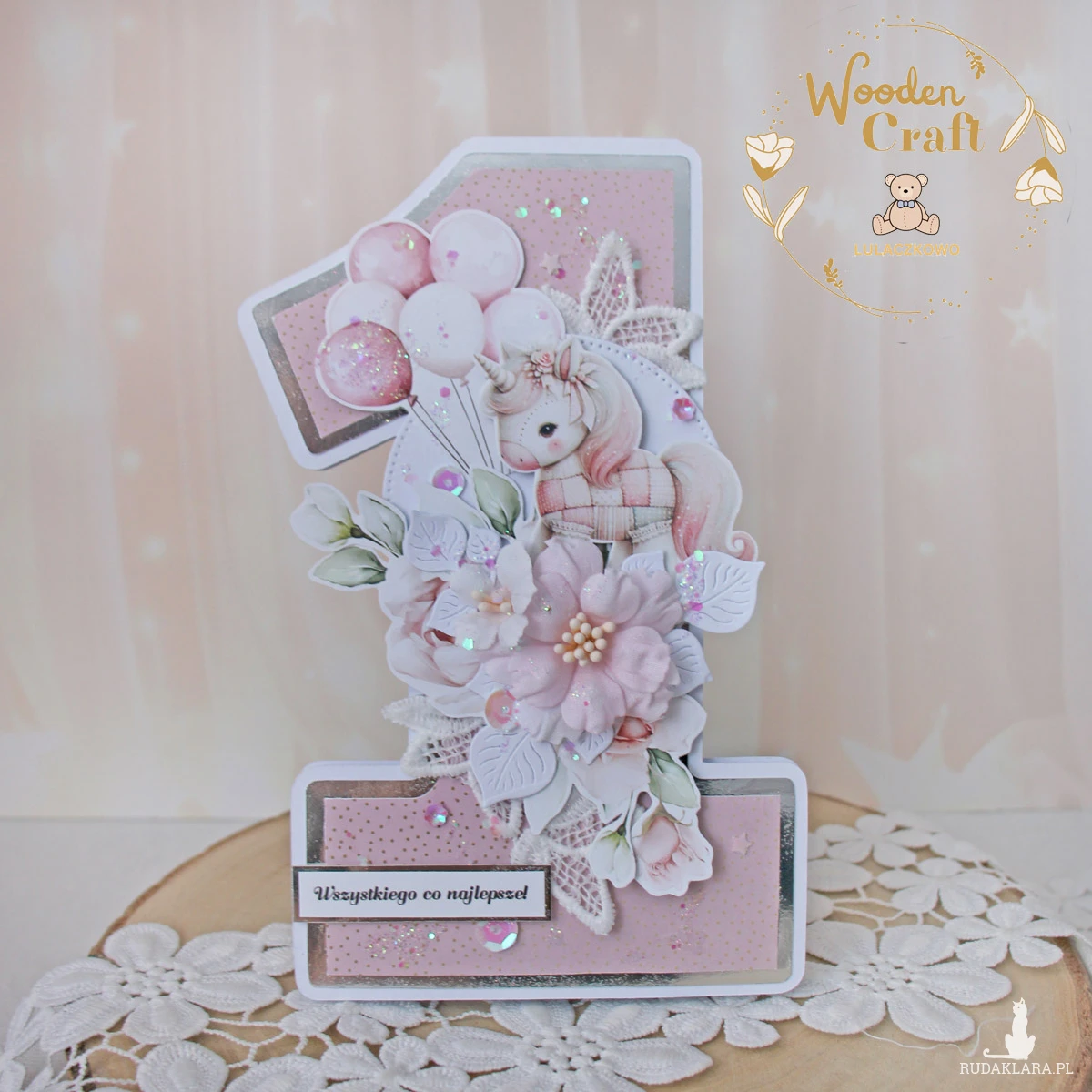 Urocza i nietuzinkowa, dziecięca kartka na roczek, w kształcie cyferki jedynki, wykonana z mixu kolekcji papierów dziecięcych, utrzymana w odcieniach brudnego różu, beżu i bieli z dodatkiem błyszczących, złotych akcentów. Kartka wykonana ręcznie z dbałością o każdy szczegół. Na środku znajduje się grafika prześlicznego jednorożca, ozdobiona kompozycją kwiatową z ręcznie wykonanymi kwiatami, dodatkowo zdobiona cekinami i koronką, połyskującymi drobinkami, a także napisem "Wszystkiego co najlepsze" (na życzenie mogę dodać również imię dziecka, lub całkowicie zmienić napis na inny).