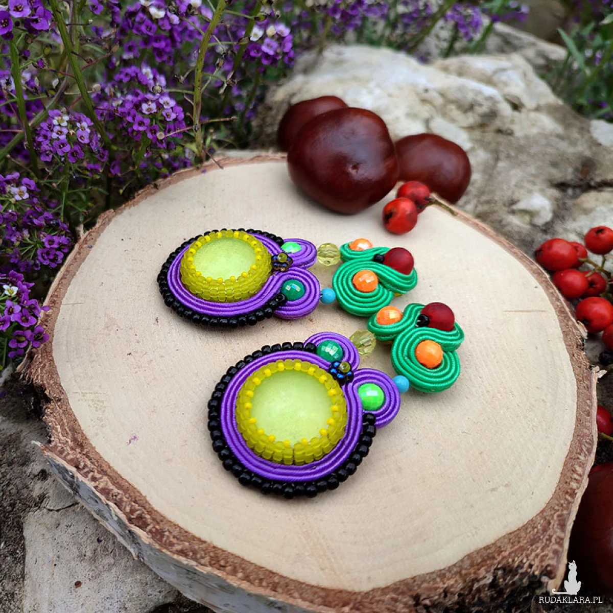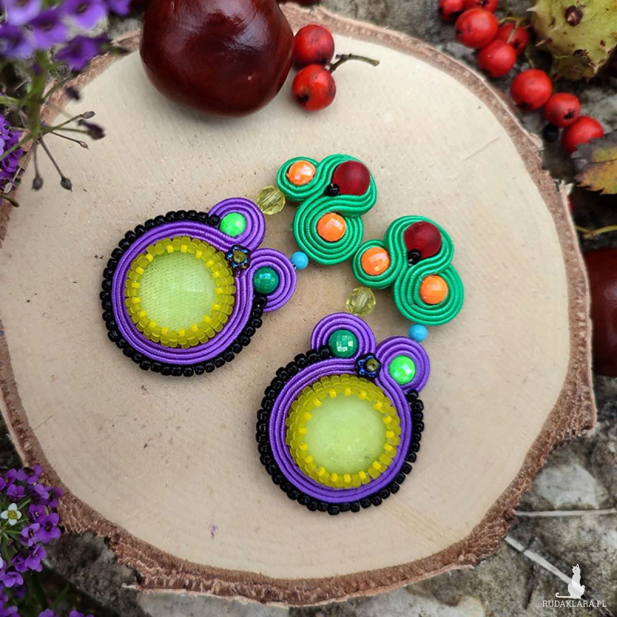 Te unikatowe kolczyki sutasz zostały wykonane ręcznie z dbałością o każdy detal. Intensywny fiolet, energetyczna żółć oraz kolorowe akcenty koralików tworzą odważną i artystyczną kompozycję.