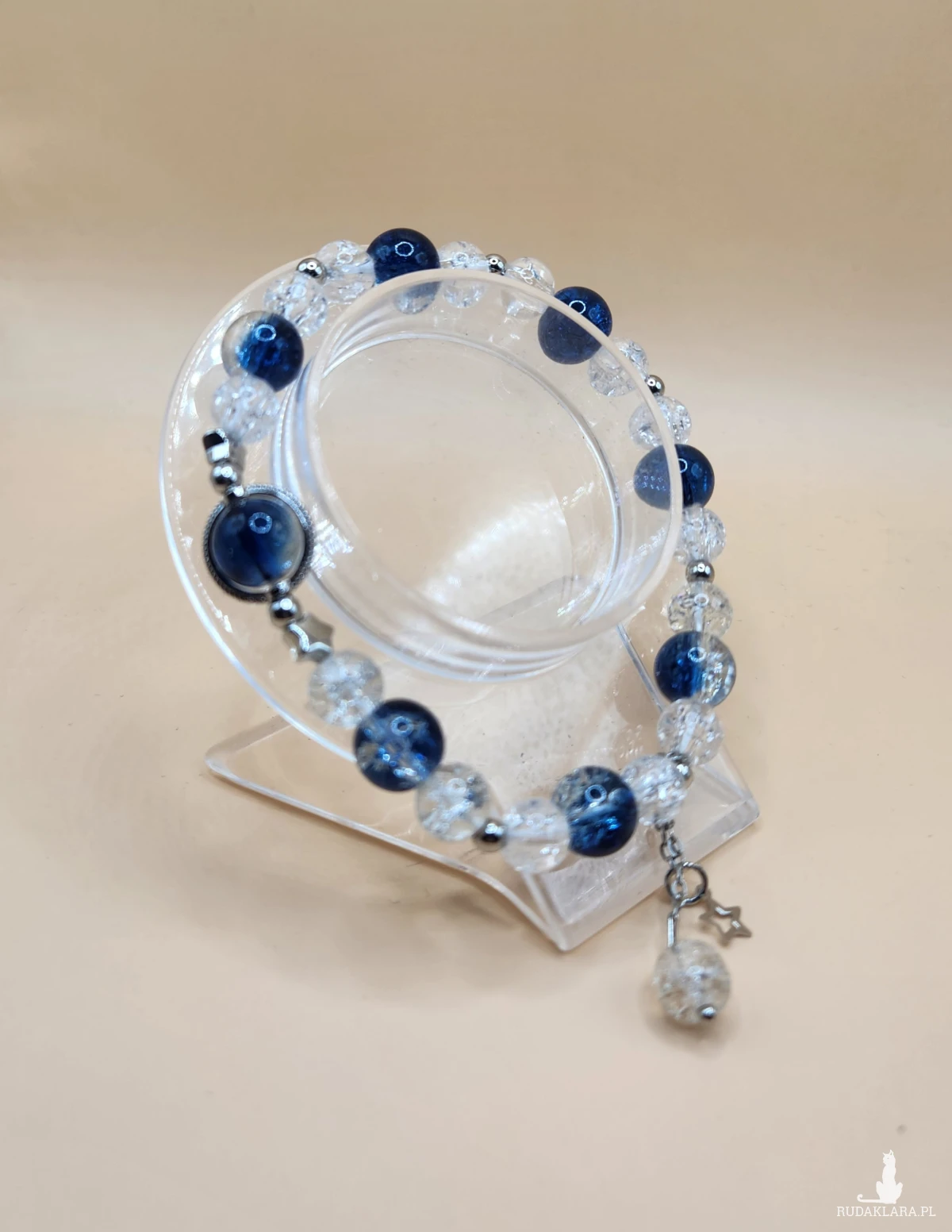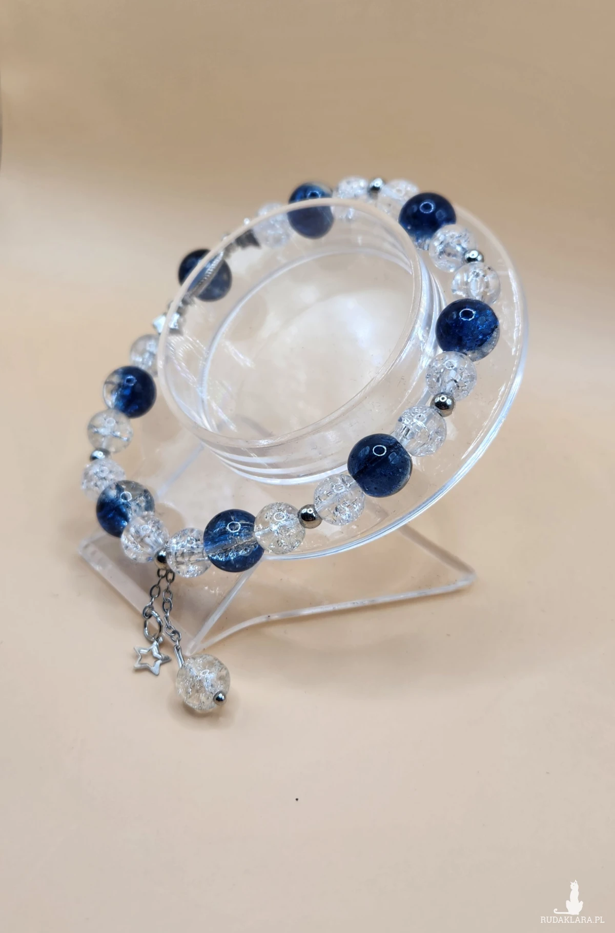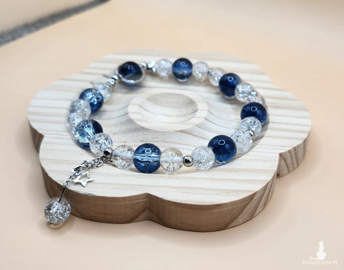 Sprzedam elegancką bransoletkę wykonaną z pięknych koralików w kolorze głębokiego granatu oraz transparentnych, połyskujących kulek typu crackle. Całość uzupełniają srebrne przekładki oraz delikatna zawieszka w kształcie gwiazdki z dodatkowym kryształowym akcentem.