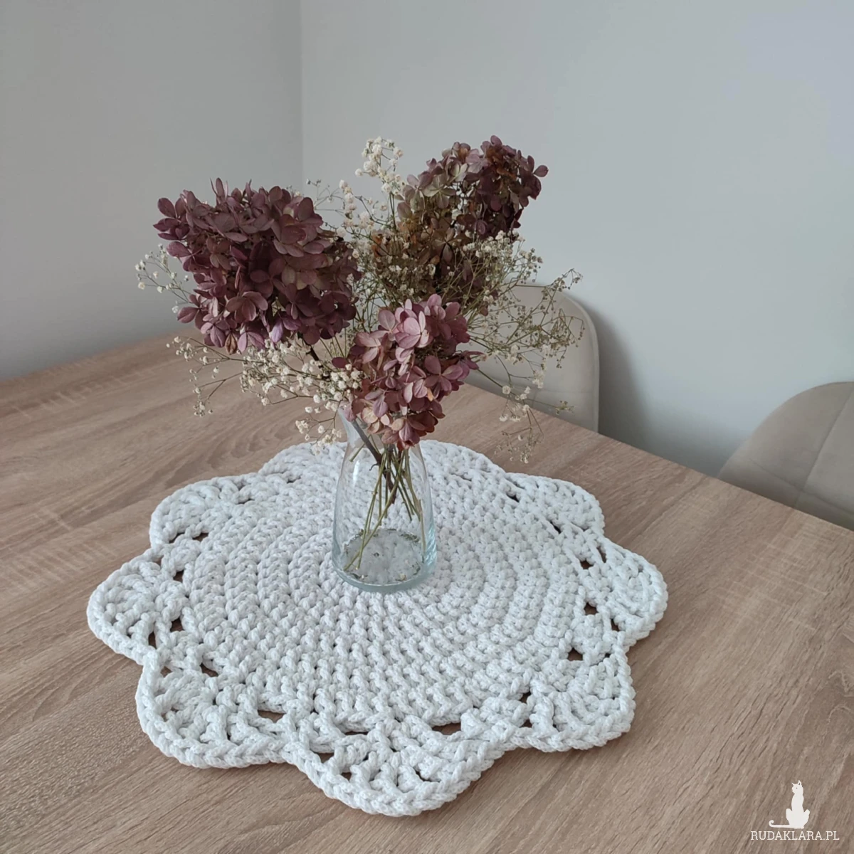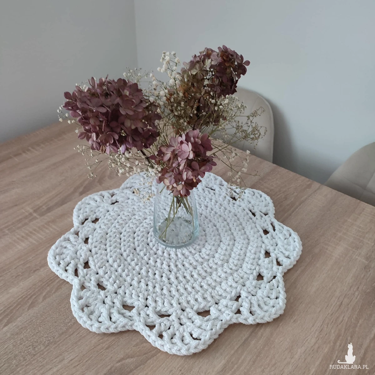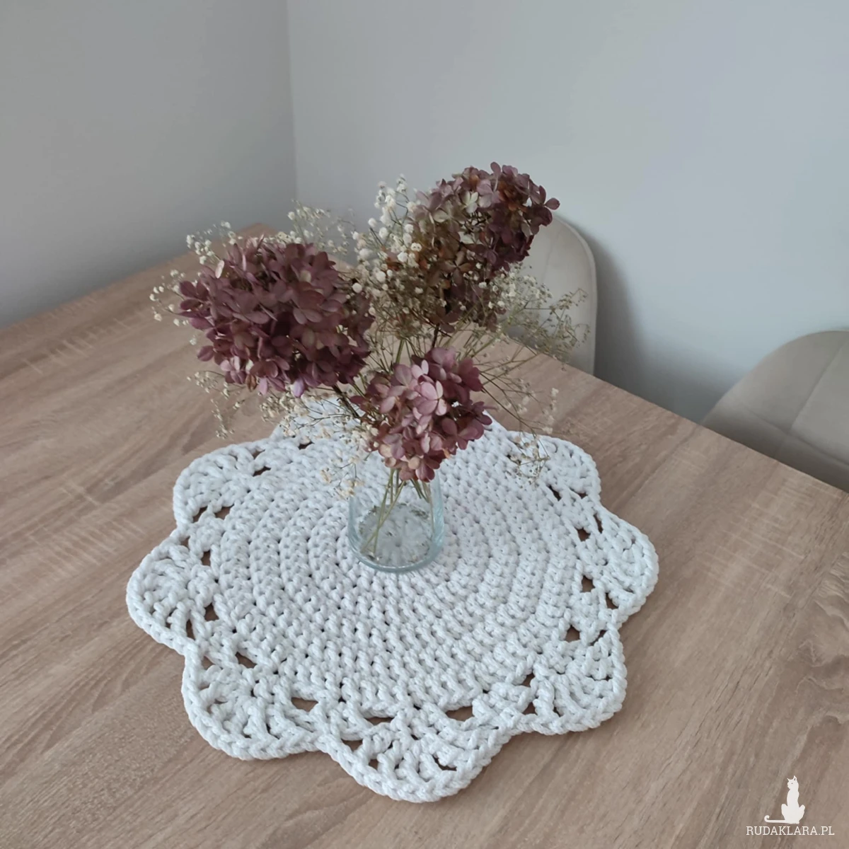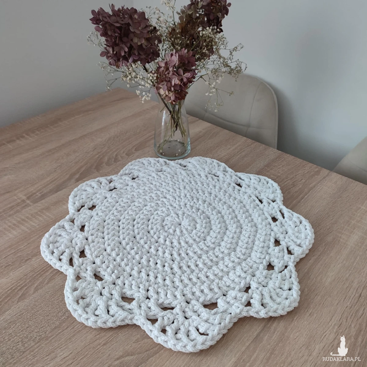 Podkładka o średnicy 46cm, wykonana metodą szydełkowania z polskiego sznurka bawełnianego 5mm.