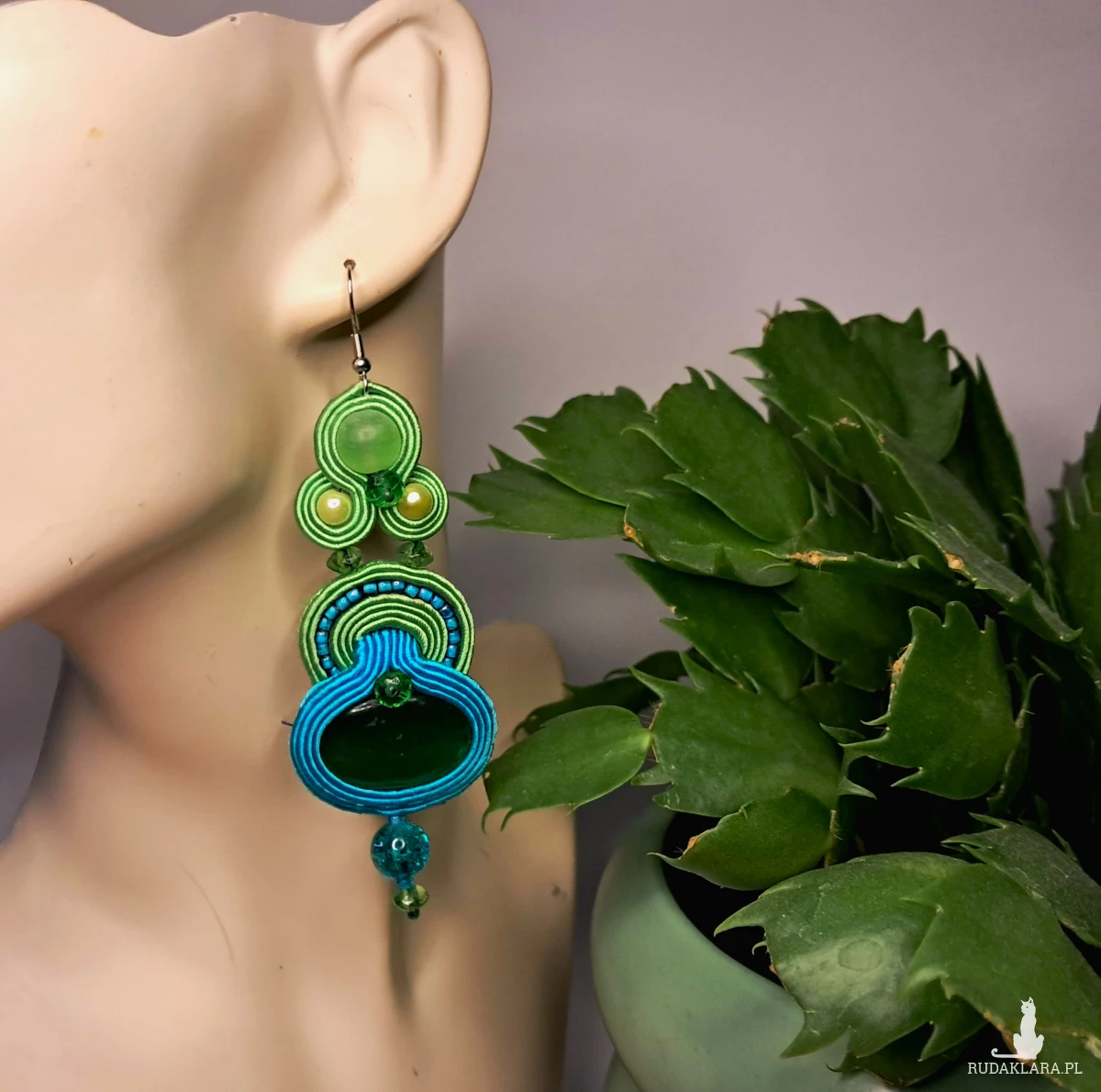 Te niezwykłe długie kolczyki zostały wykonane techniką sutasz, która pozwala tworzyć misterne i eleganckie formy. Połączenie intensywnej zieleni z głębokim turkusem nadaje biżuterii wyrazisty, a zarazem harmonijny charakter.