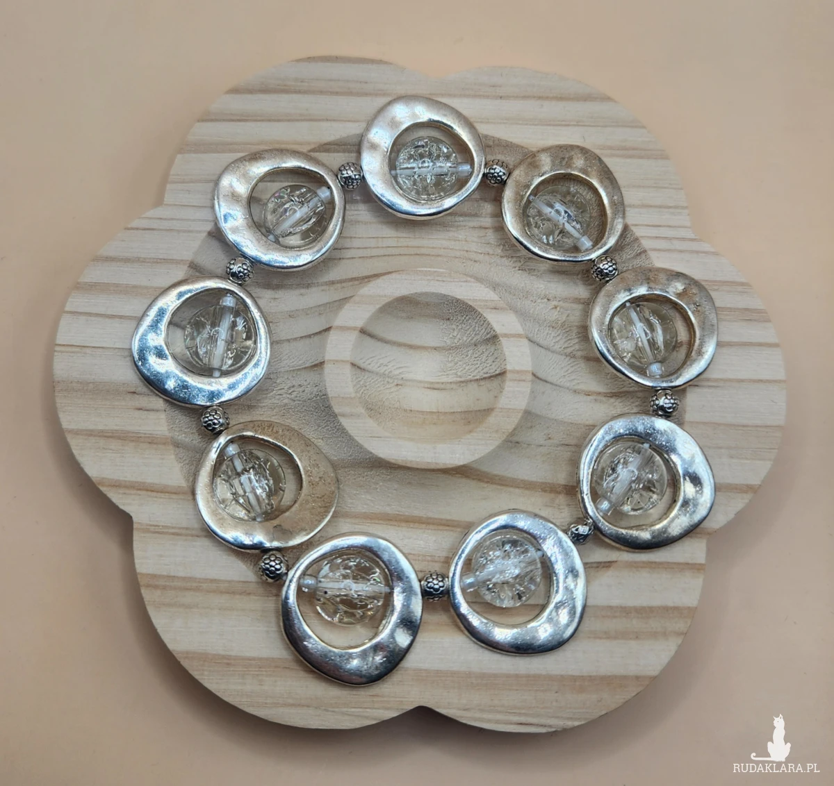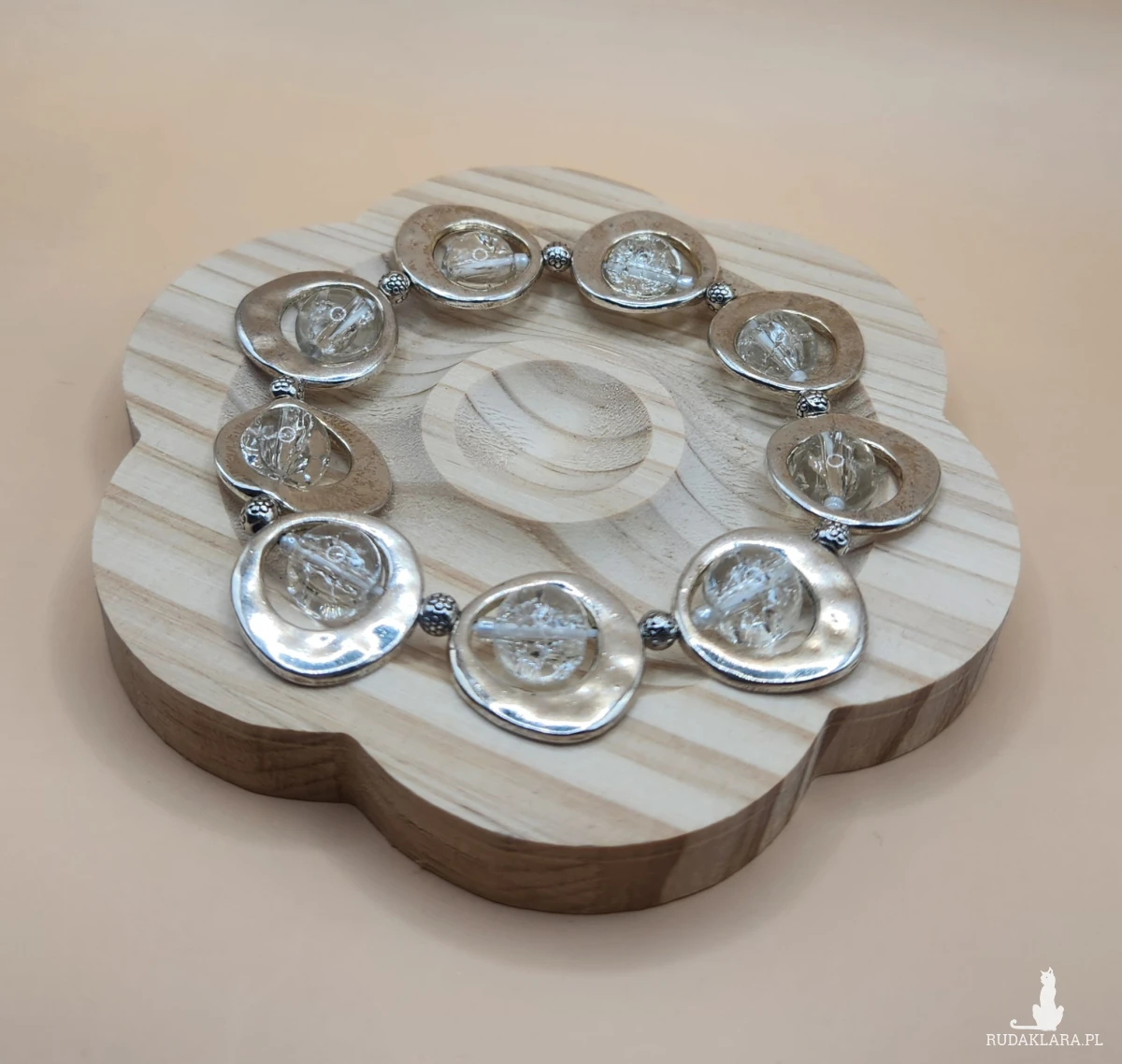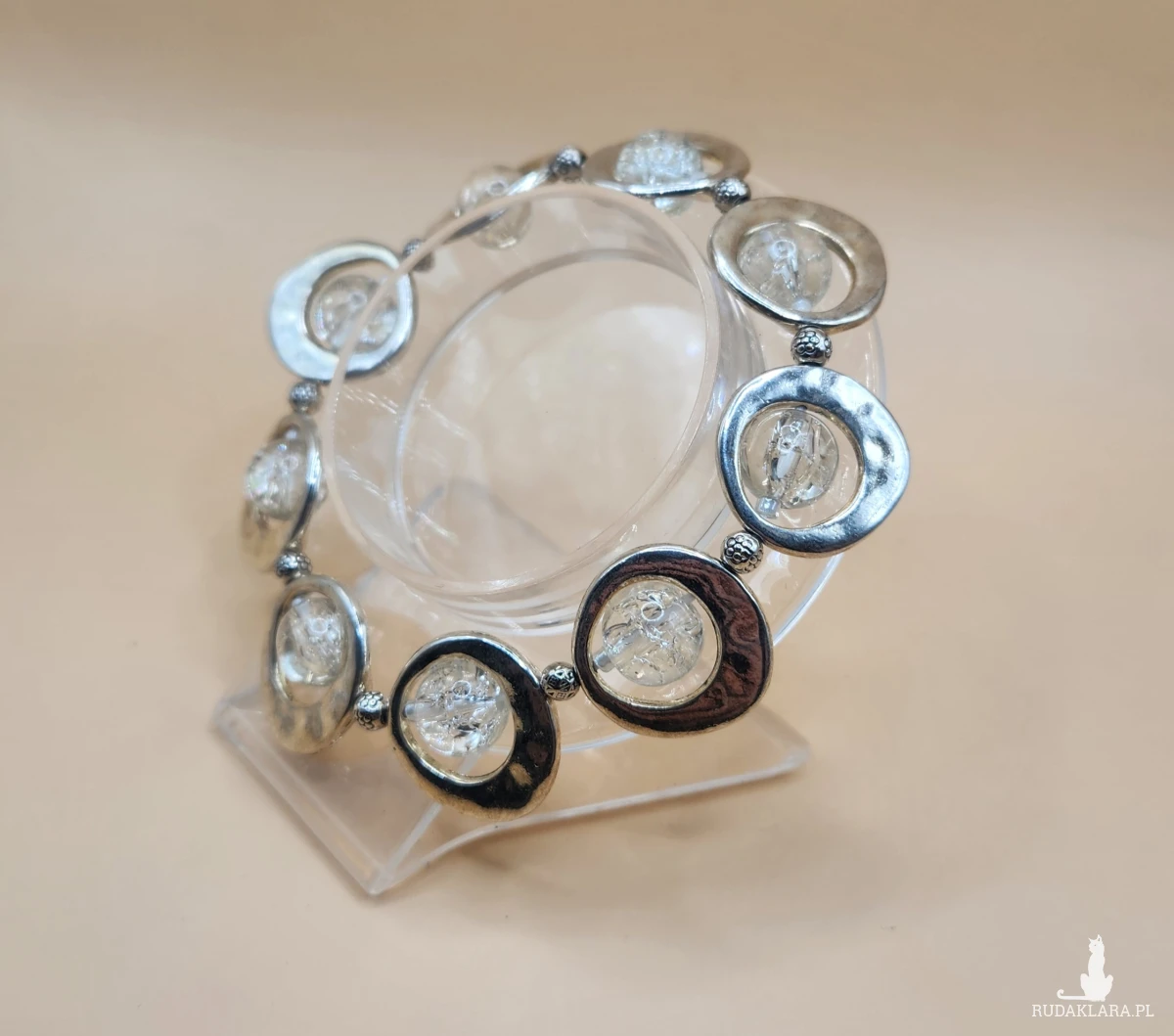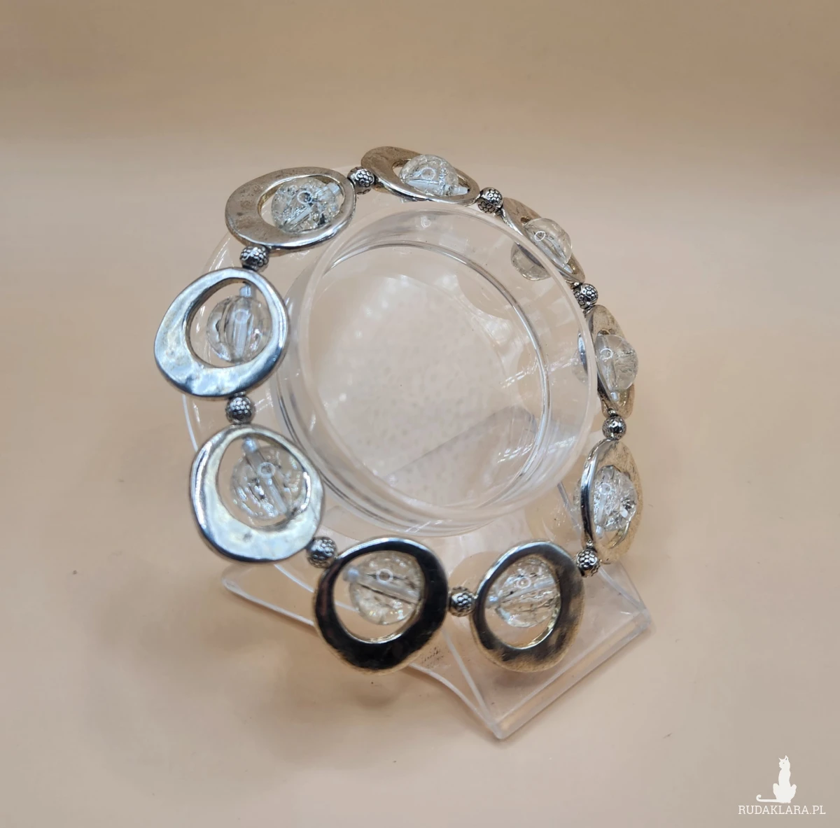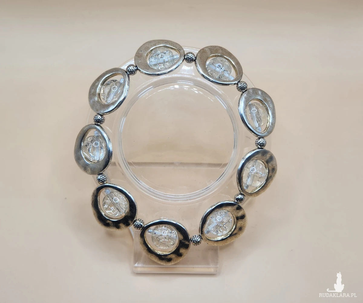 Sprzedam efektowną bransoletkę w kolorze srebrnym z dekoracyjnymi okrągłymi elementami oraz przezroczystymi ozdobami. Biżuteria prezentuje się bardzo elegancko i nowocześnie — idealna zarówno na co dzień, jak i na specjalne okazje.
