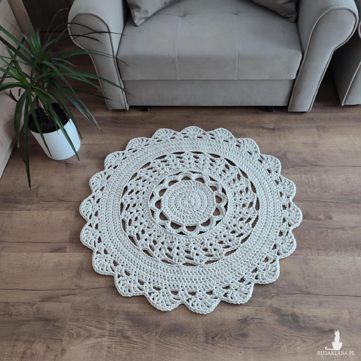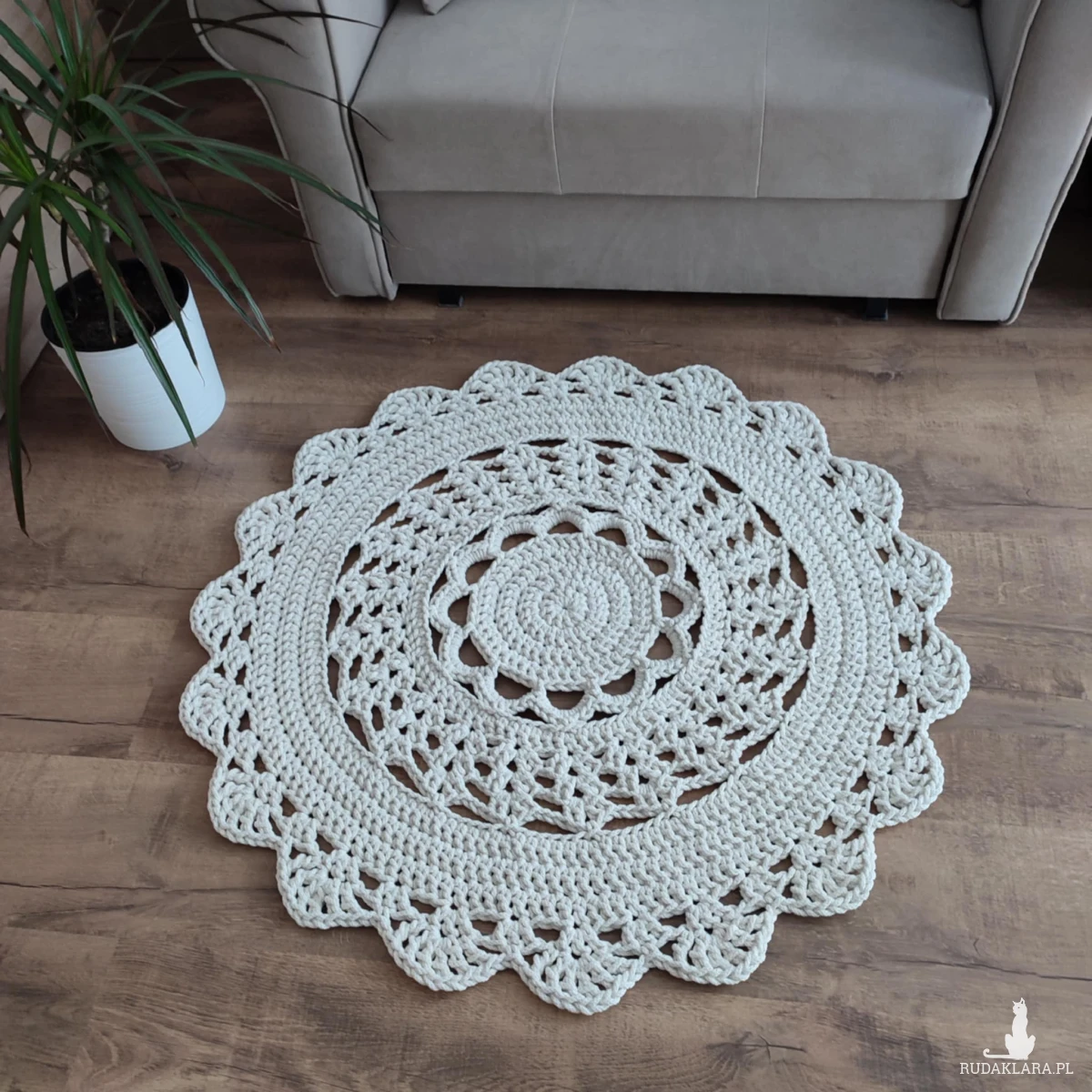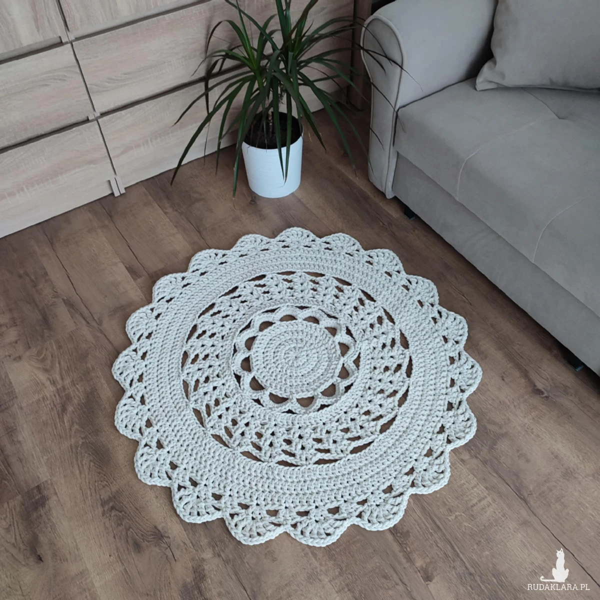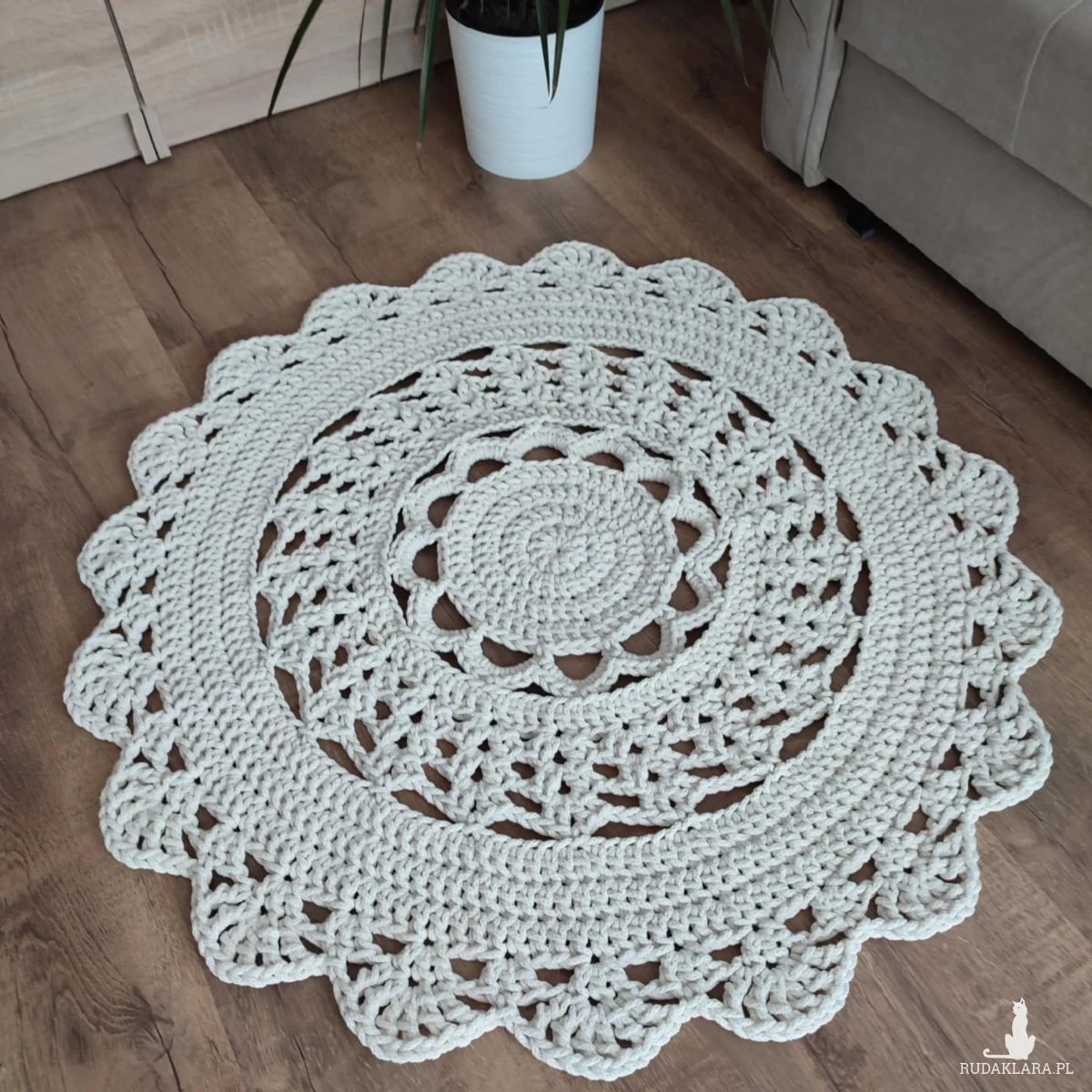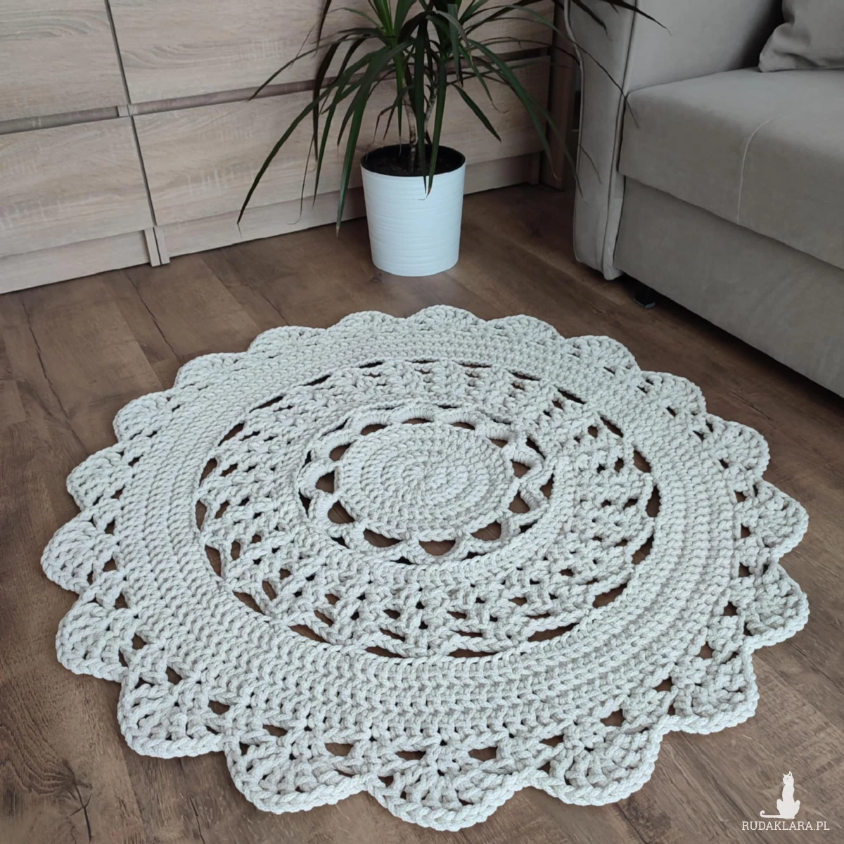 Dywan o średnicy 90cm, wykonany metodą szydełkowania z polskiego sznurka bawełnianego 5mm.