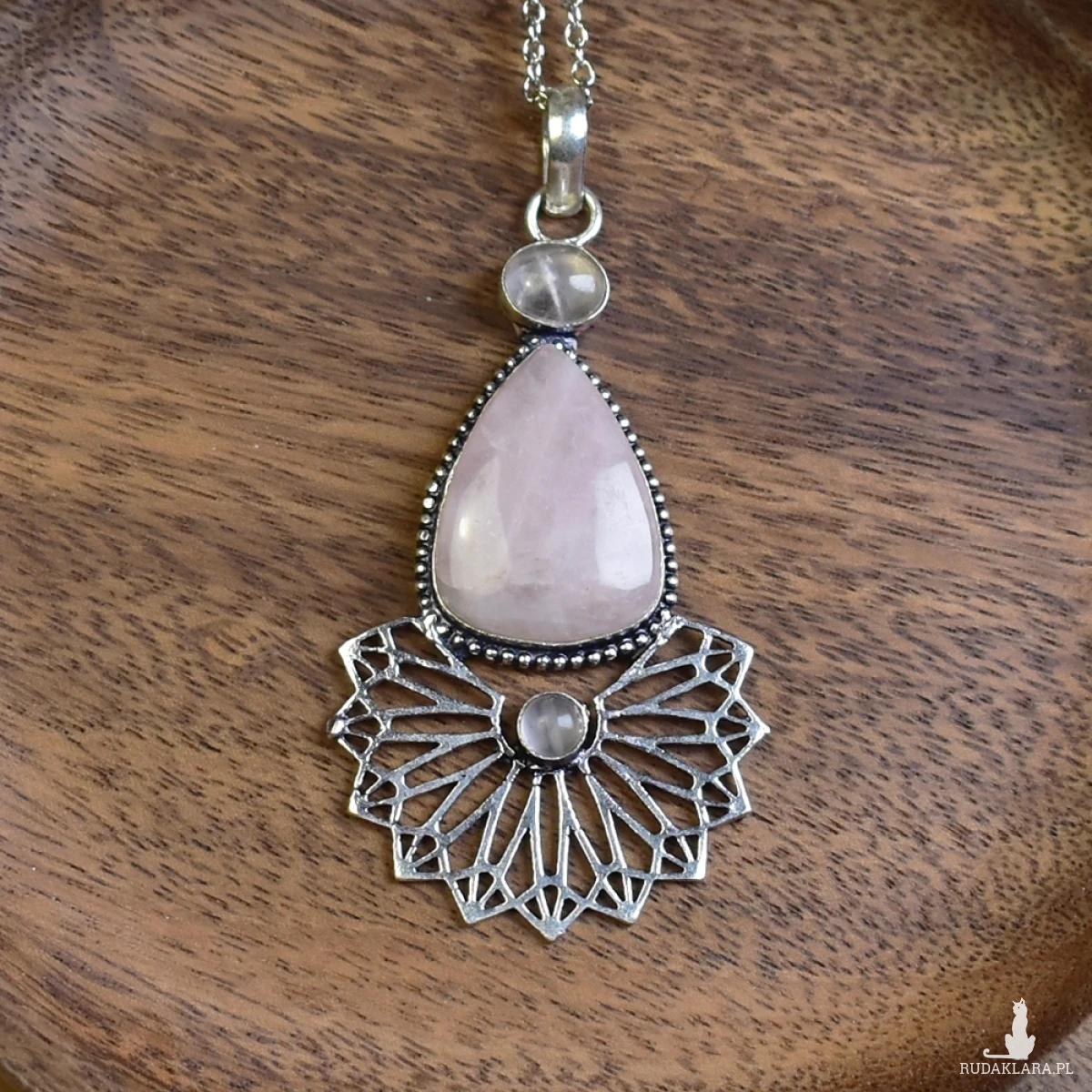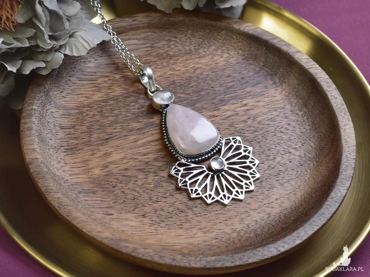 Wisiorek wykonany ręcznie z miedzi, pokryty srebrem, ozdobiony dużym różowym kwarcem oraz dwoma mniejszymi. Różowy kolor kwarcu symbolizuje miłość i harmonię, a jego naturalne wibracje mają kojący wpływ na emocje. Kamienie te znane są również z zdolności do przyciągania pozytywnej energii i promowania wewnętrznego spokoju. W połączeniu z unikalnym wykonaniem miedzi i srebra, wisiorek jest nie tylko estetycznym dodatkiem do garderoby, ale także talizmanem, który może przynieść spokój i równowagę w życiu codziennym.