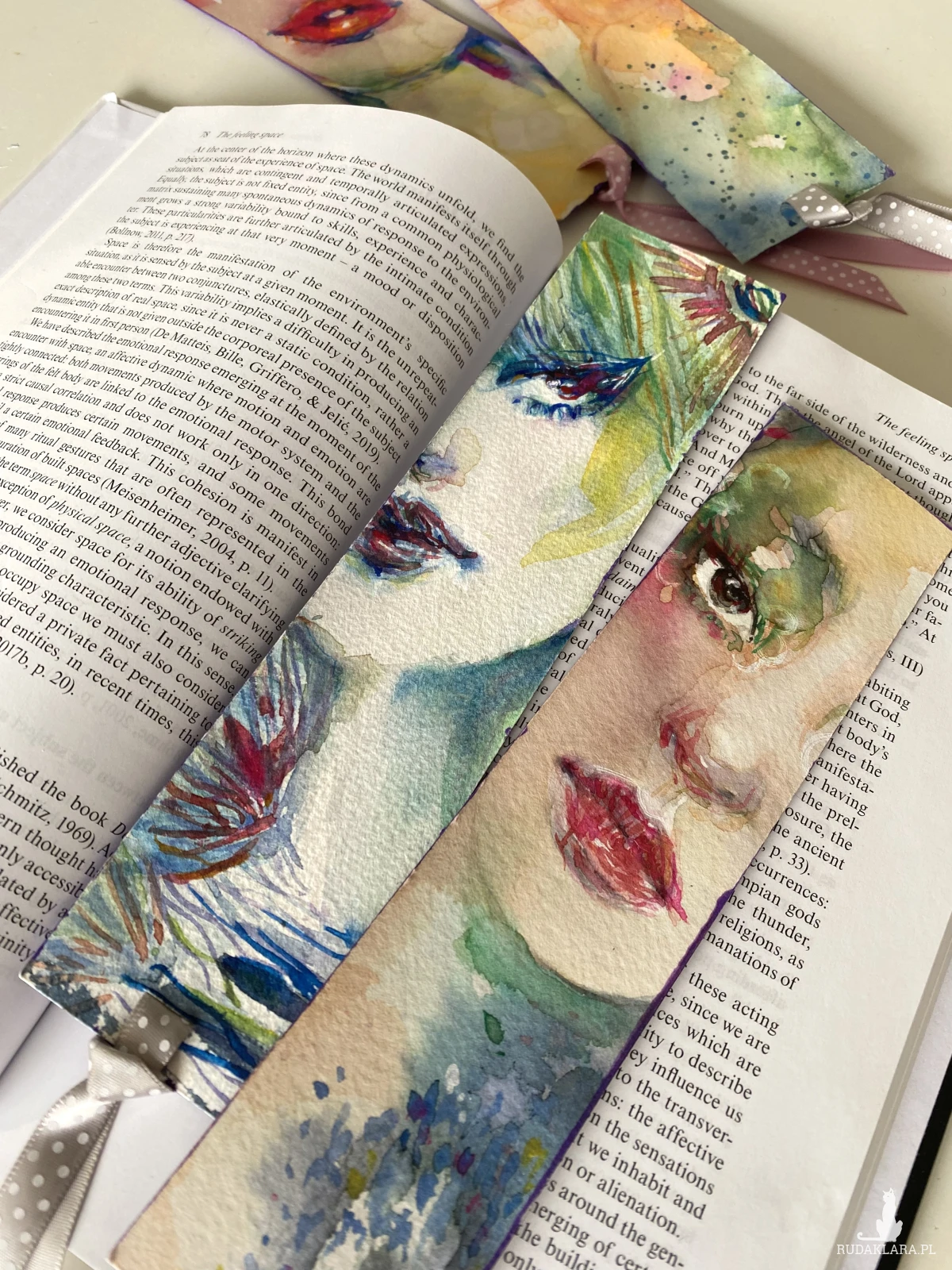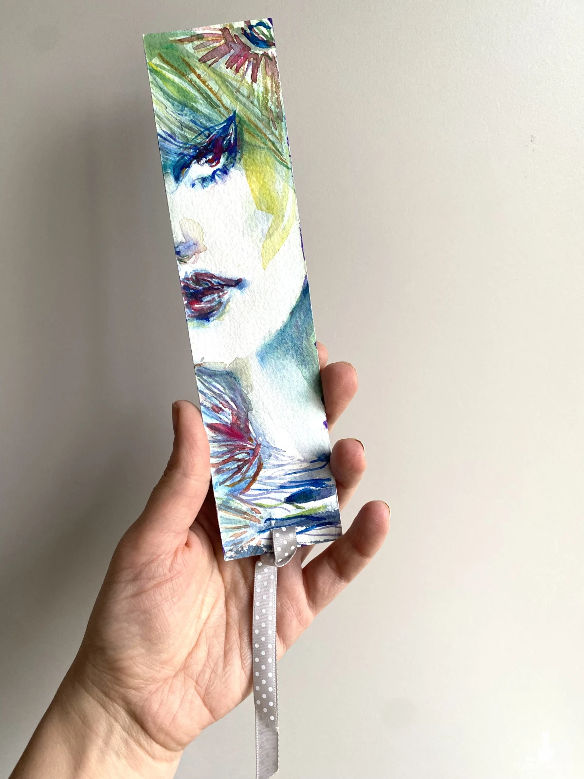 Ręcznie malowana papierowa zakładka. Przedstawia zbliżenie na twarz pięknej kobiety, kolory: niebieski, zielony, turkusowy.