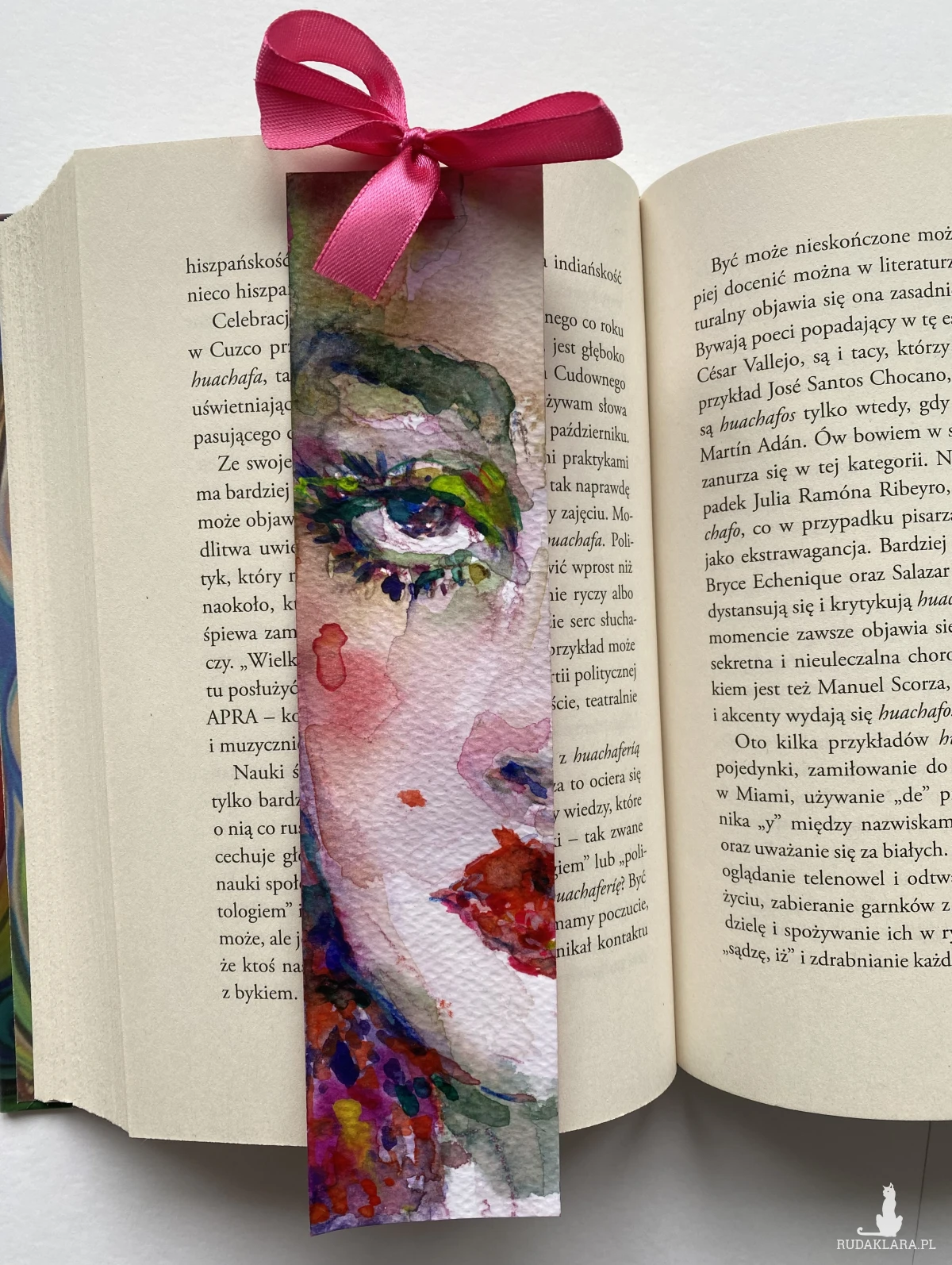 Ręcznie malowana papierowa zakładka. Przedstawia zbliżenie na piękną kobiecą twarz.