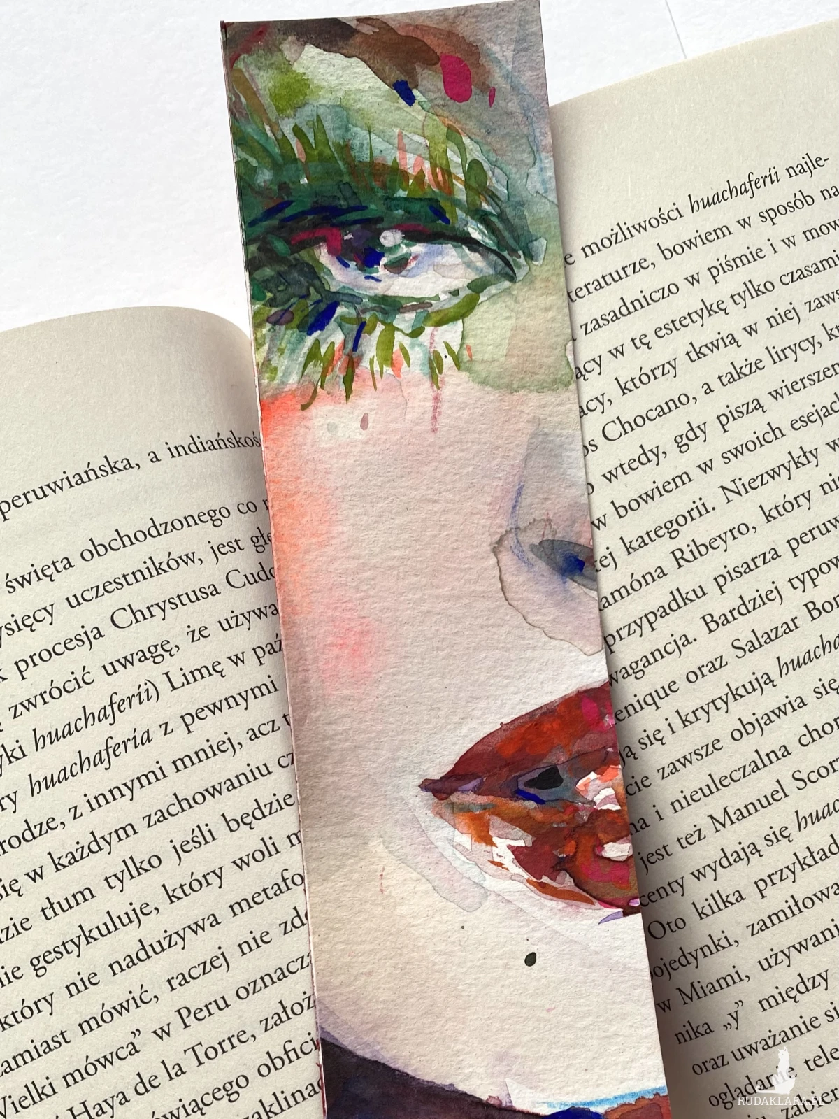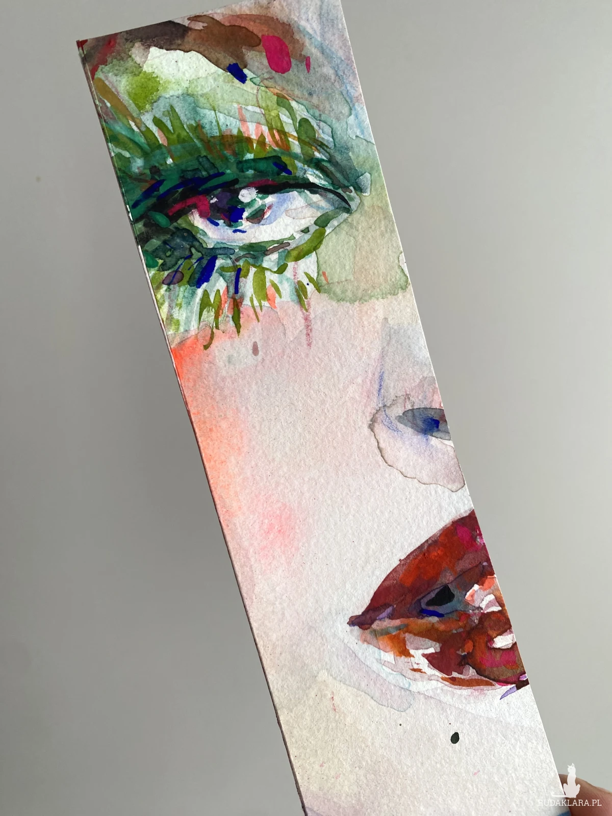 Ręcznie malowana papierowa zakładka. Przedstawia zbliżenie na piękną kobiecą twarz, w odcieniach czerwieni i zieleni.