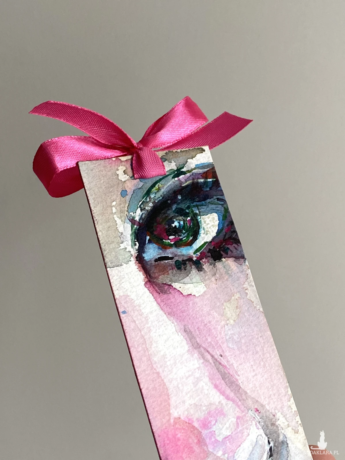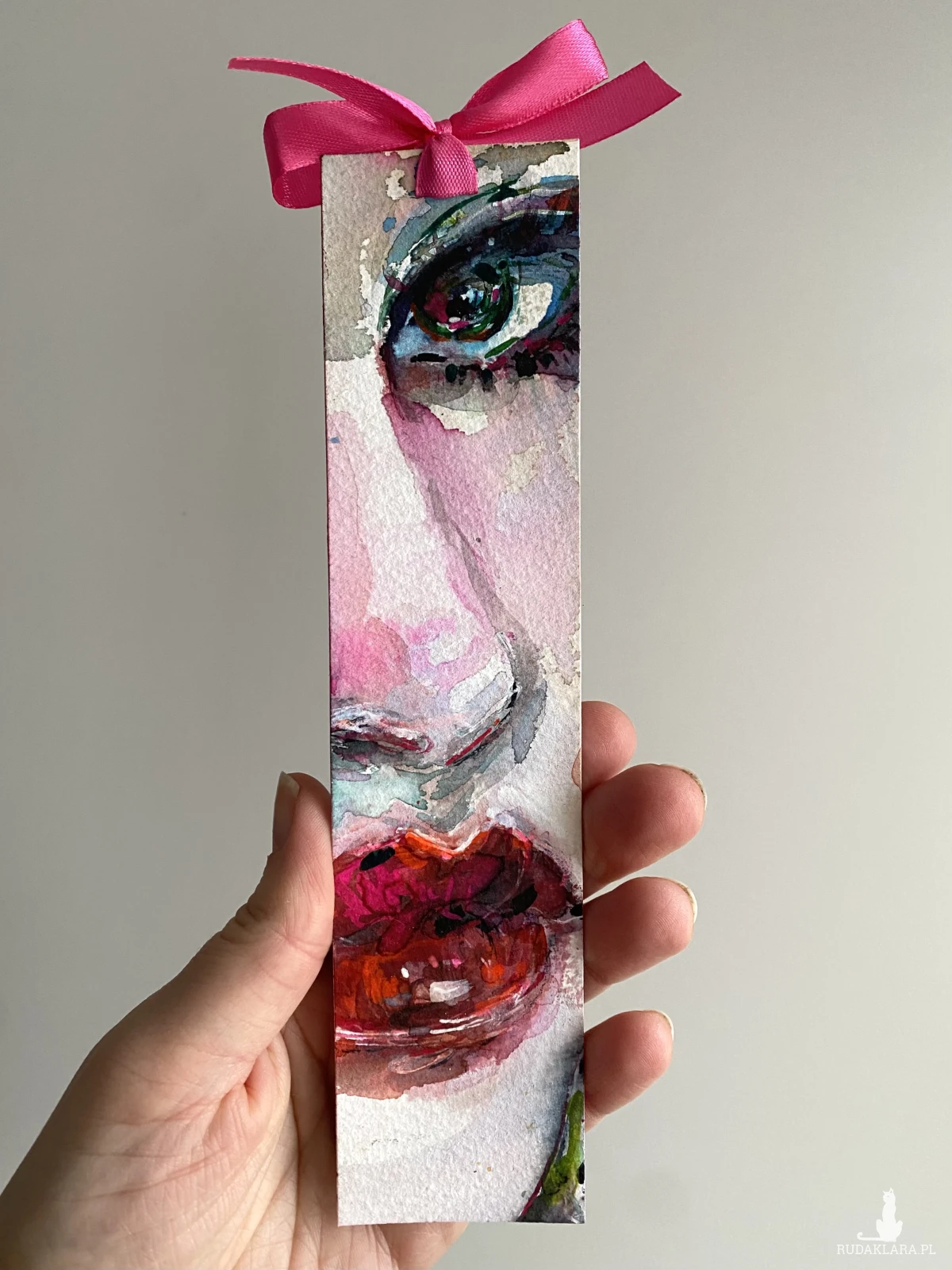 Ręcznie malowana papierowa zakładka. Przedstawia zbliżenie na piękną kobiecą twarz, w odcieniach czerwieni i różu.