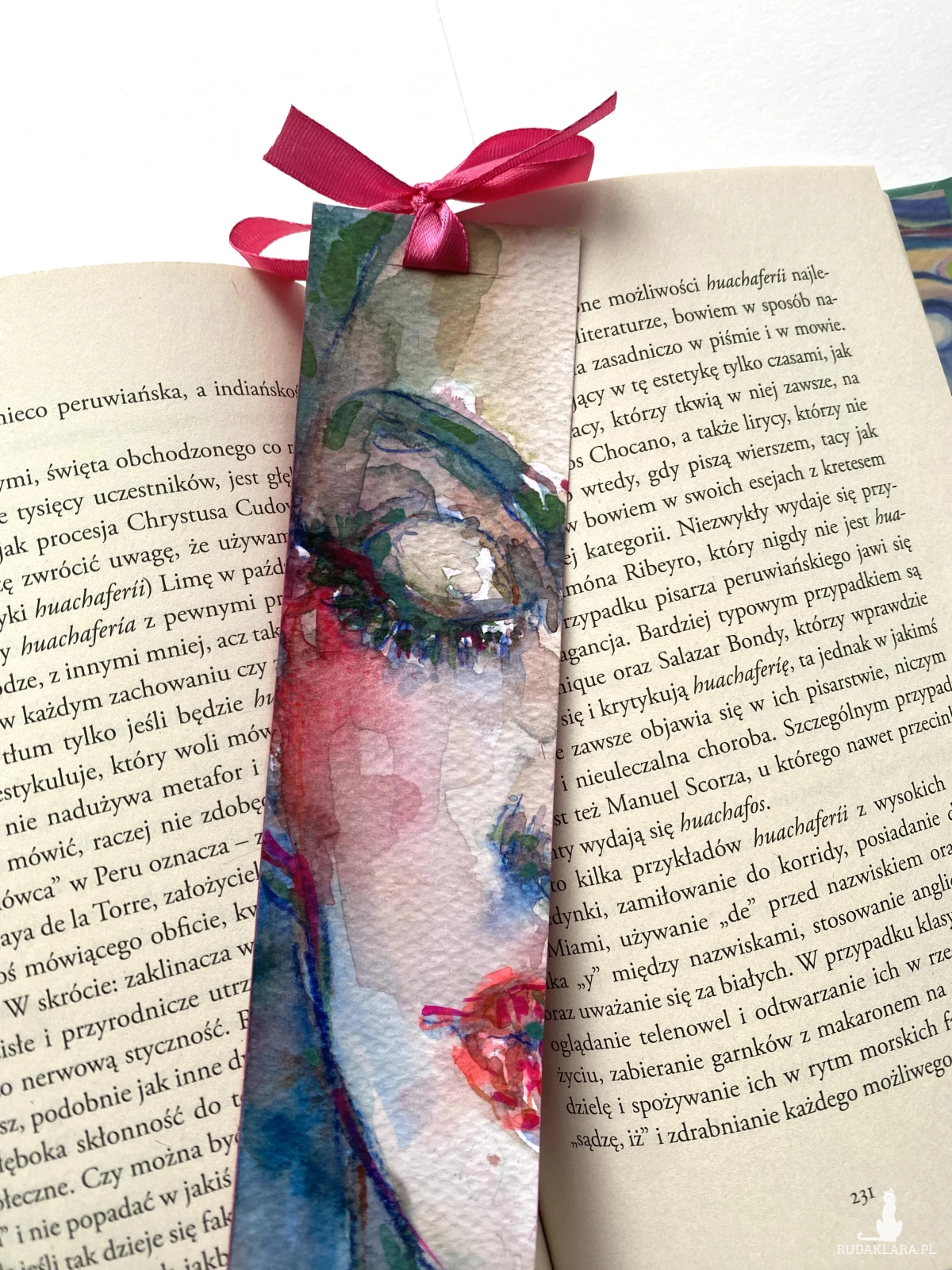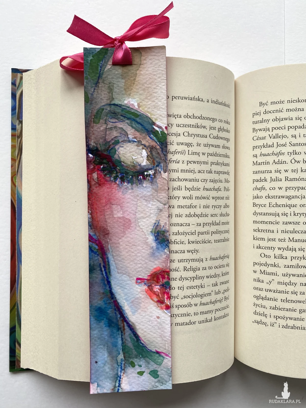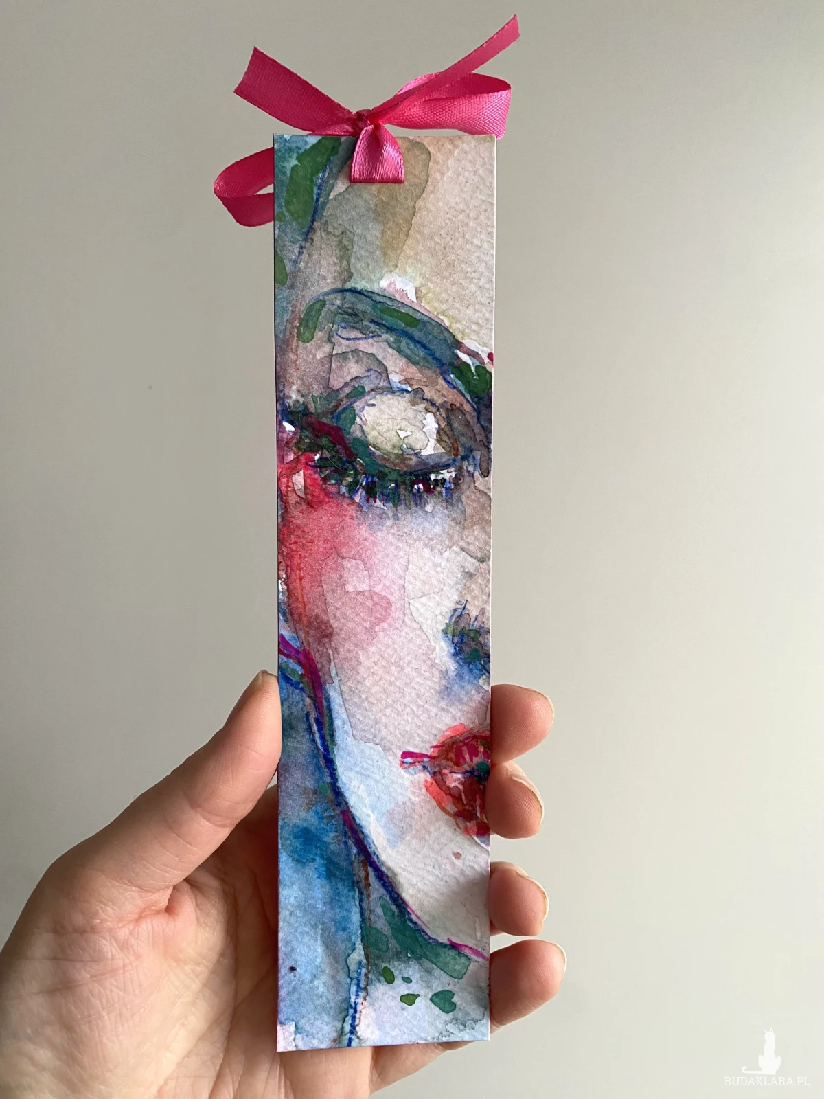 Ręcznie malowana papierowa zakładka. Przedstawia zbliżenie na piękną kobiecą twarz z zamkniętymi oczami.