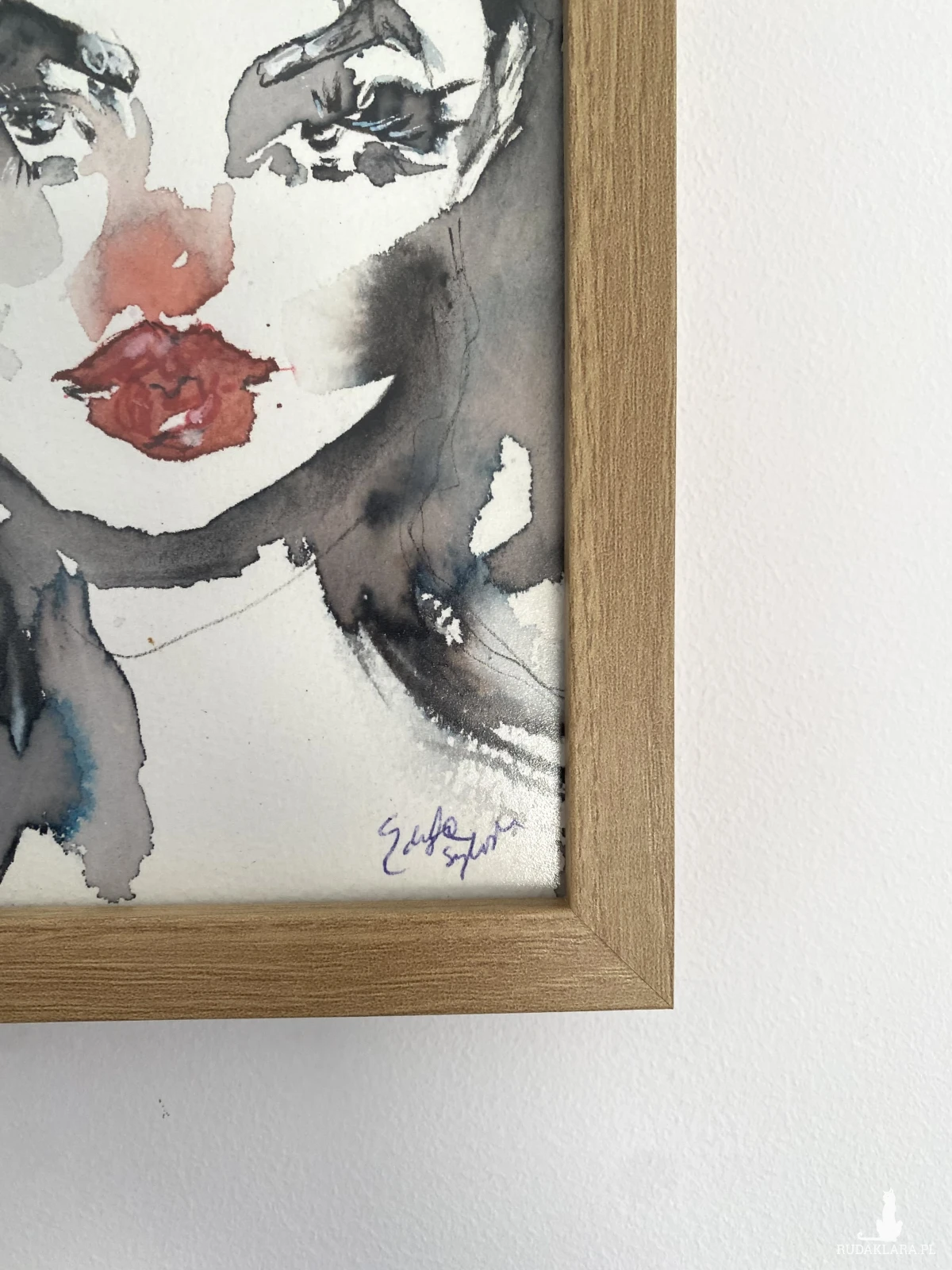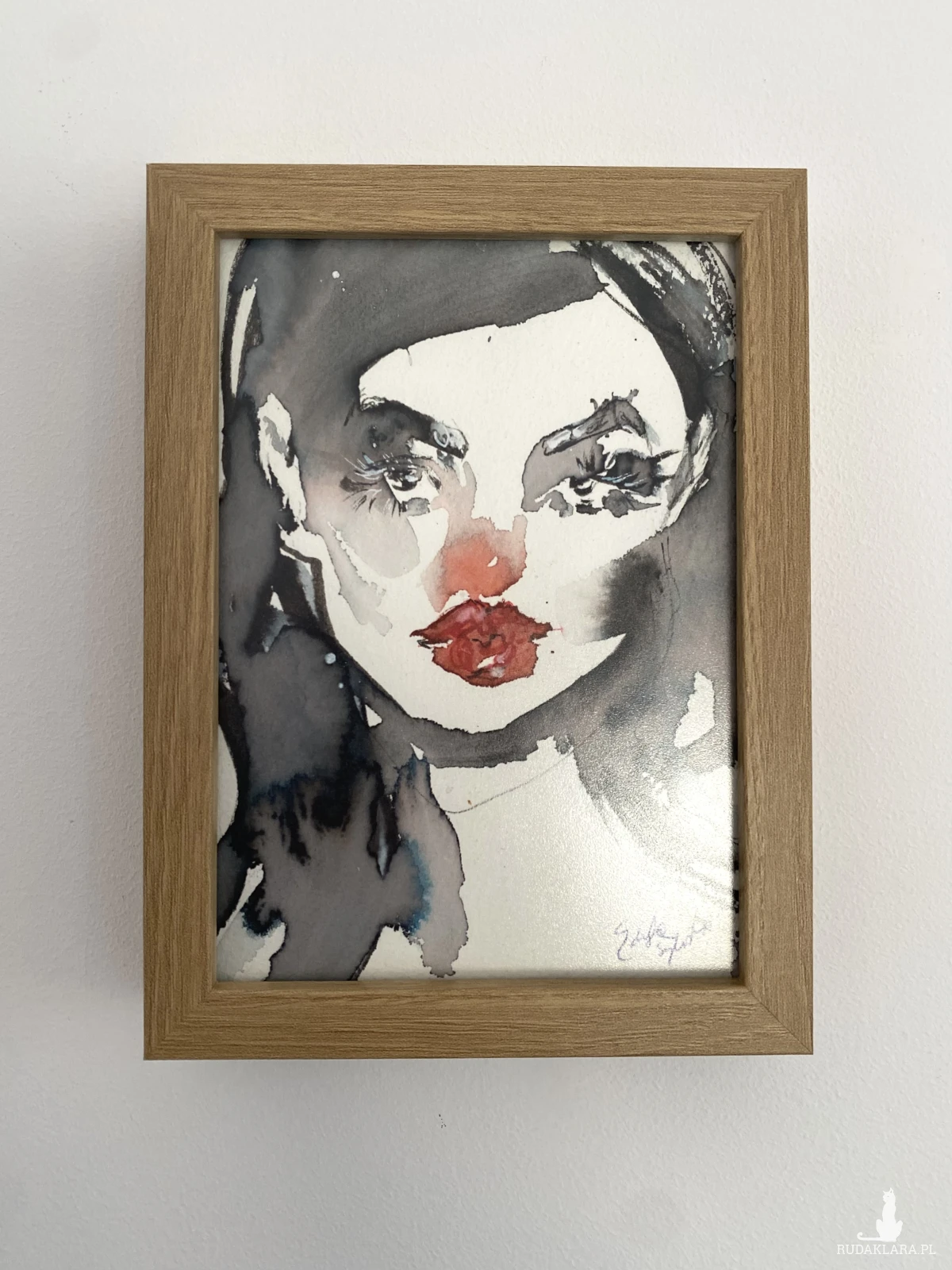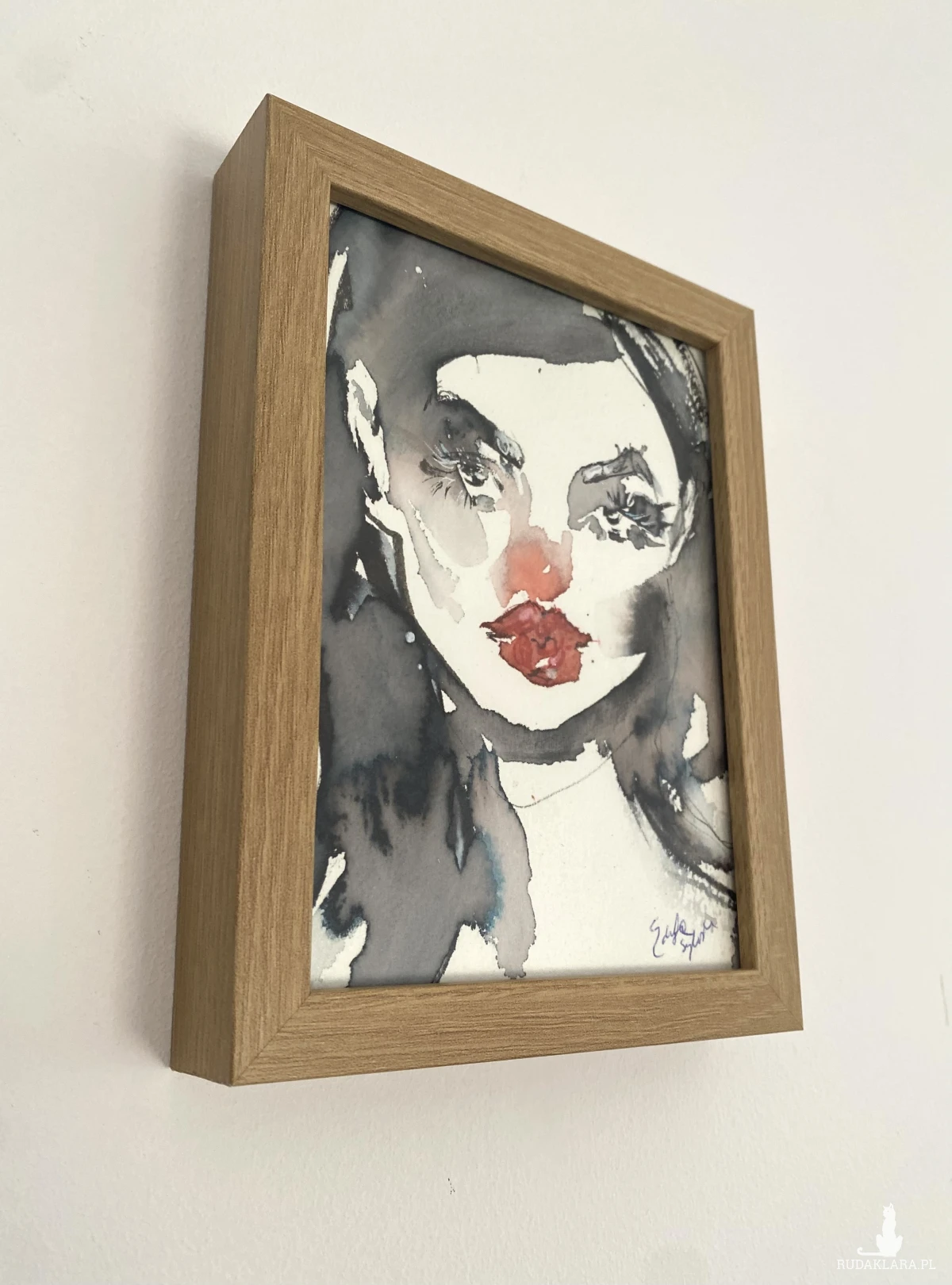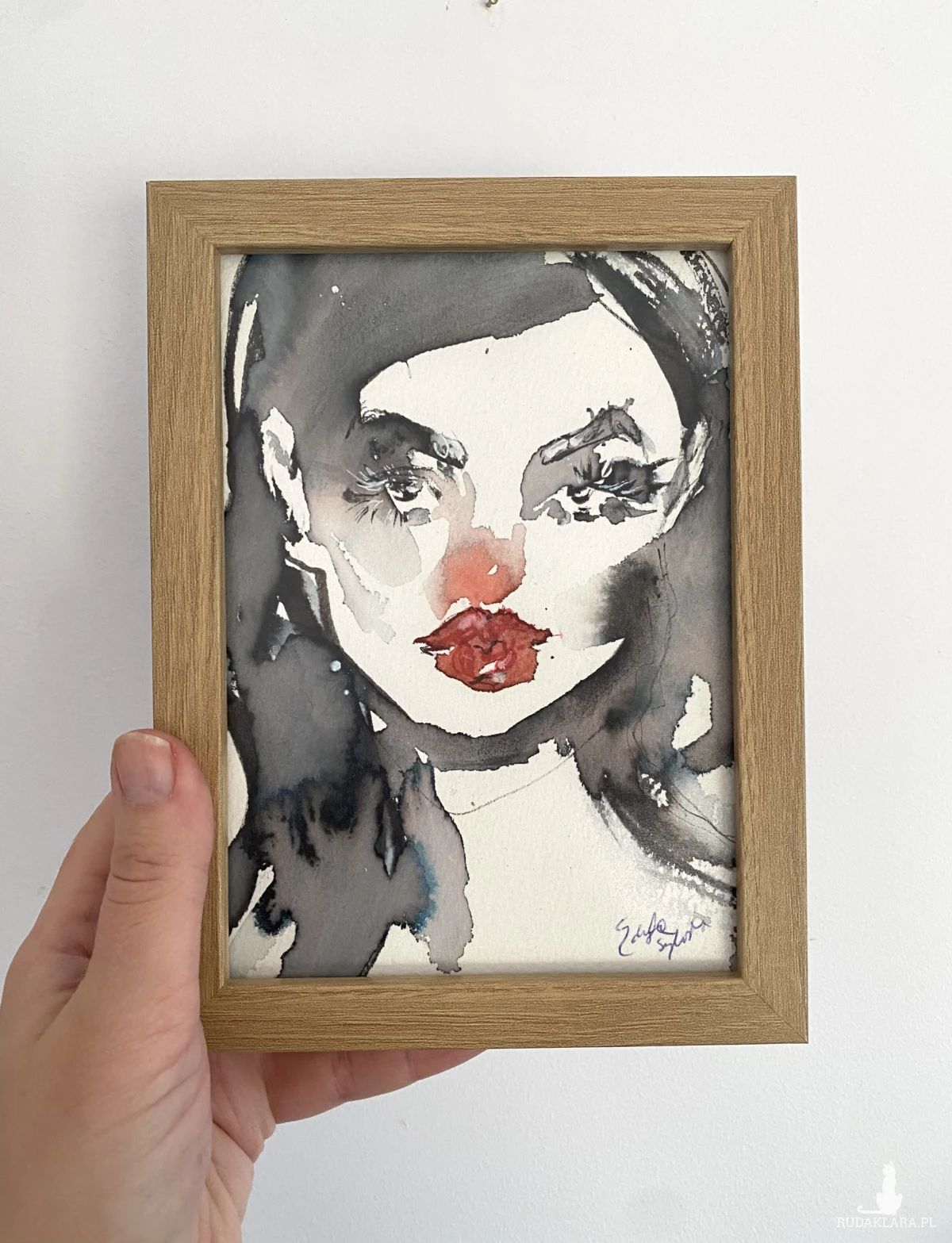 Niewielkich rozmiarów, 13x18 cm, akwarela na papierze sprzedawana w ramce ze szkłem antyrefleksyjnym. Sentymentalny, delikatny i minimalistyczny portret kobiety inspirowany modą i makijażem. Subtelna dekoracja ścienna.
