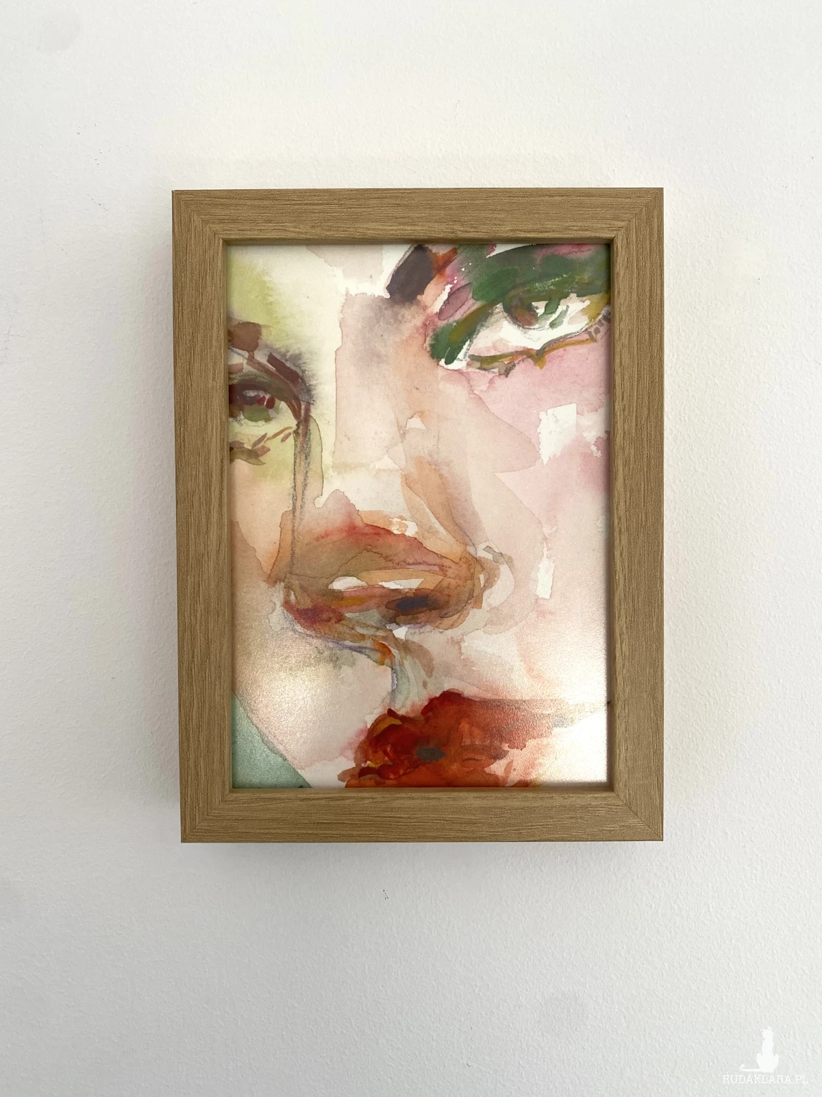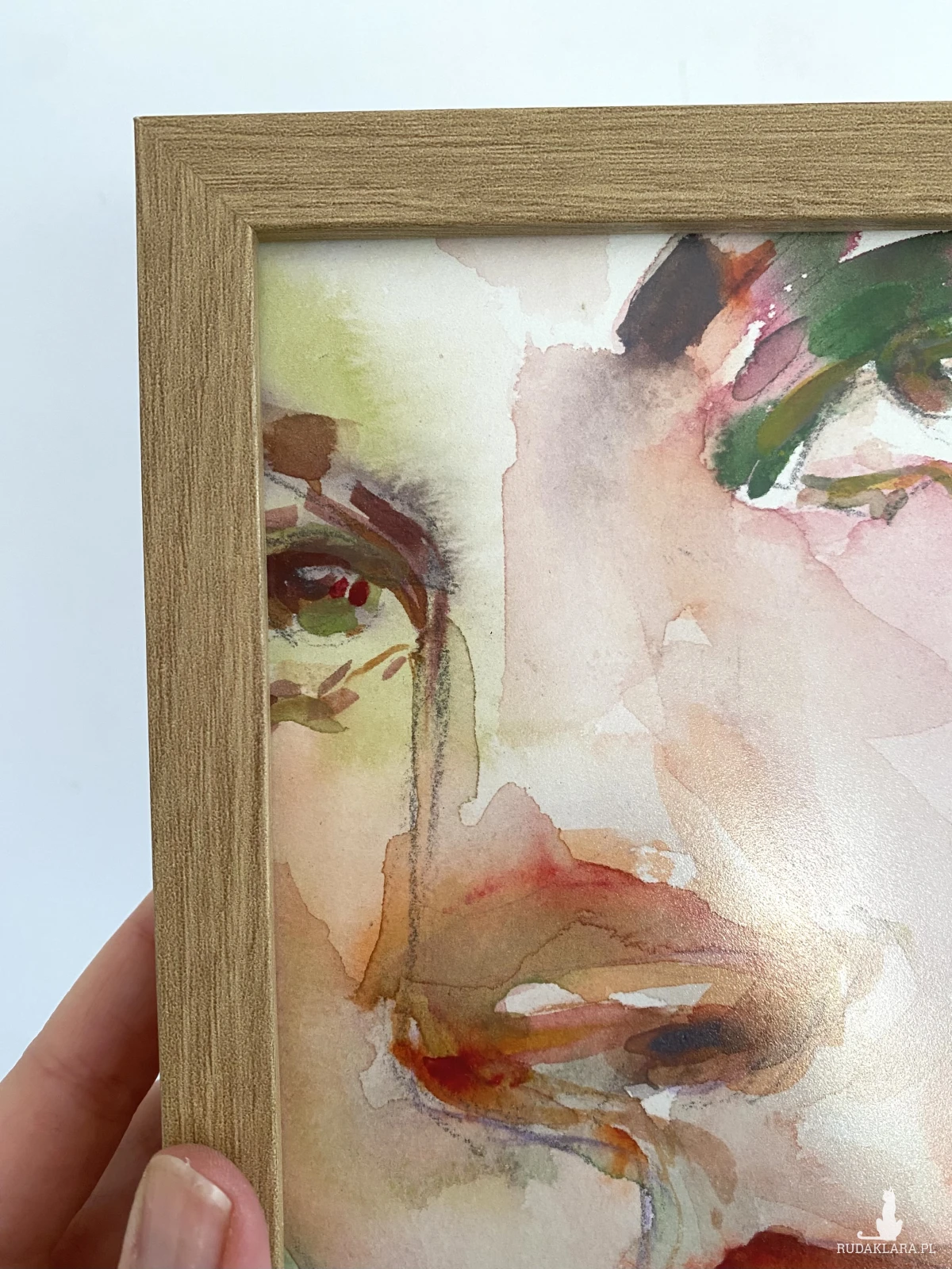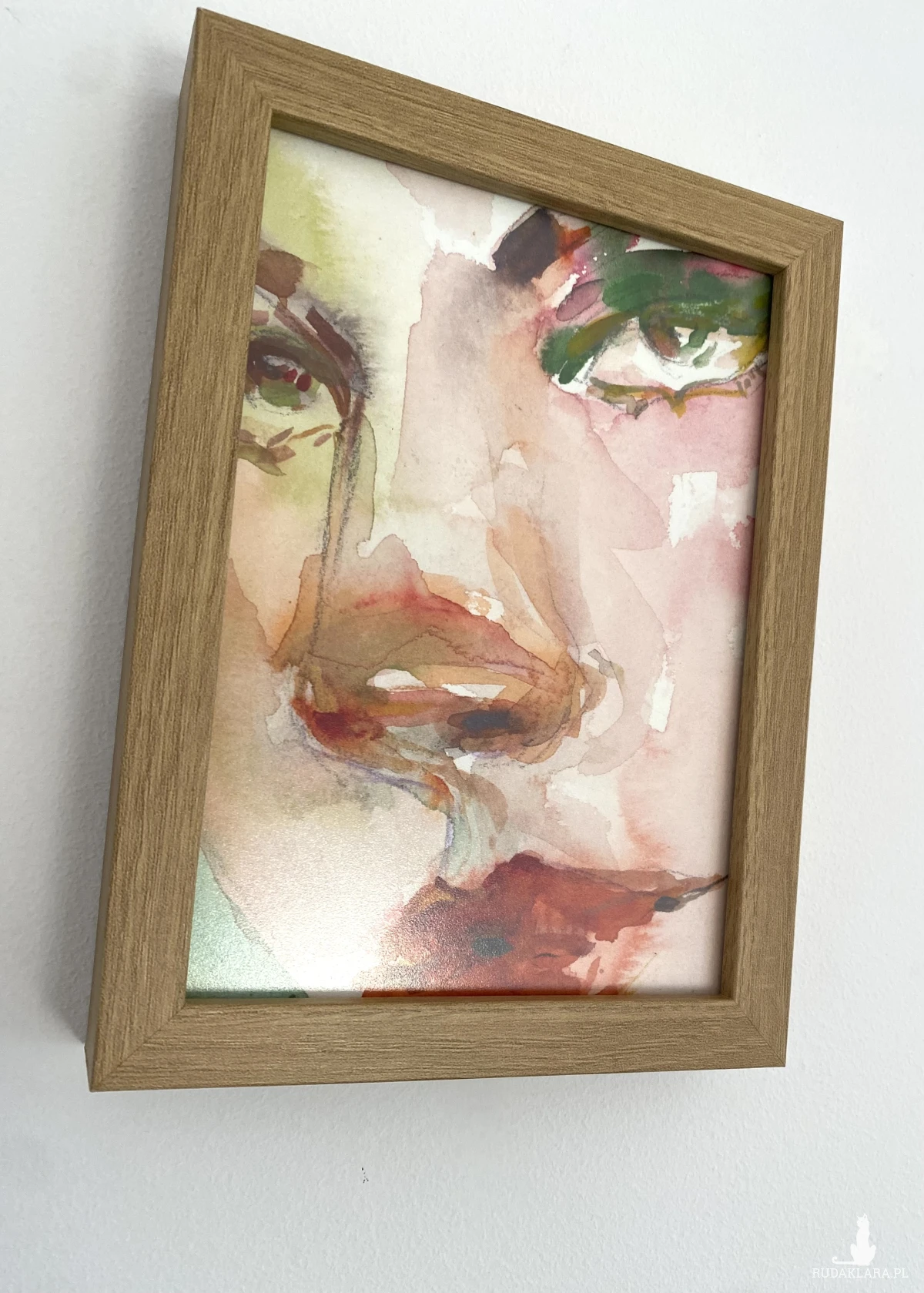 Niewielkich rozmiarów, 13x18 cm, akwarela na papierze sprzedawana w ramce ze szkłem antyrefleksyjnym. Zmysłowy, intrygujący i ekspresyjny portret kobiety inspirowany modą i makijażem. Subtelna dekoracja ścienna.