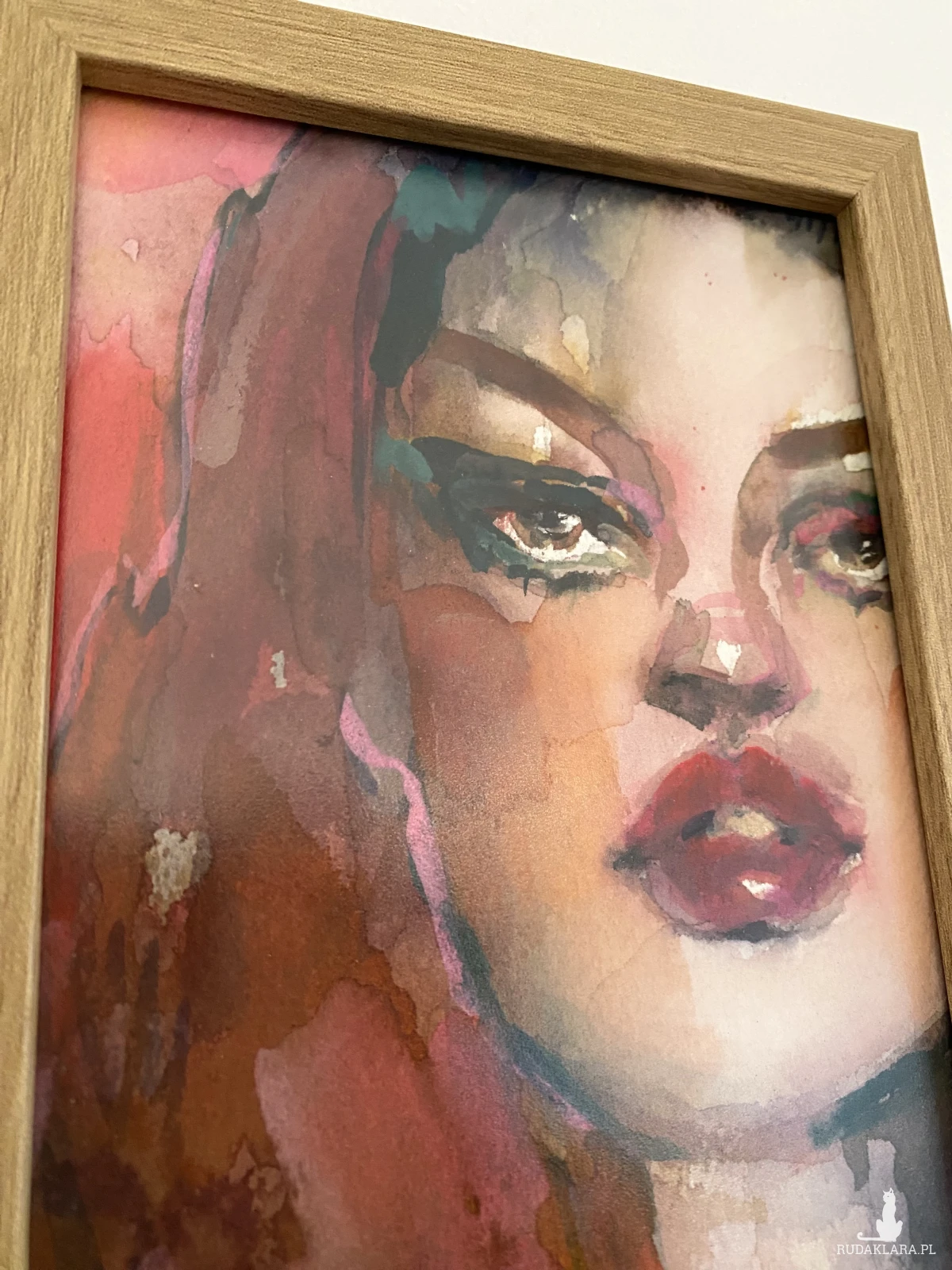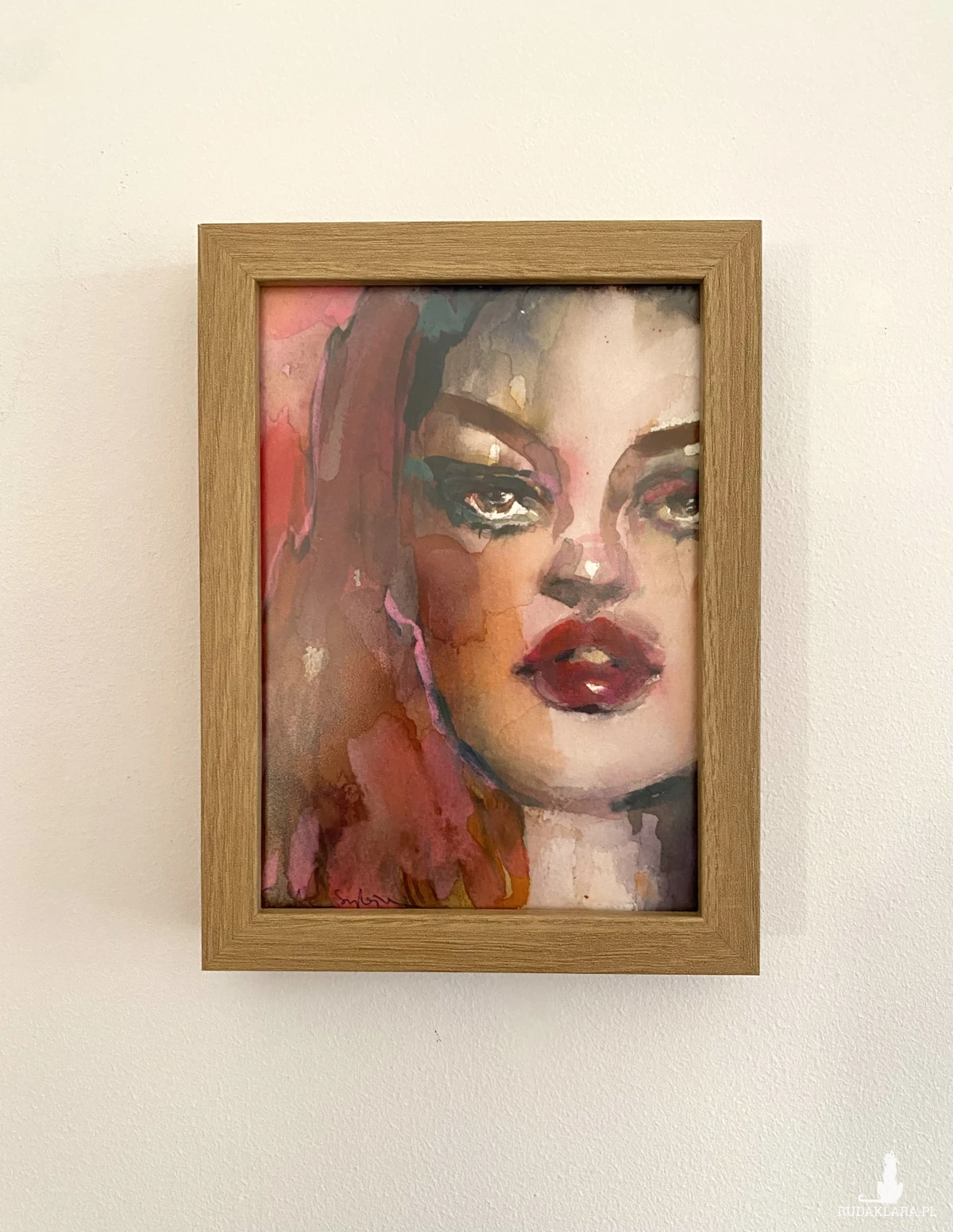 Niewielkich rozmiarów, 13x18 cm, akwarela na papierze sprzedawana w ramce ze szkłem antyrefleksyjnym. Zmysłowy, ekspresyjny portret kobiety inspirowany modą i makijażem. Subtelna dekoracja ścienna.
