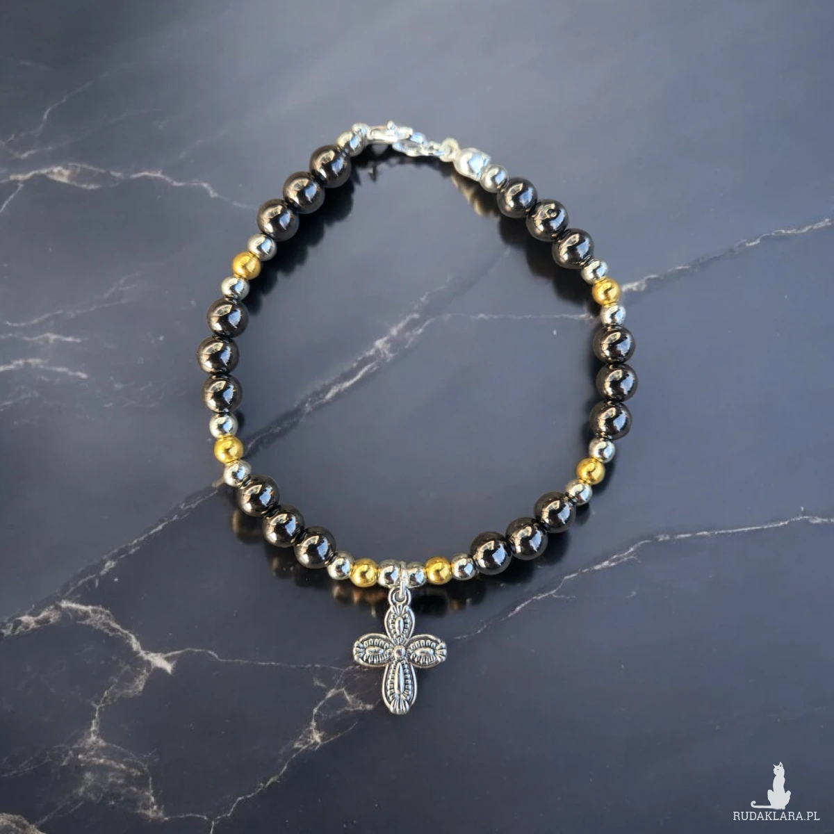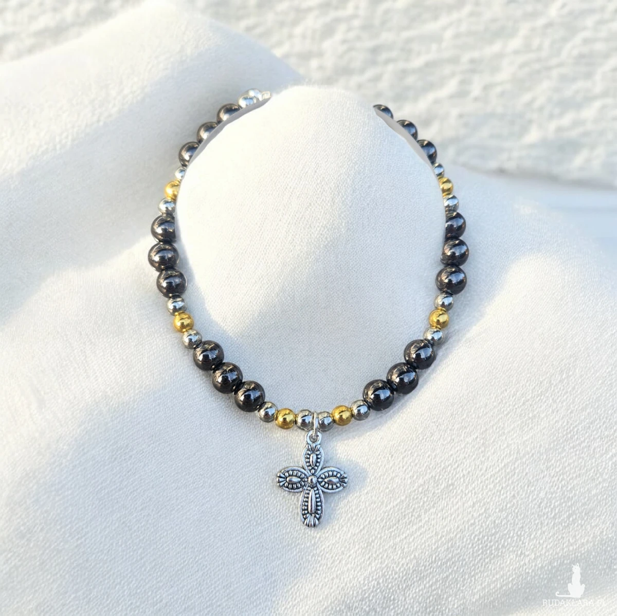 Ręcznie wykonana bransoletka z naturalnych, gładko polerowanych koralików w odcieniach grafitu, srebra i złota. Centralnym elementem jest subtelny, srebrny krzyżyk o dekoracyjnym wzorze, który nadaje całości wyjątkowego, symbolicznego charakteru.