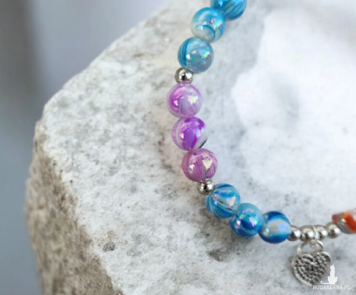 Delikatna, a jednocześnie pełna koloru bransoletka wykonana ręcznie z okrągłych, marmurkowych koralików w pastelowych odcieniach: błękitu, fioletu, zieleni oraz ciepłych tonów pomarańczu. Każdy koralik ma subtelny połysk, który pięknie odbija światło.