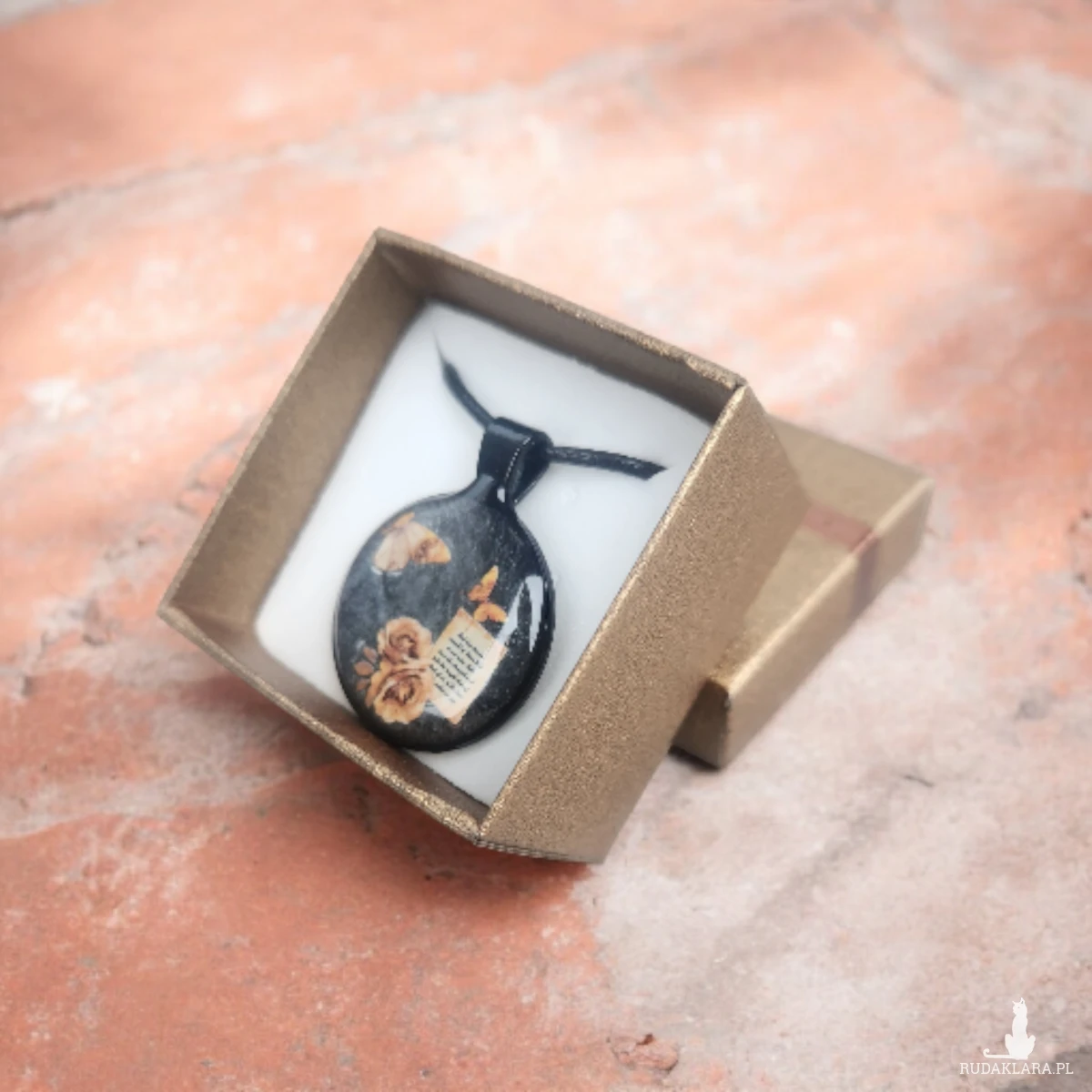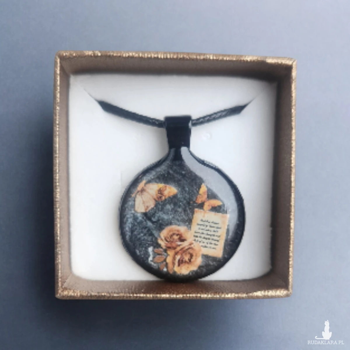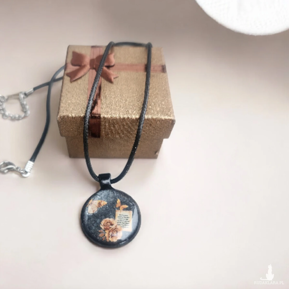 Odkryj wyjątkowy naszyjnik wykonany ręcznie z dbałością o każdy szczegół. W żywicznej zawieszce zamknięto delikatne ilustracje motyli, vintage’owe róże oraz fragment stylizowanego tekstu, tworząc niepowtarzalną kompozycję o artystycznym, nostalgicznym charakterze.