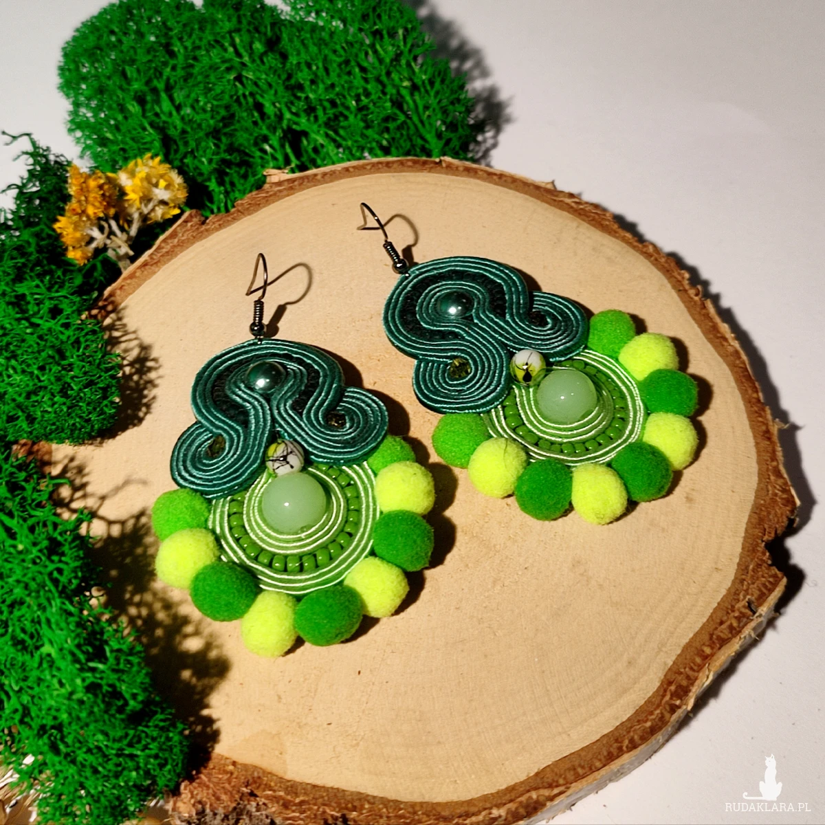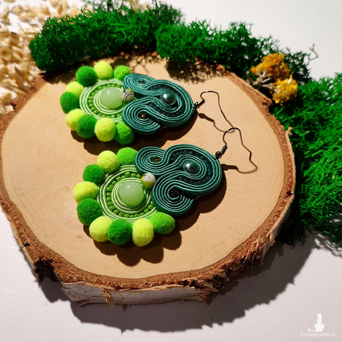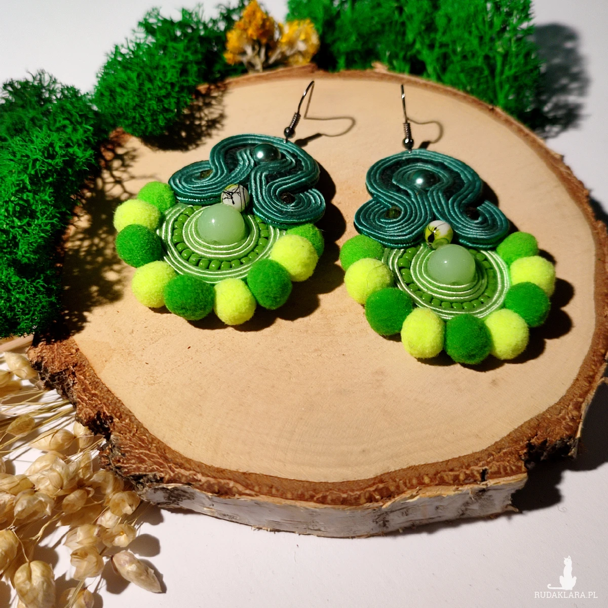 Ręcznie wykonane kolczyki metodą haftu sutasz w harmonijnych odcieniach zieleni. Kompozycja łączy eleganckie skręty soutache, delikatne koraliki oraz miękkie pompony, tworząc wyjątkowy, przyciągający wzrok design.