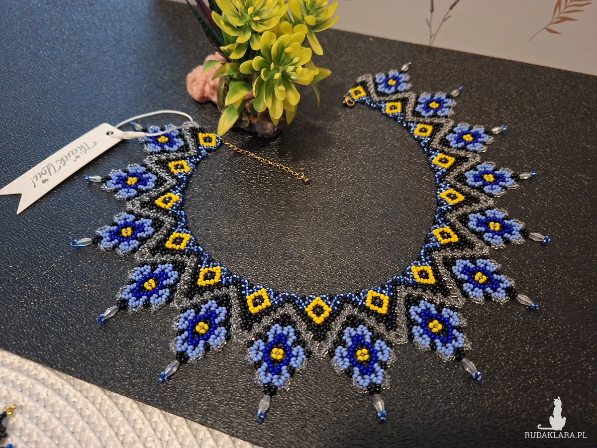 Wyraziste połączenie niebieskich kwiatów z żółtymi akcentami na tle głębokiej czerni tworzy biżuterię, która nie tylko zdobi, ale niesie ze sobą duszę i historię.