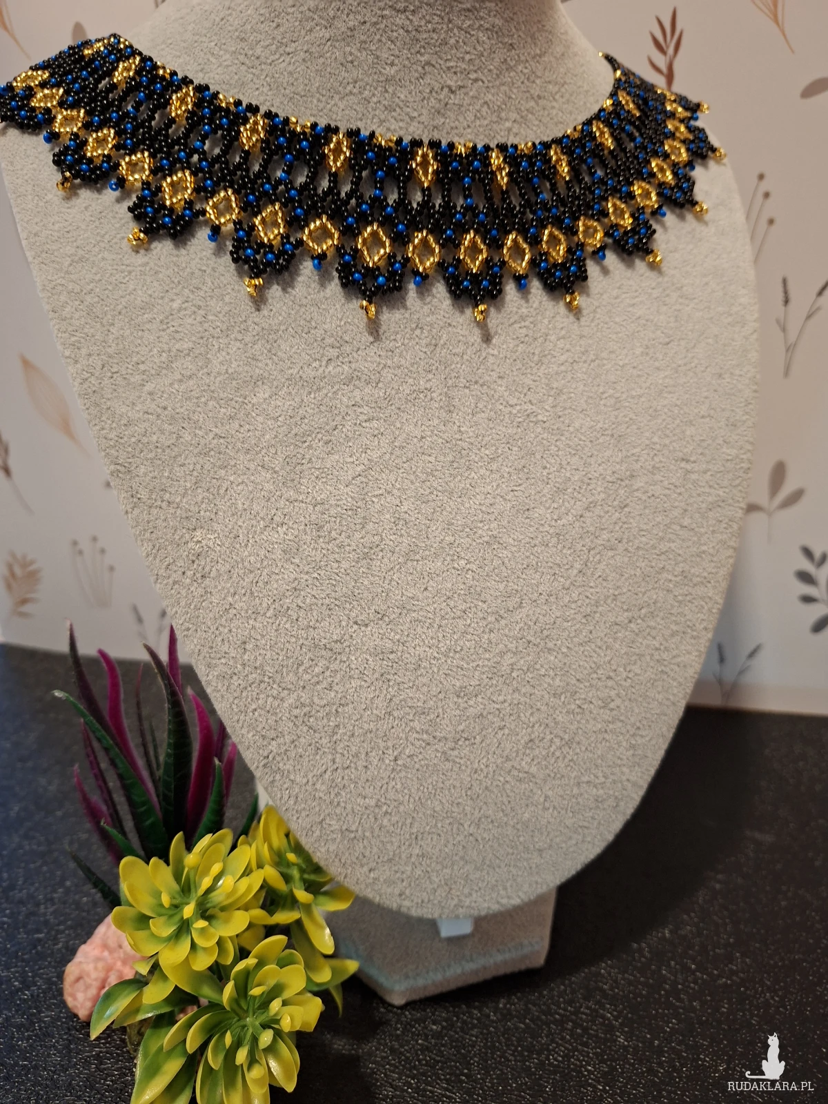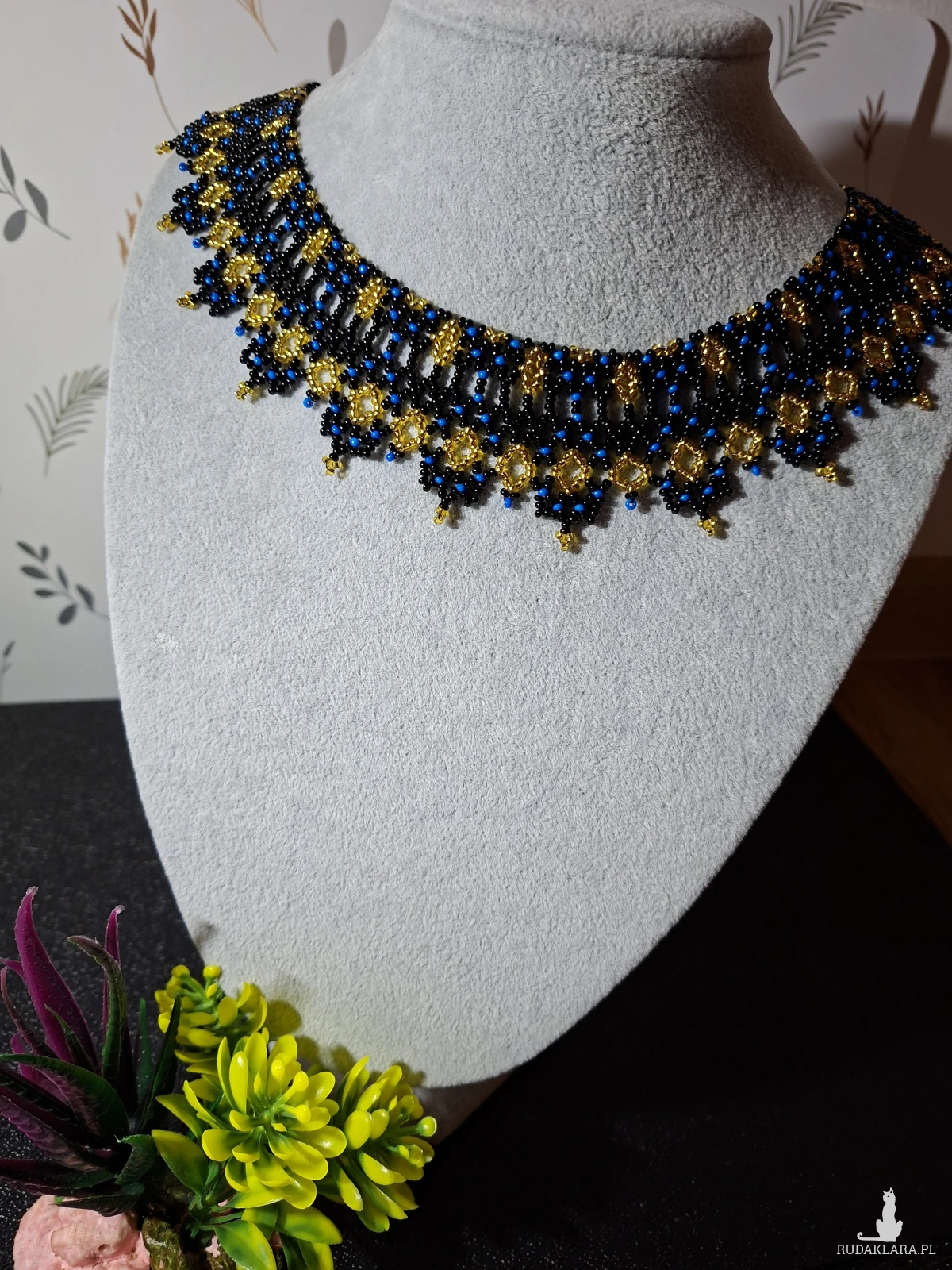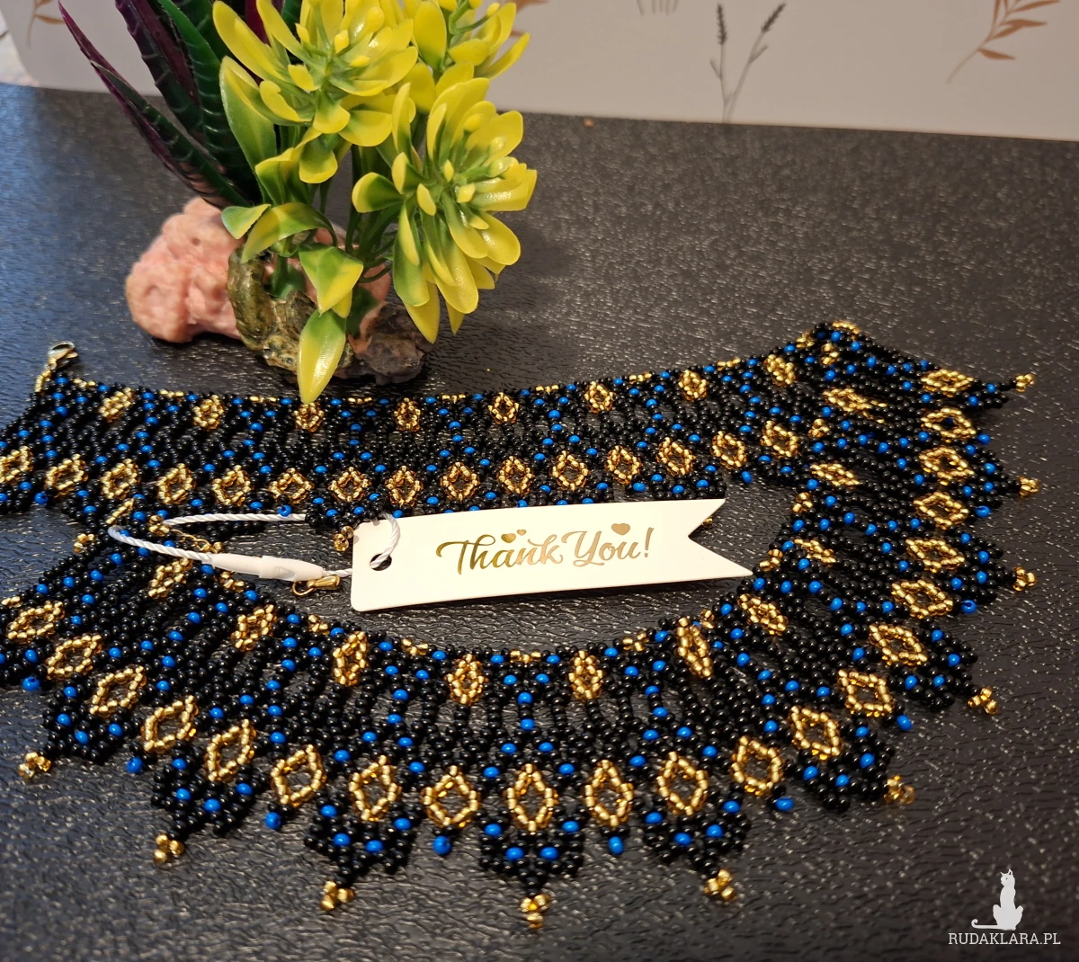 Połączenie głębokiej czerni z królewskim błękitem i złotymi akcentami sprawia, że naszyjnik wygląda niezwykle luksusowo i stylowo.