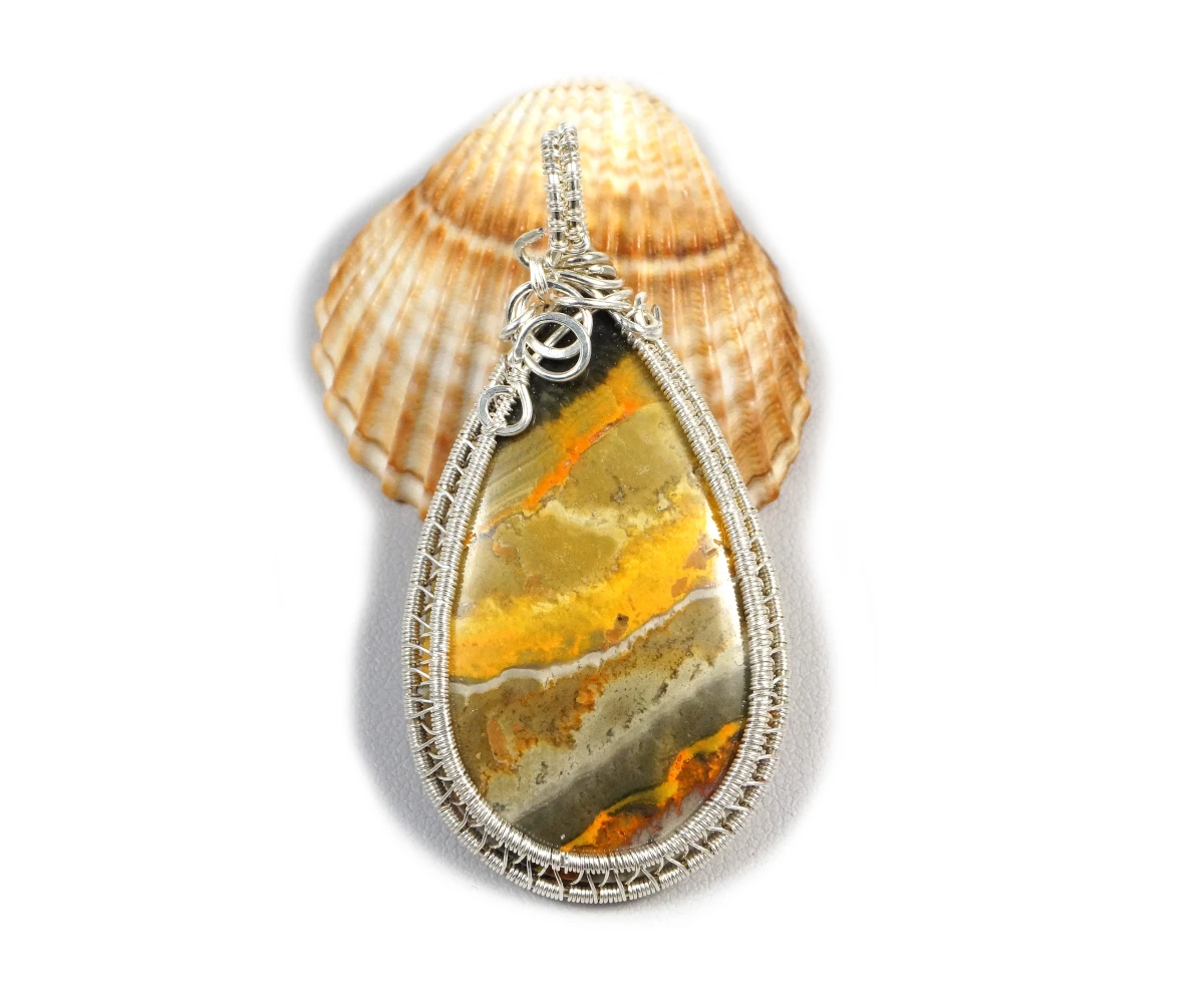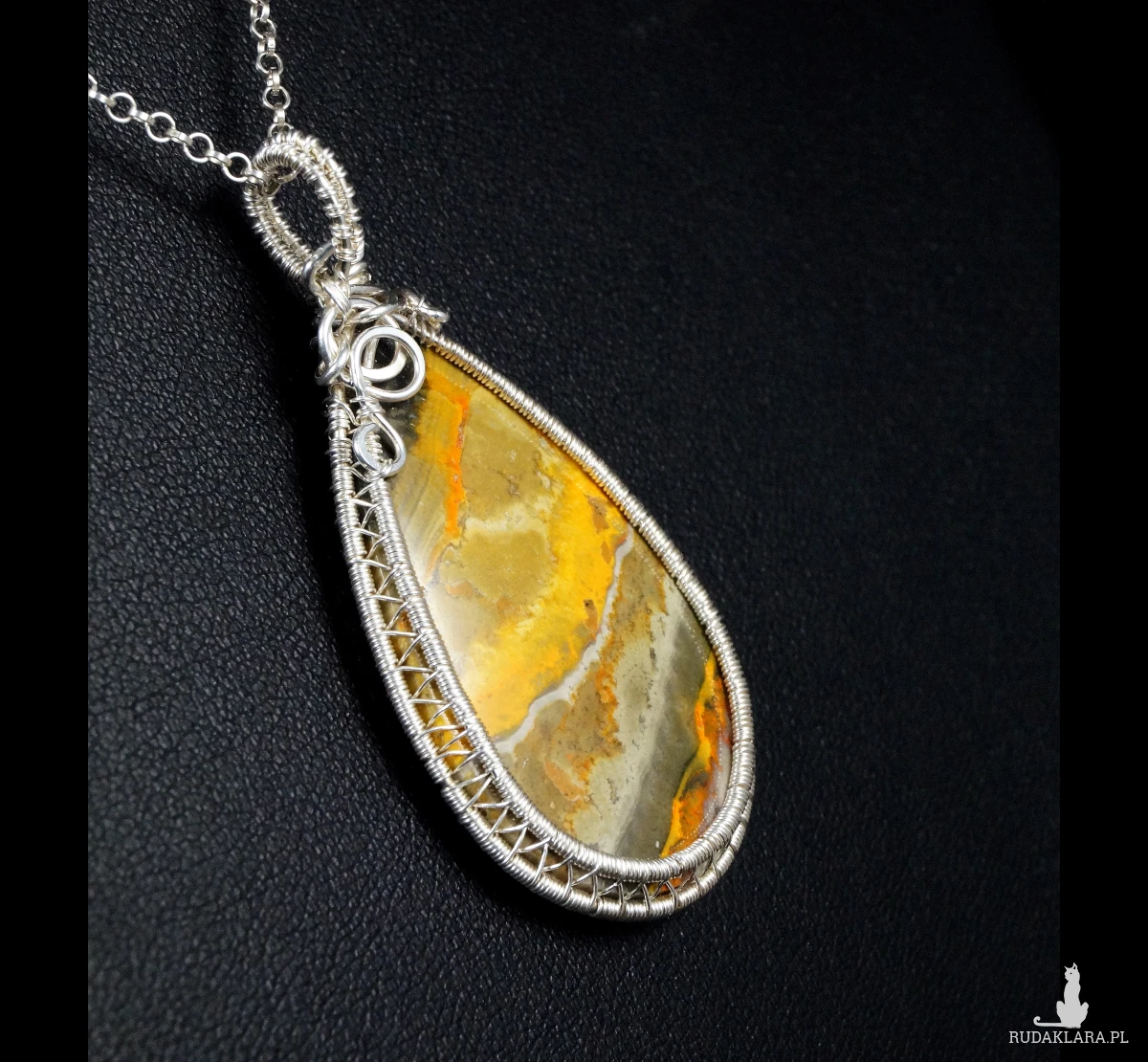 Bajeczny, misternie pleciony wisior z kaboszonem jaspisu bumbelbee w żółto szarym kolorze.