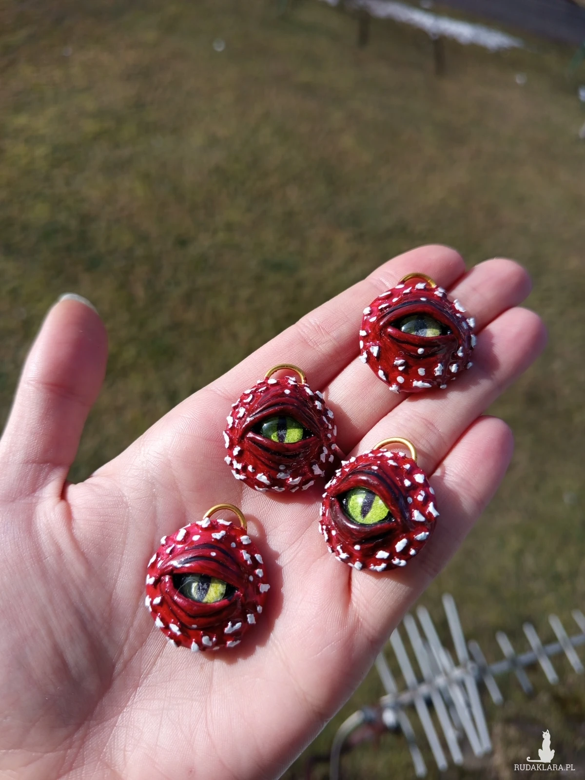 Ten niezwykły naszyjnik w kształcie kapelusza muchomora skrywa w sobie tajemnicze oko, nadając mu mistycznego i lekko niepokojącego charakteru. Rzeźba została ręcznie wykonana z glinki polimerowej i utrzymana w naturalnych barwach muchomora – czerwieni, bieli i subtelnych cieni inspirowanych leśnym runem.