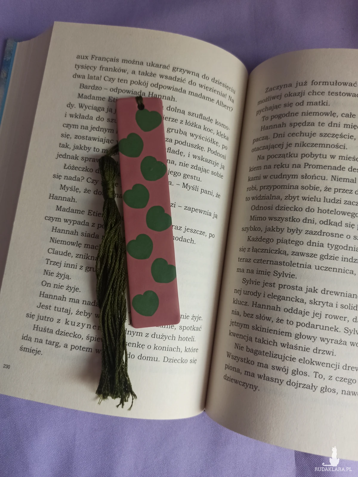 Zakładka do książki wykonana z wysokiej jakości gliny polimerowej w kolorze brudnego różu z serduszkami w kolorze ciemnej zieleni.