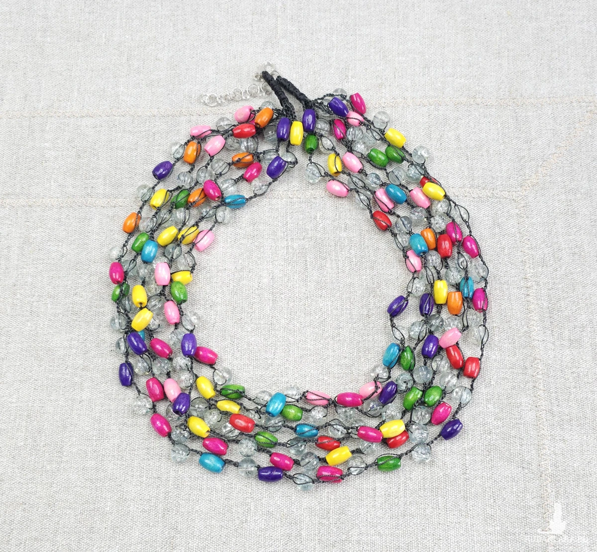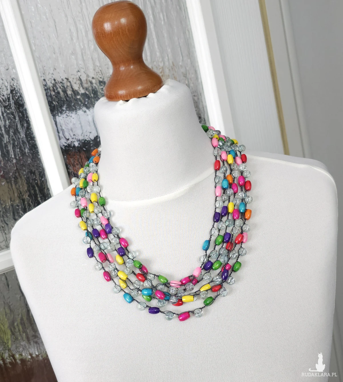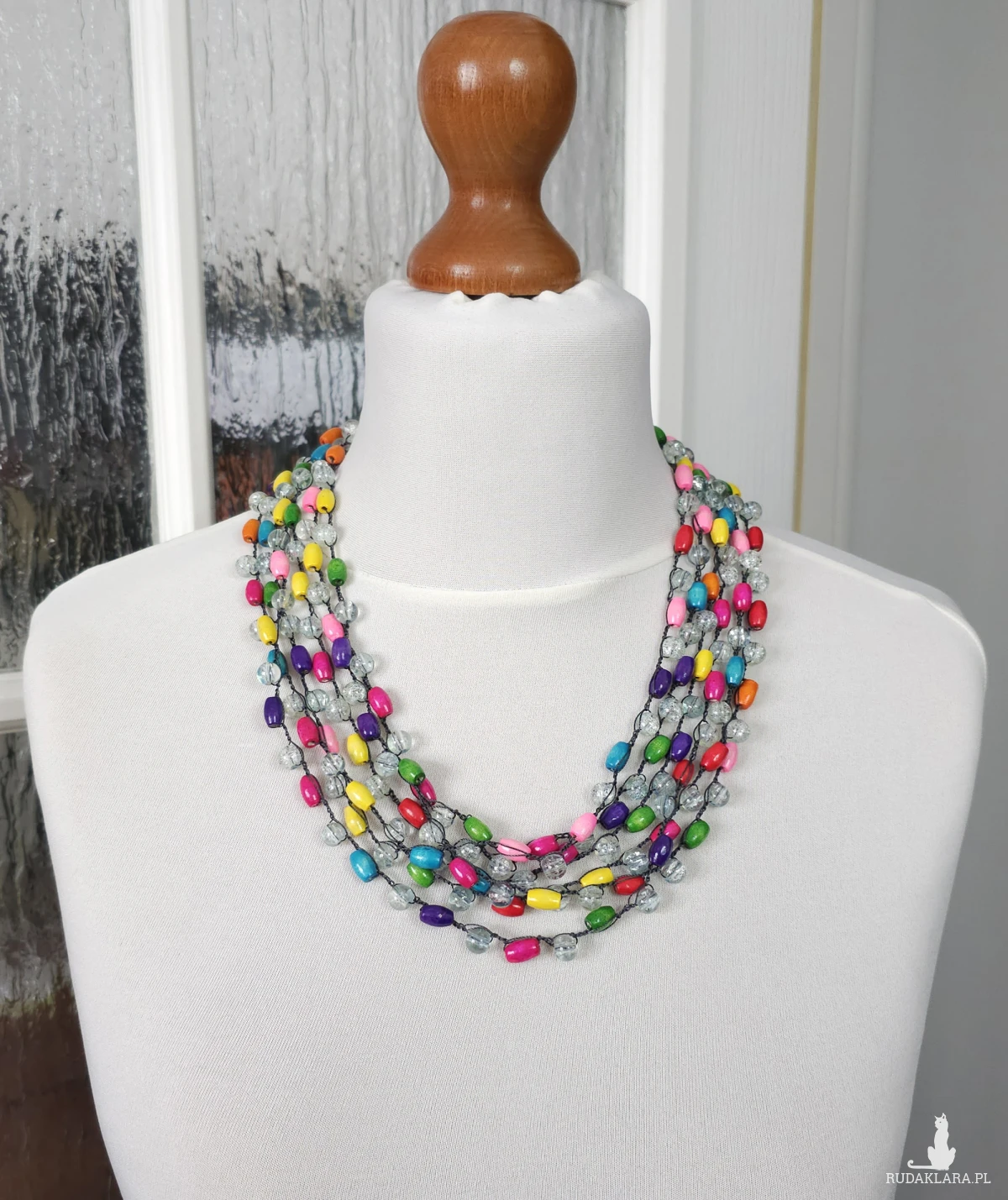 Lekki, wielorzędowy naszyjnik wykonany z kolorowych, drewnianych koralików przeplatanych przezroczystymi elementami o strukturze spękanego szkła.