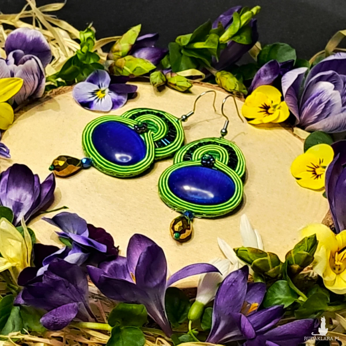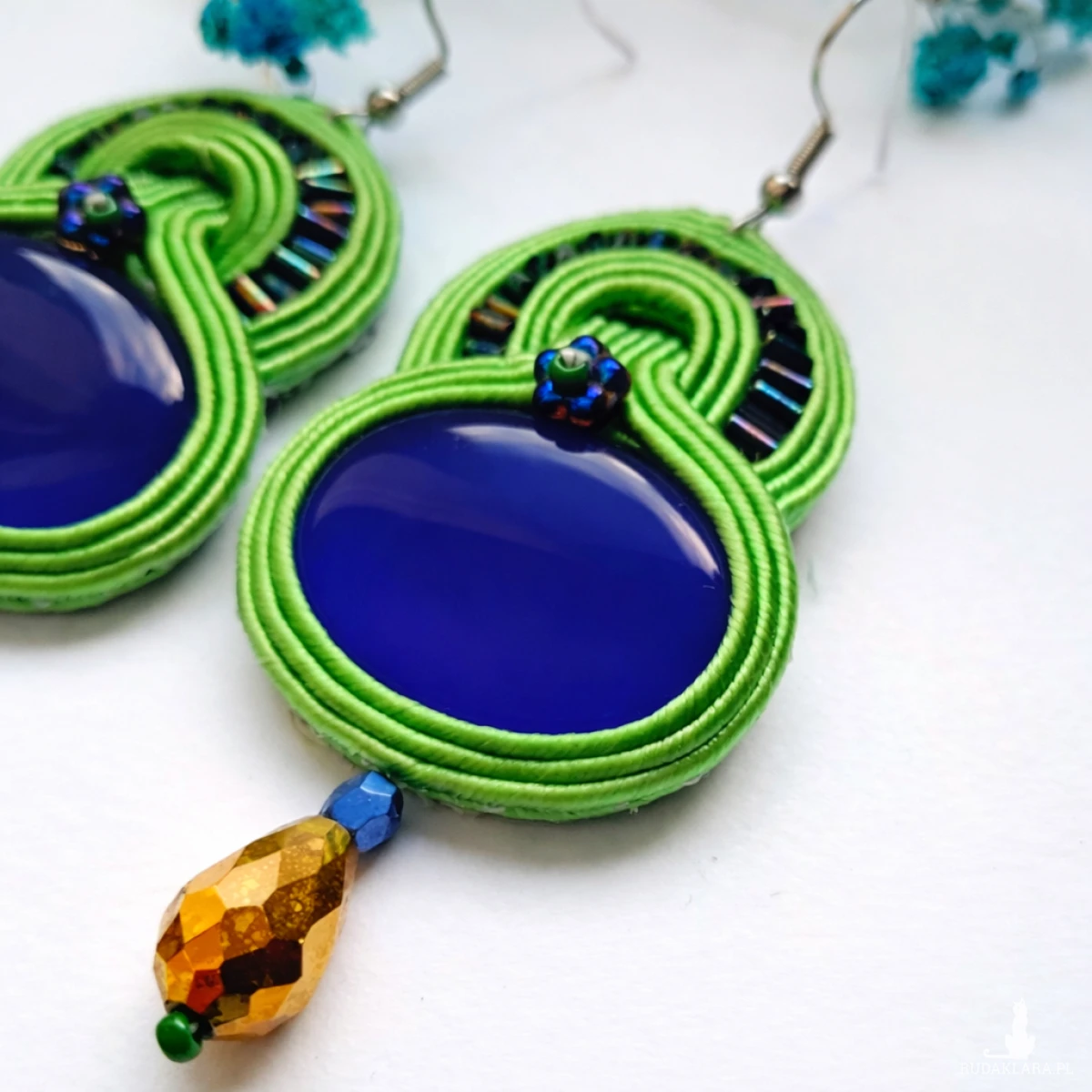 Te wyjątkowe kolczyki zostały wykonane ręcznie techniką haftu soutache (sutasz). Centralnym elementem kompozycji jest efektowny kaboszon typu „kocie oko” w intensywnym chabrowym kolorze, który pięknie odbija światło i nadaje biżuterii elegancji.