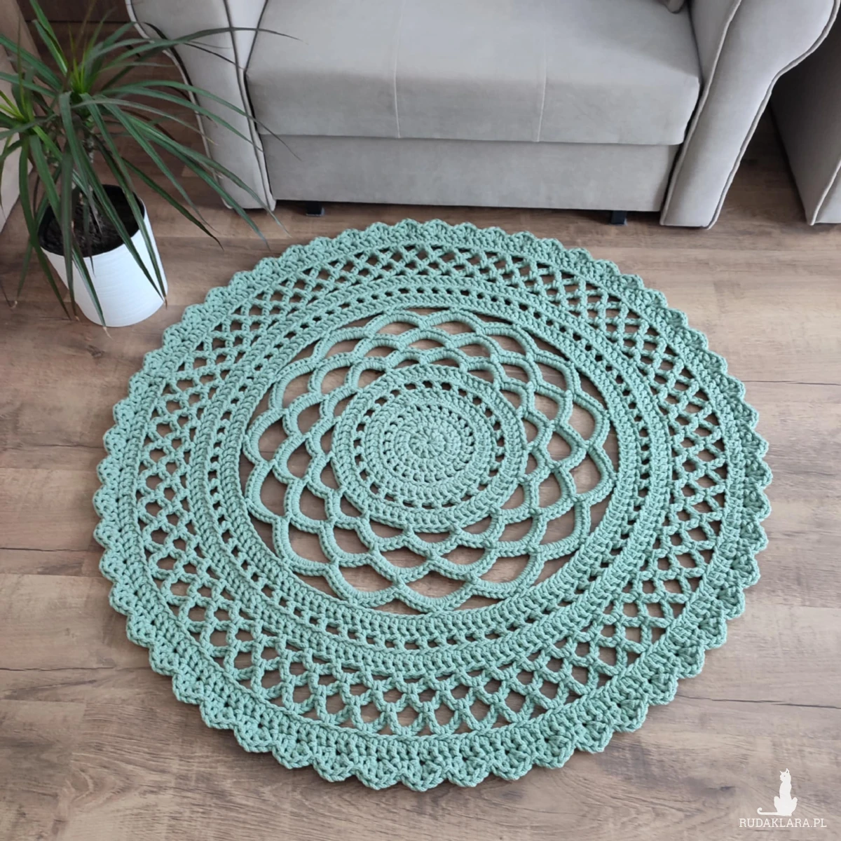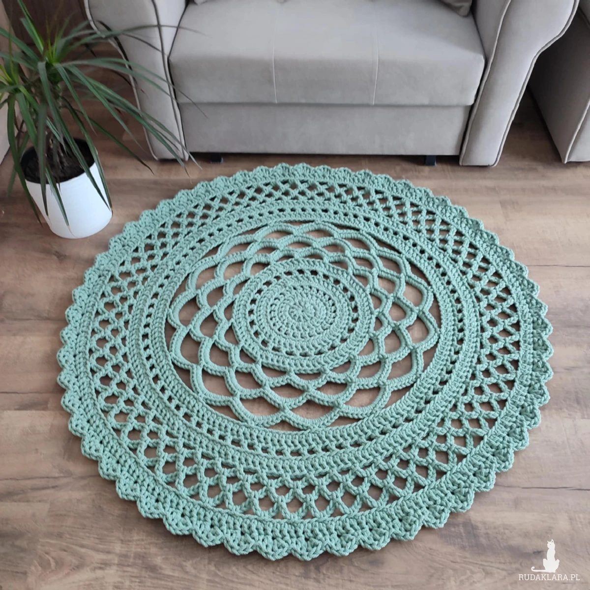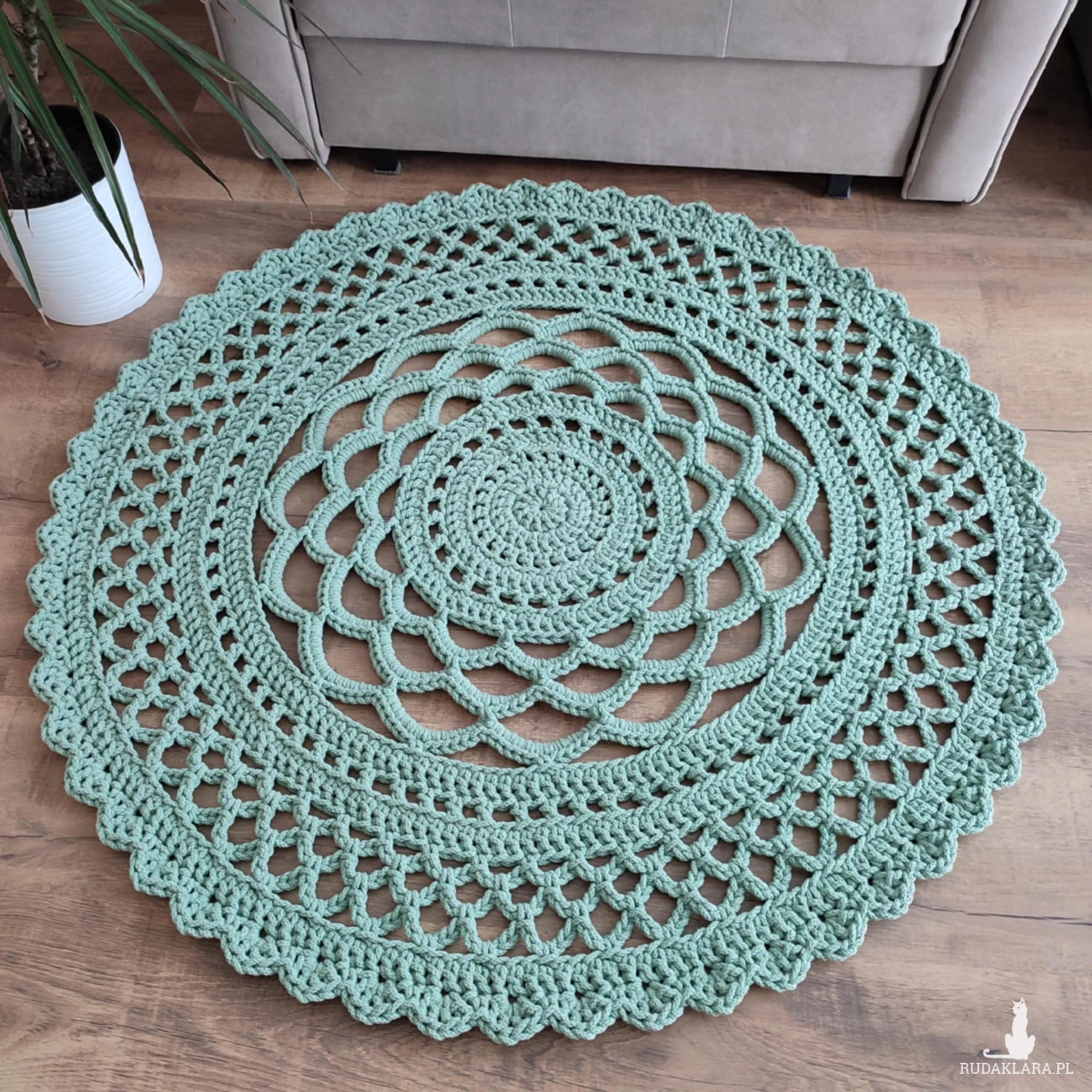Dywan o średnicy 110cm, wykonany metodą szydełkowania z polskiego sznurka bawełnianego 5mm.