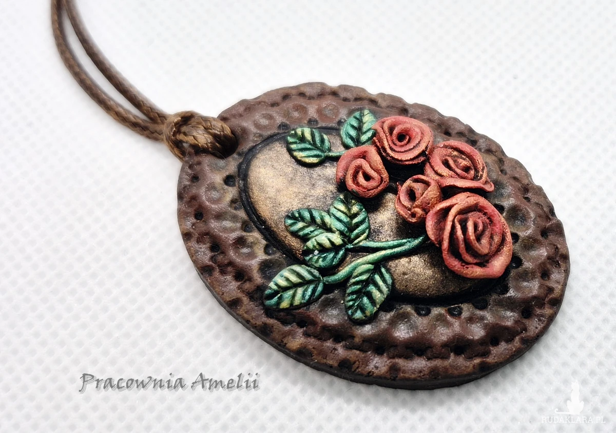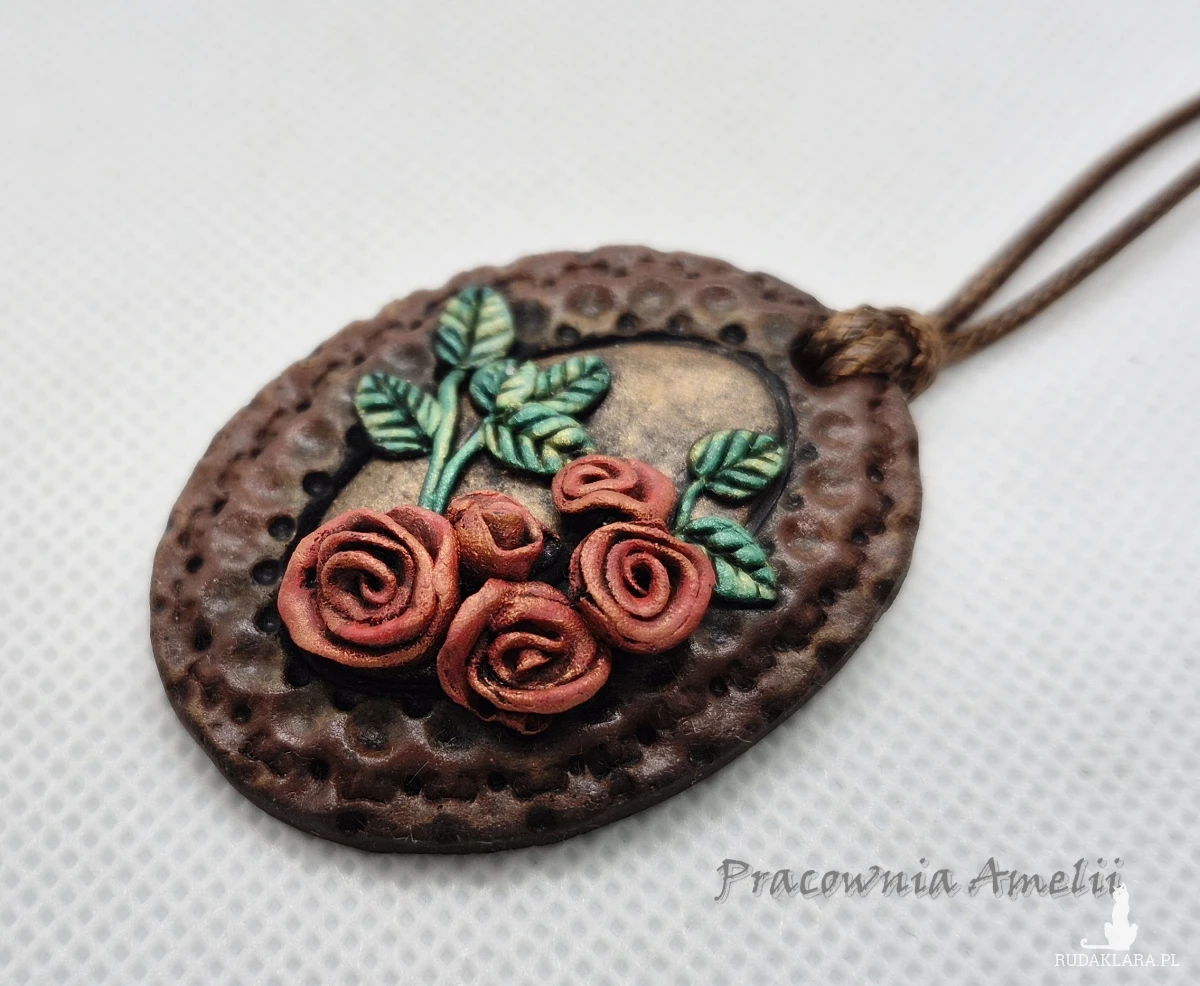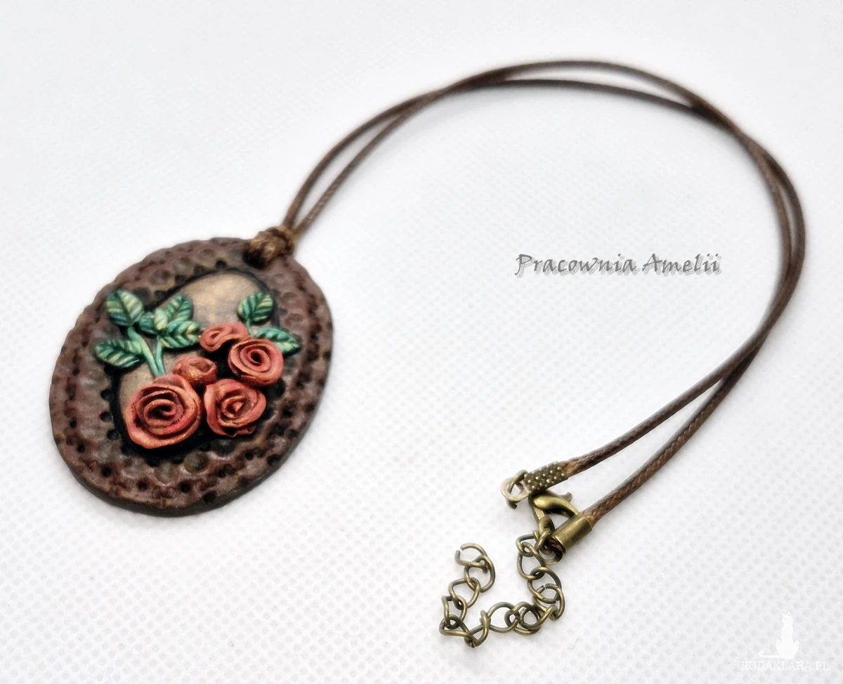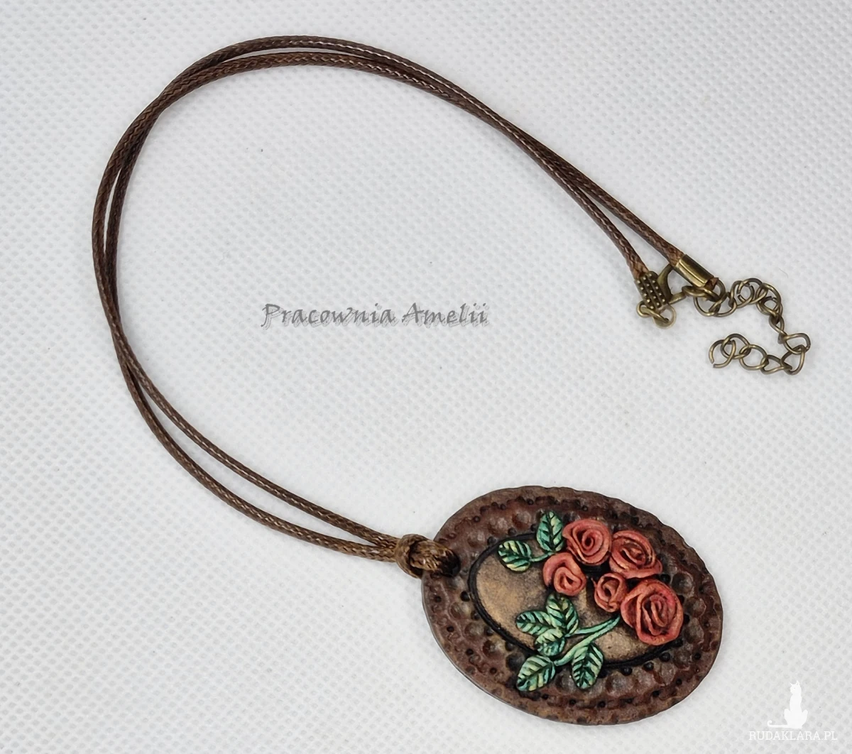 Wisiorek wykonany z gliny polimerowej zawieszony na brązowym powlekanym sznureczku zapinanym na karabińczyk. Projekt własny, wykonany tylko w jednym egzemplarzu. Biżuteria z gliny polimerowej jest trwała i uniwersalna. Idealna na oryginalny prezent w atrakcyjnej cenie.