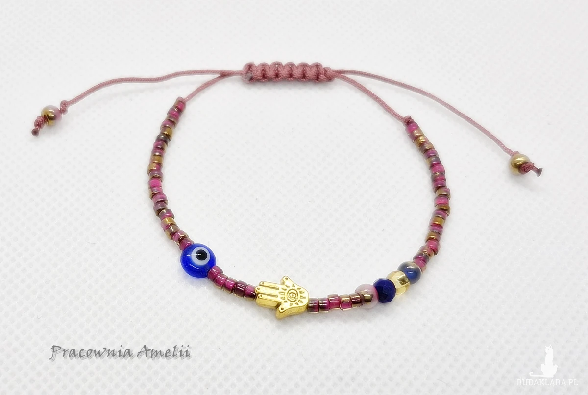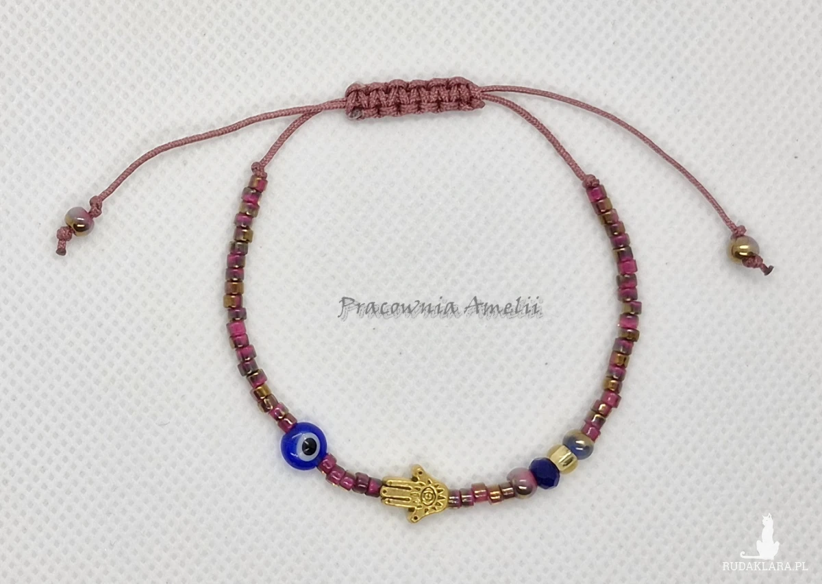 Bransoletka ochronna na sznurku nylonowym w kolorze ciemnego indyjskiego różu (kolor tego sznurka określany jest też jako kolor czerwonej fasoli) z dodatkiem szklanych koralików i metalowej chamsy (stop cynku). Rozmiar uniwersalny.