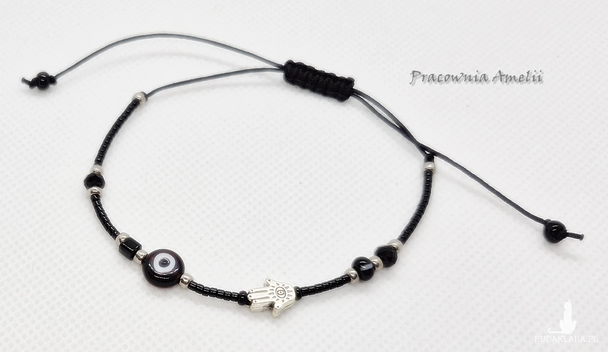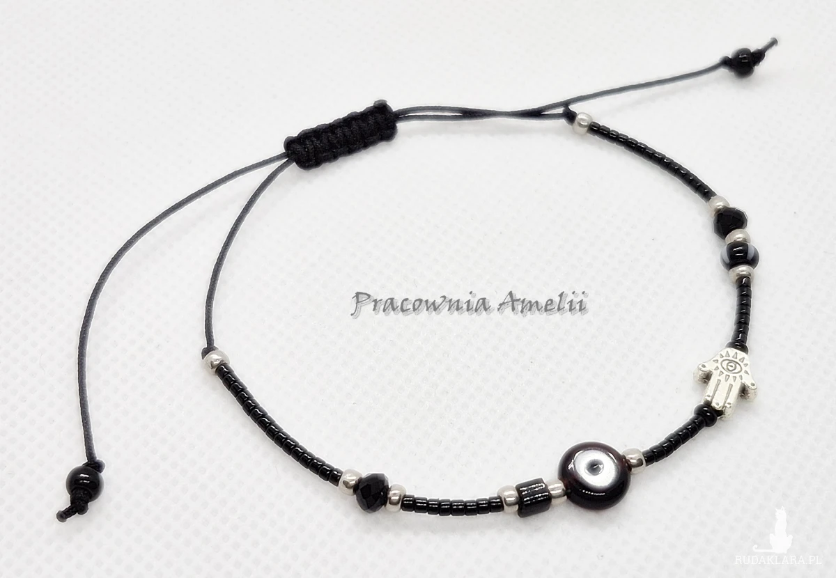 Bransoletka ochronna na czarnym sznurku nylonowym z dodatkiem szklanych koralików (w tym Miyuki i Toho) i metalowej chamsy (stop cynku). Rozmiar uniwersalny. Srebrne galwanizowane koraliki Toho są odporne na ścieranie.