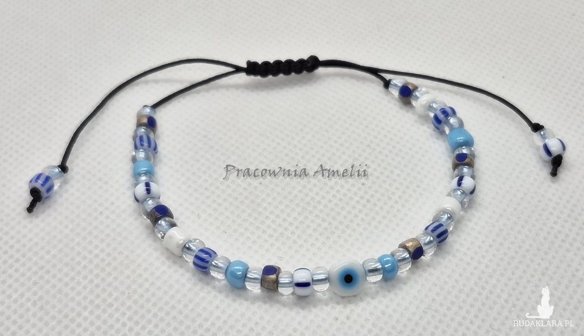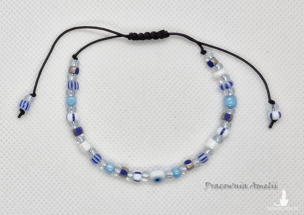 Bransoletka na czarnym sznurku nylonowym z dodatkiem szklanych koralików. Rozmiar uniwersalny.