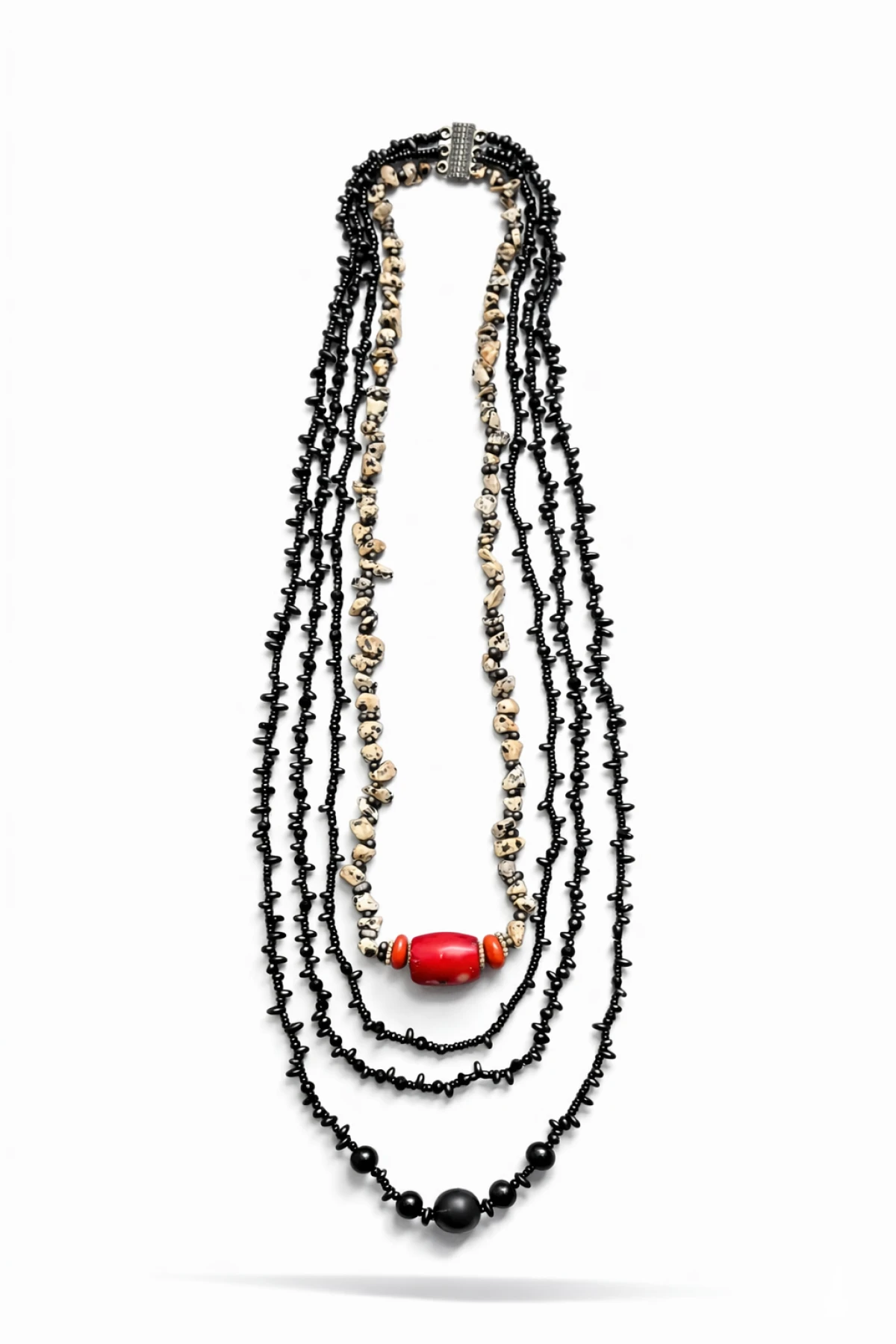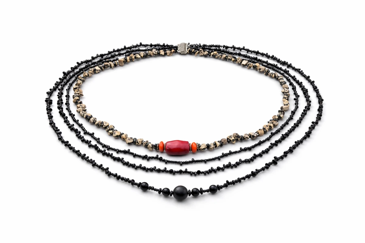 naszyjnik składający się z trzech sznurów czarnych koralików oraz