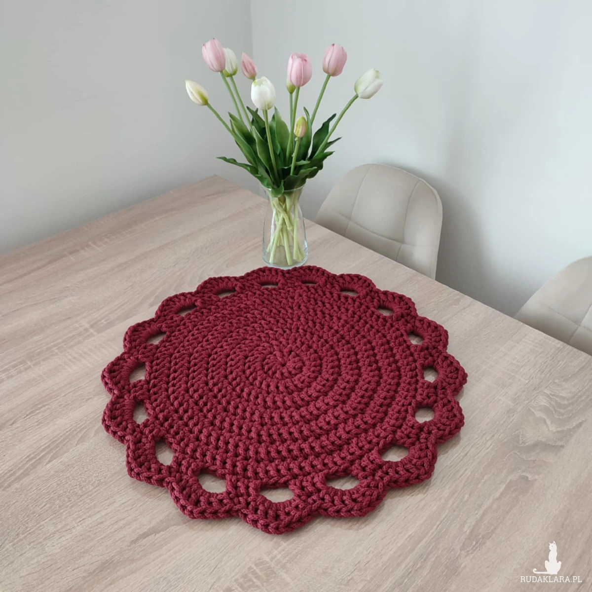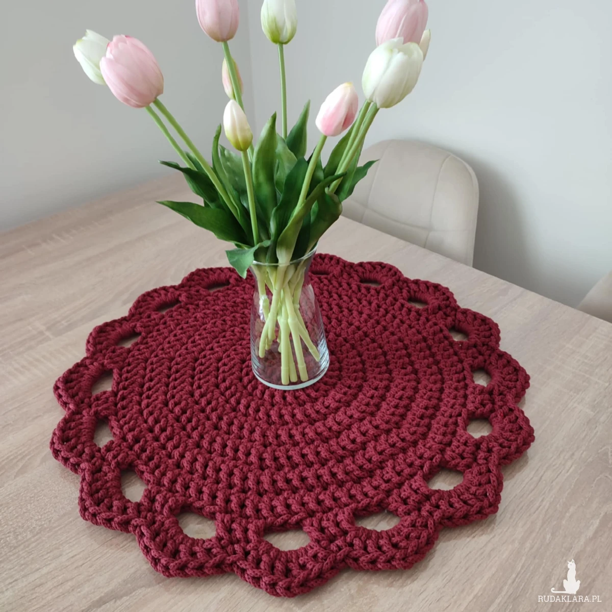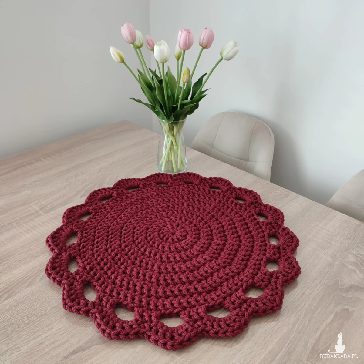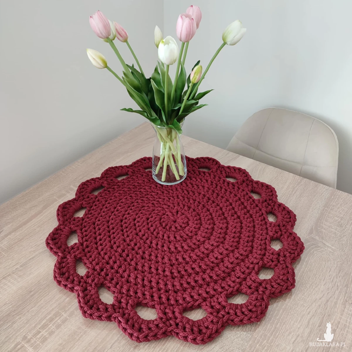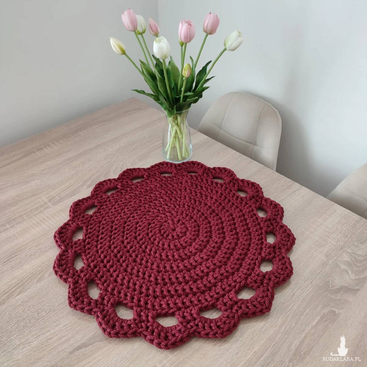 Podkładka o średnicy 50cm, wykonana metodą szydełkowania z polskiego sznurka bawełnianego 5mm.